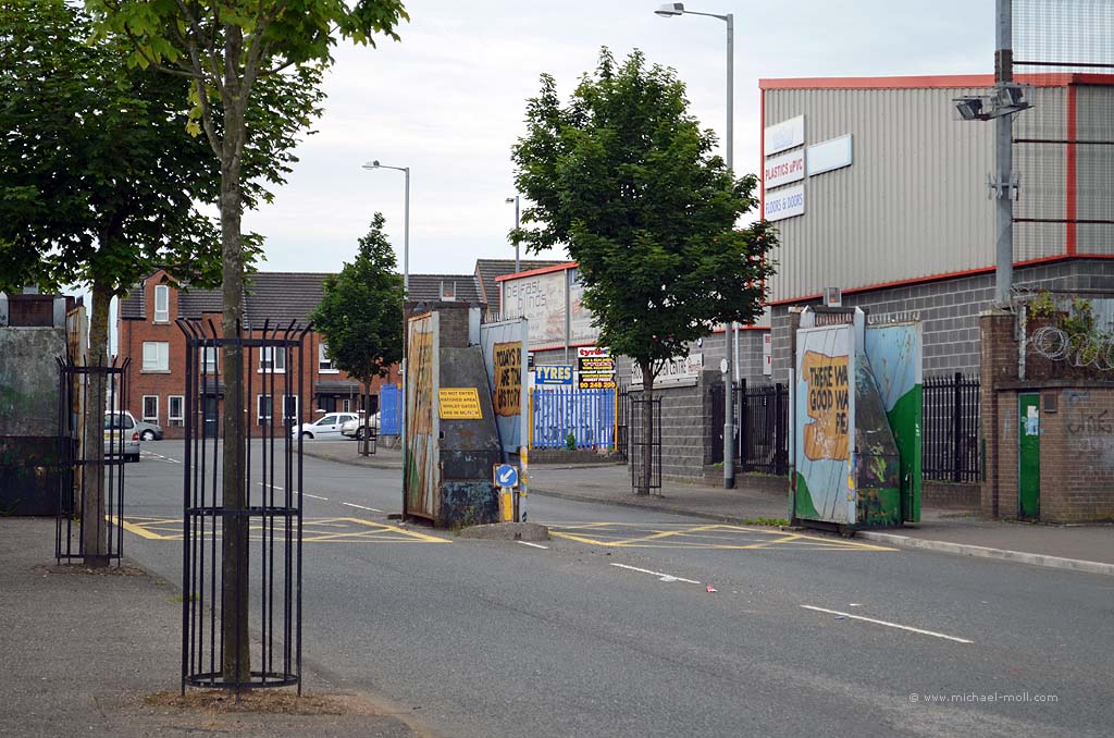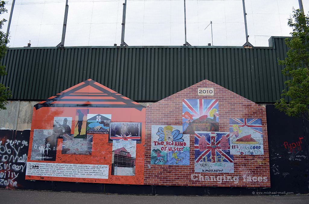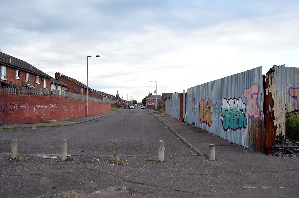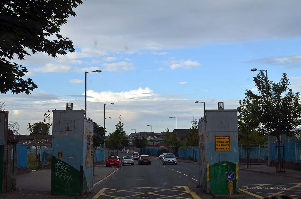 Man geht an der Mauer entlang und plötzlich hört sie nämlich auf. Dann guckt man um die Ecke, wechselt die Seite und geht auf der anderen Seite an der Mauer wieder zurück. Drei Straßen weiter findet sich dann wieder ein anderes Stück Mauer und teilt die dortige Nachbarschaft in zwei verfeindete Lager. Zwischendurch gibt es mal Tore, durch die man hindurch gehen oder fahren kann und es ist nicht ganz klar, ob die Tore auch mal geschlossen werden und wenn ja, wer das eigentlich macht. Als Außenstehender ist so vieles nicht zu verstehen. So weiß man zum Beispiel nicht eindeutig, auf welcher Seite der Peace Wall man eigentlich steht. Ist man nun bei den Katholiken oder bei den Protestanten? Vielleicht kann man es an den pro-irischen oder eben an den pro-britischen Graffiti erahnen. Aber die gibt es, ganz im Gegenteil zur Berliner Mauer, eben auf beiden Seiten.