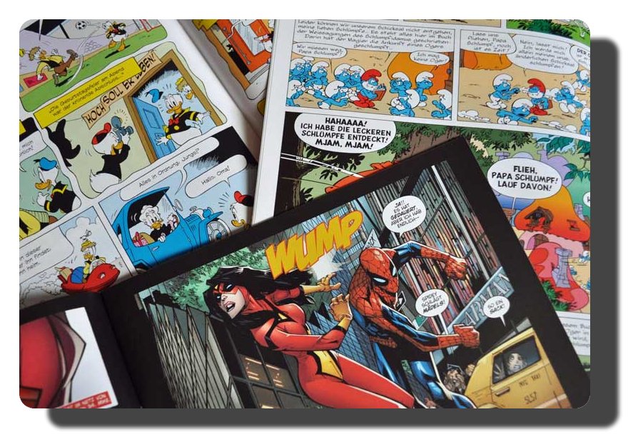Tja, das konnte und wollte ich mir nicht entgehen lassen. Ich bin kein Comicfreak und kenne mich mit den modernen Comics und Mangas überhaupt nicht aus, aber wenn ein mir wohlbekannter gelber Schnabel in mein Sichtfeld rückt, dann kann ich einfach nicht anders. Ich entschied mich für die drei Hefte zur Linken (Donald Duck, Die Schlümpfe und Spiderman).