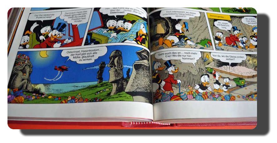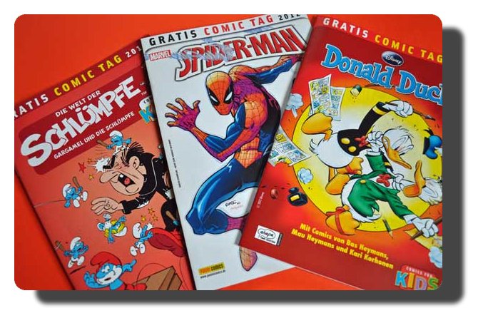 Übrigens, auf dem Foto ist die Familie Duck gerade auf dem Weg zu den Osterinseln im Pazifik. Da war ich noch nicht, möchte ich aber gerne noch nachholen. Das aber nur am Rande. In der letzten Woche las ich also abends wieder die Abenteuer der Helden aus meiner Jugend und stolpere dabei über einen Hinweis im Heft, dass am heutigen Samstag Gratiscomictag ist. Es gibt nicht nur eine Webseite, sondern auch die Aktion, dass heute in ausgewählten Buchhandlungen und Comicshops bis zu drei Hefte pro Person kostenlos verteilt werden.