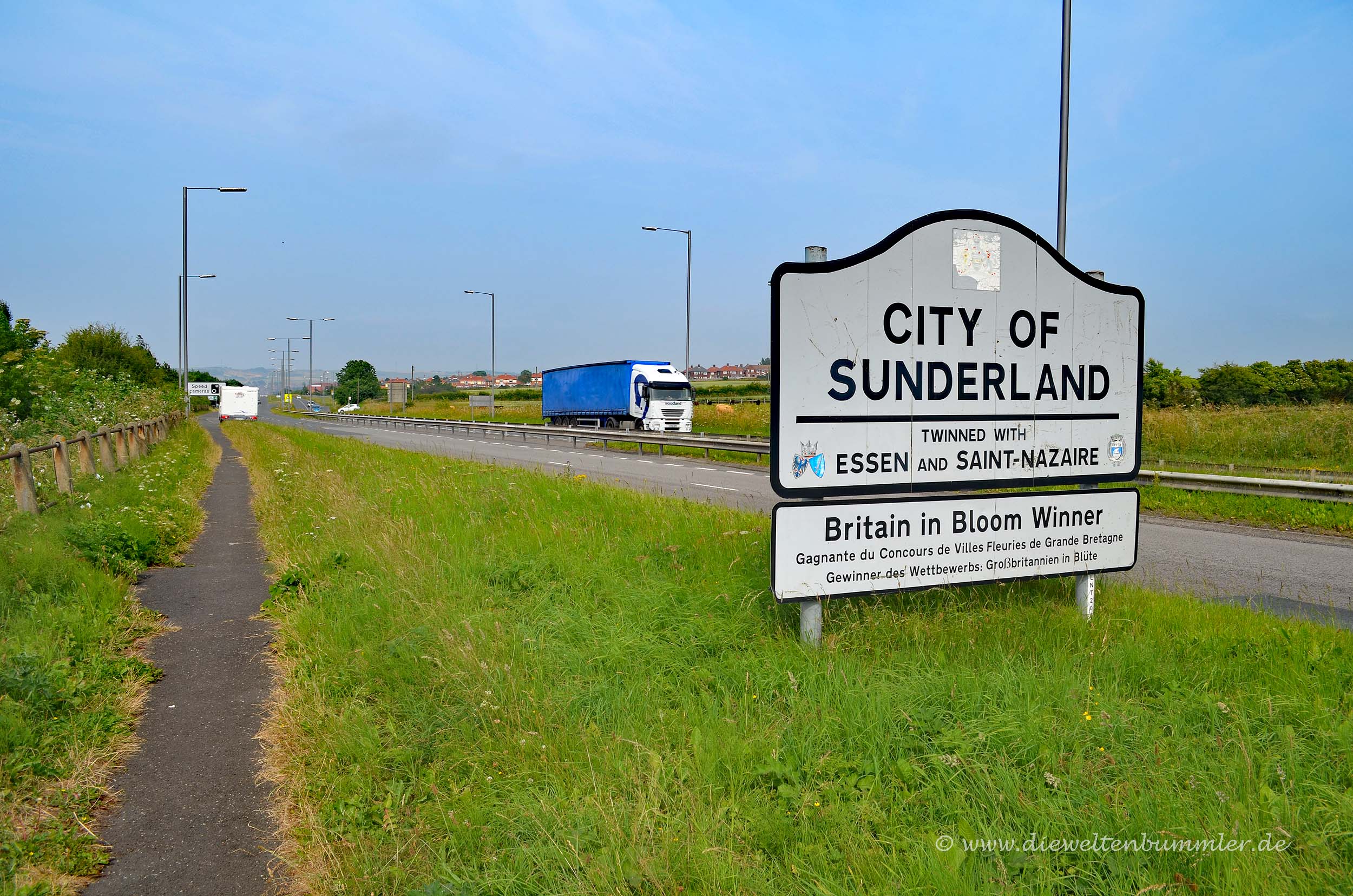 Ganz anders war es im Jahr darauf, als ich mit dem Wohnmobil durch England fuhr. Denn auch Sunderland ist Partnerstadt von Essen. Und siehe da: Am linken Fahrbahnrand einer breiten Zufahrtsstraße erscheint ein Ortseingangsschild mit dem Hinweis auf die Partnerstadt zwischen Sunderland und Essen.