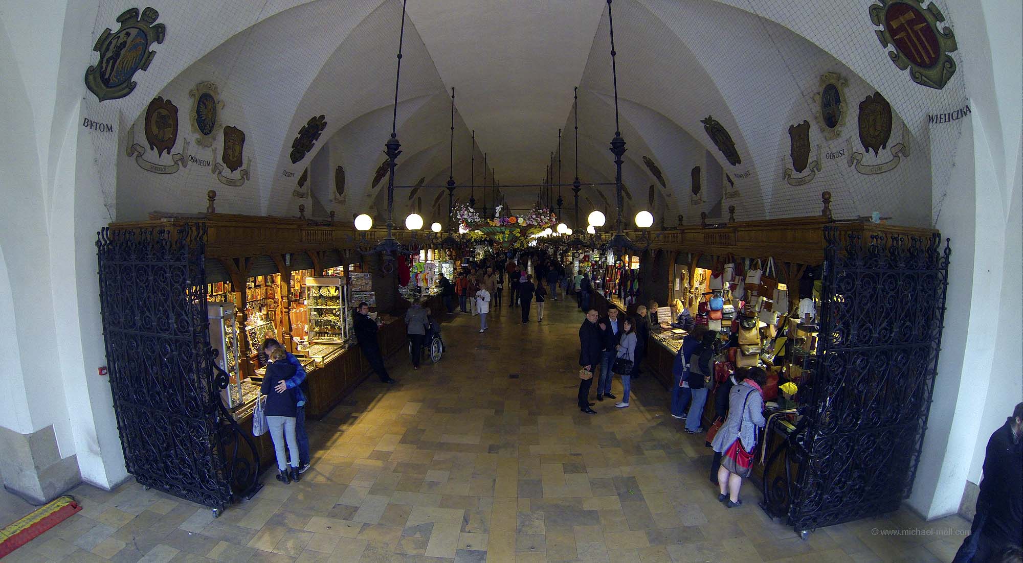 Der Rathausturm gibt sich aber noch bescheiden im Gegensatz zu Sukiennice, den Tuchhallen, die mitten auf dem Rynek stehen. Man könnte fast sagen, dass die Tuchhallen ein mittelalterliches Einkaufszentrum sind, wo einstmals gefeilscht und gekauft wurde. Heute findet man in den vielen kleinen Läden polnisches Kunsthandwerk und Souvenire, während an den Wänden die Wappen zahlreicher polnischer Städte prangen, die an die ehemalige Bedeutung der Tuchhallen erinnern. Auf der anderen Seite von Sukiennice erhebt sich das Denkmal zu Ehren des polnischen Nationaldichters Adam Mickiewicz.
