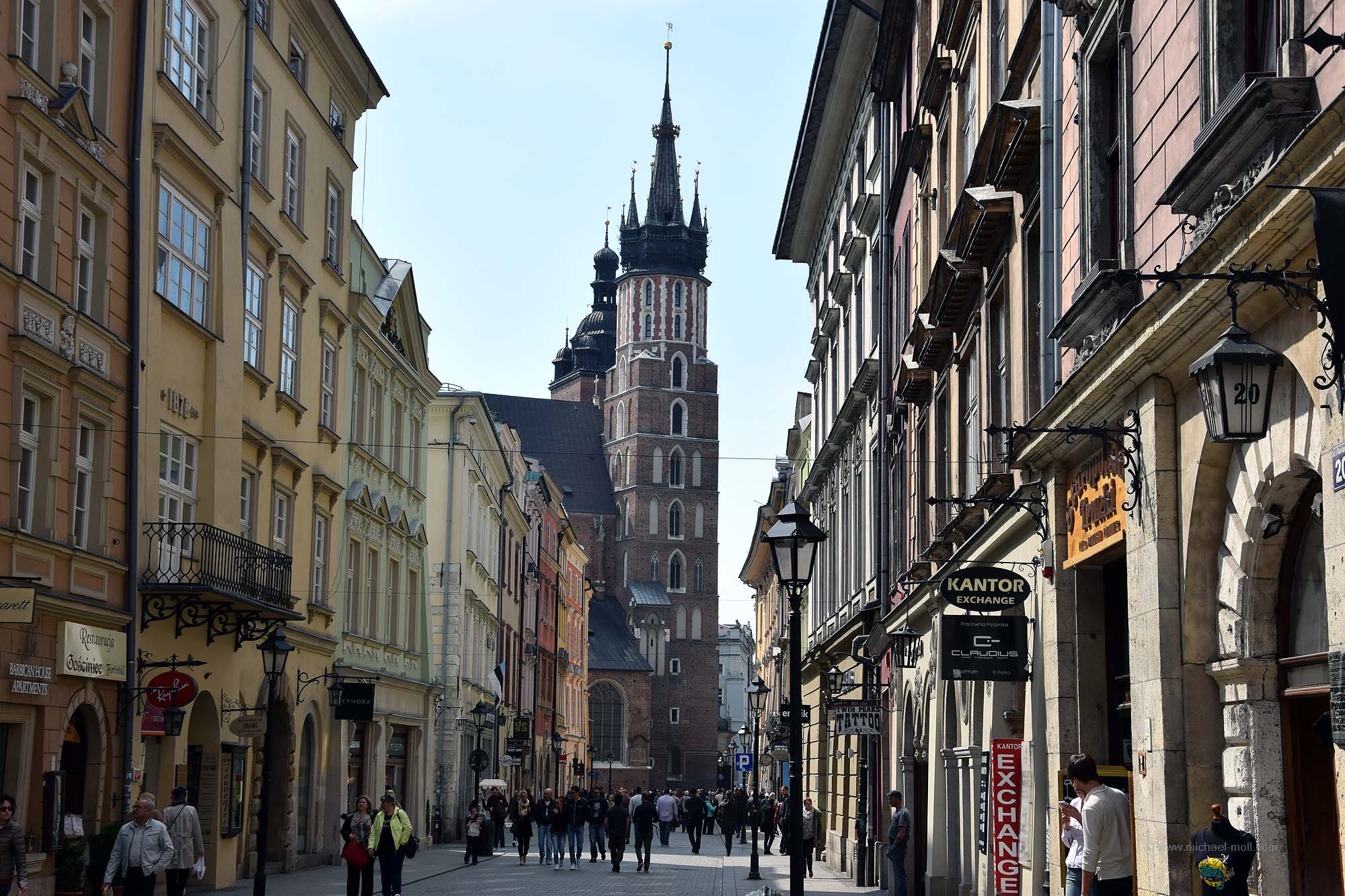 Das dritte Gebäude am Rynek ist die Marienkirche mit ihren zwei unterschiedlich hohen Türmen. Auch wenn man sich möglicherweise nicht für sakrale Bauten und Kunst interessiert, sollte man sich zur vollen Stunde zur Marienkirche begeben. Denn am Nordturm öffnet sich ein kleines Fenster, in dem plötzlich eine Trompete zu erkennen ist. Drei Mal hintereinander wird dann der Hejnał gespielt. Der aufmerksame Hörer wird aber bemerken, dass der Trompeter immer an der selben Stelle das Signal abrupt abbricht. Das ist auf die Geschichte zurückzuführen, dass der Hejnał als Alarmsignal beim Angriff vor den Tataren trompetet wurde und der Trompeter tragischerweise mitten in der Fanfare von einem Pfeil getroffen wurde. Eben daran erinnert noch heute das plötzliche Ende des Signals.