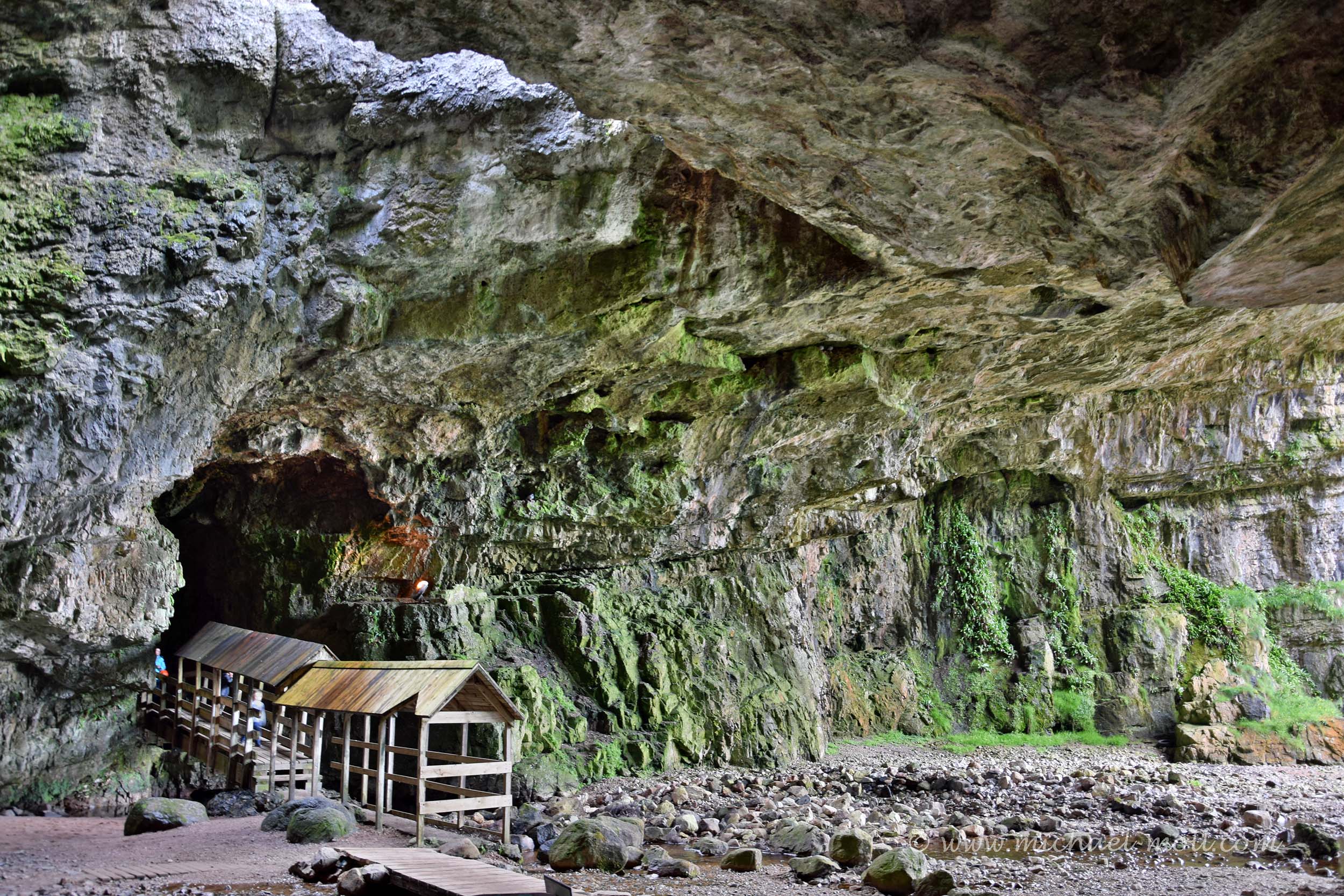 Betritt man die Höhle durch ihren rund 15 Meter hohen Eingang, so steht man in einem riesigen steinernen Saal, durch den ein kleiner Bach seinen Weg findet. Den Bach überquert man auf einer Holzbrücke, die kurioserweise überdacht ist. Wer baut in einer Höhle schon eine überdachte Brücke? Doch oberhalb der Brücke befindet sich ein Loch in der Höhlendecke.