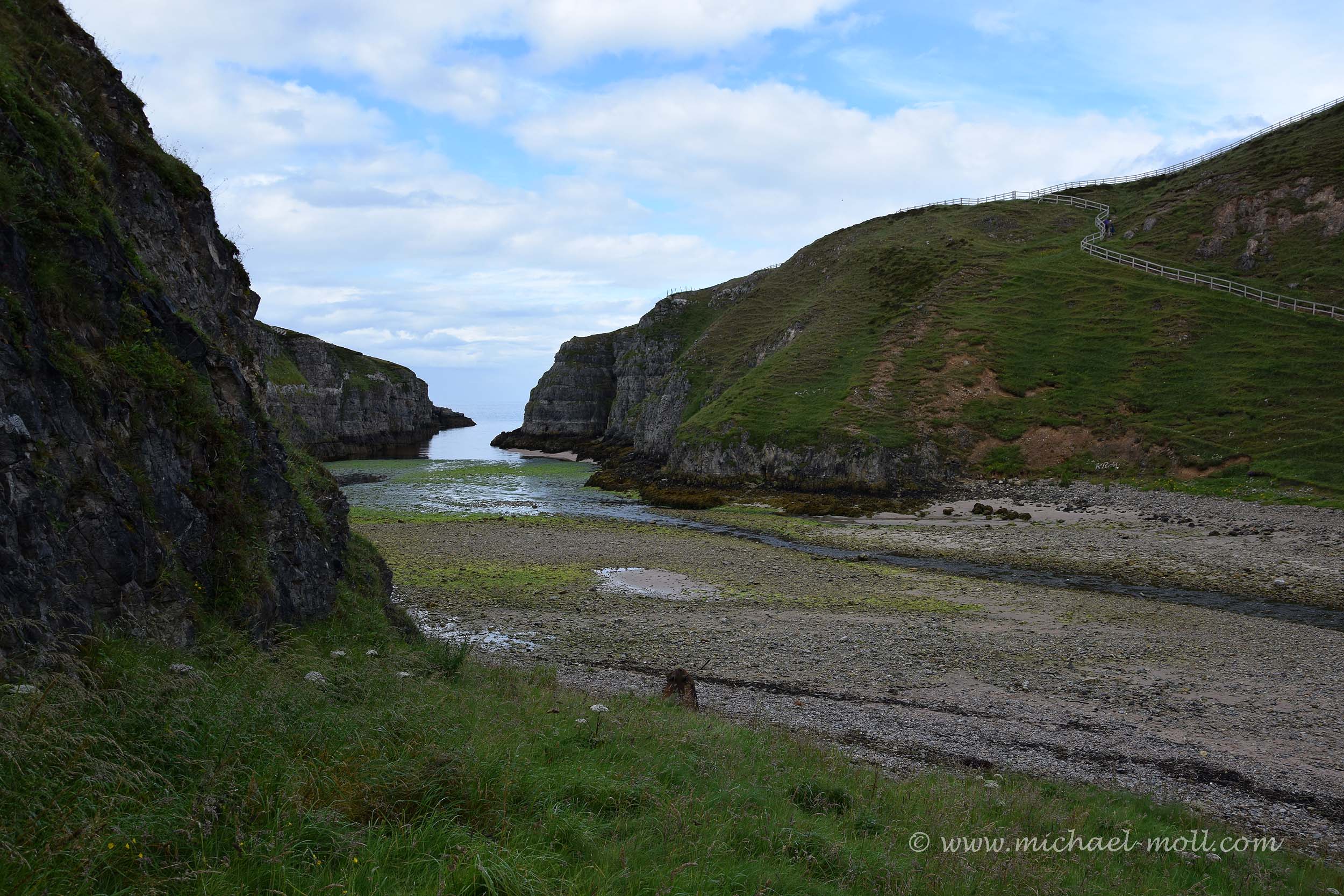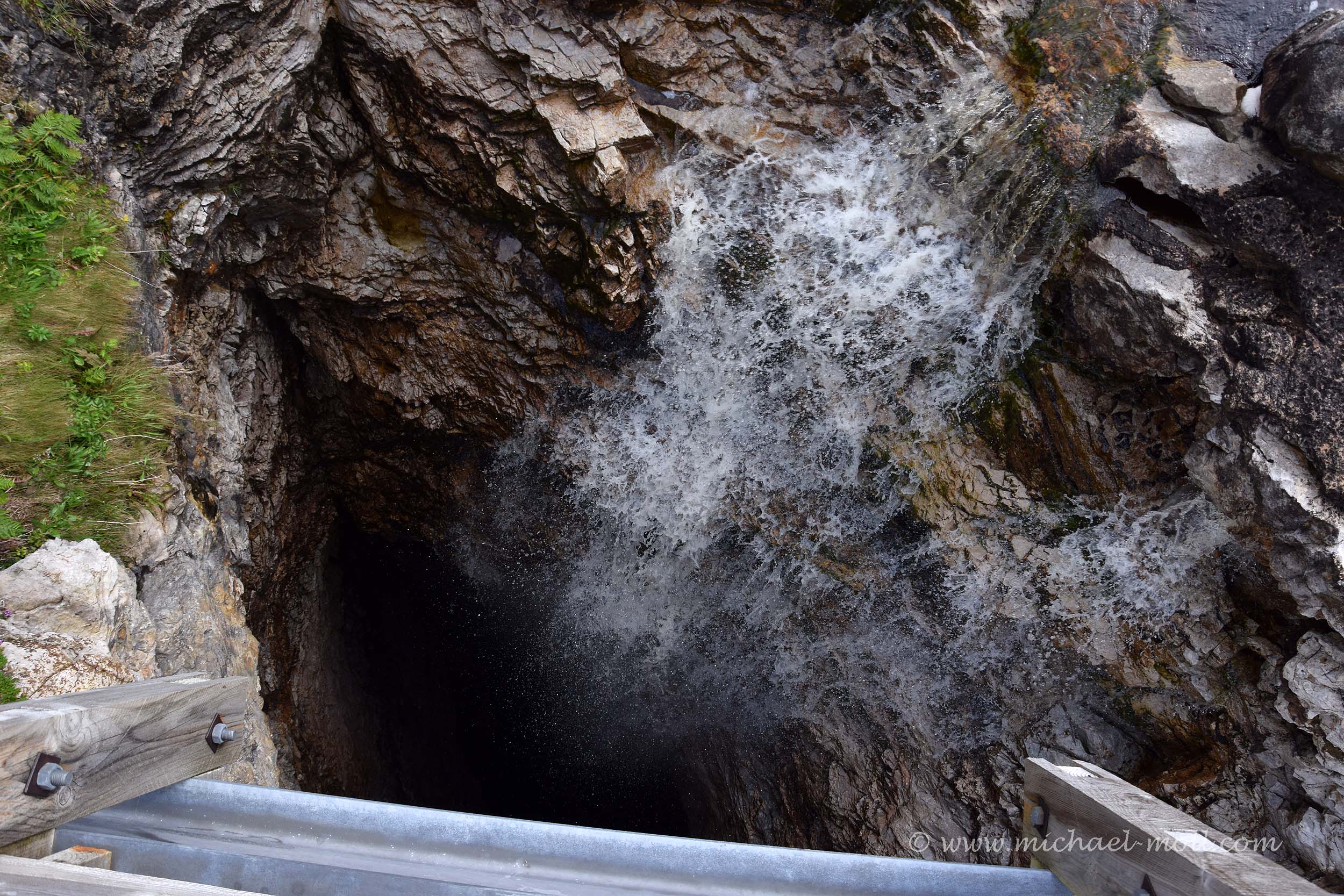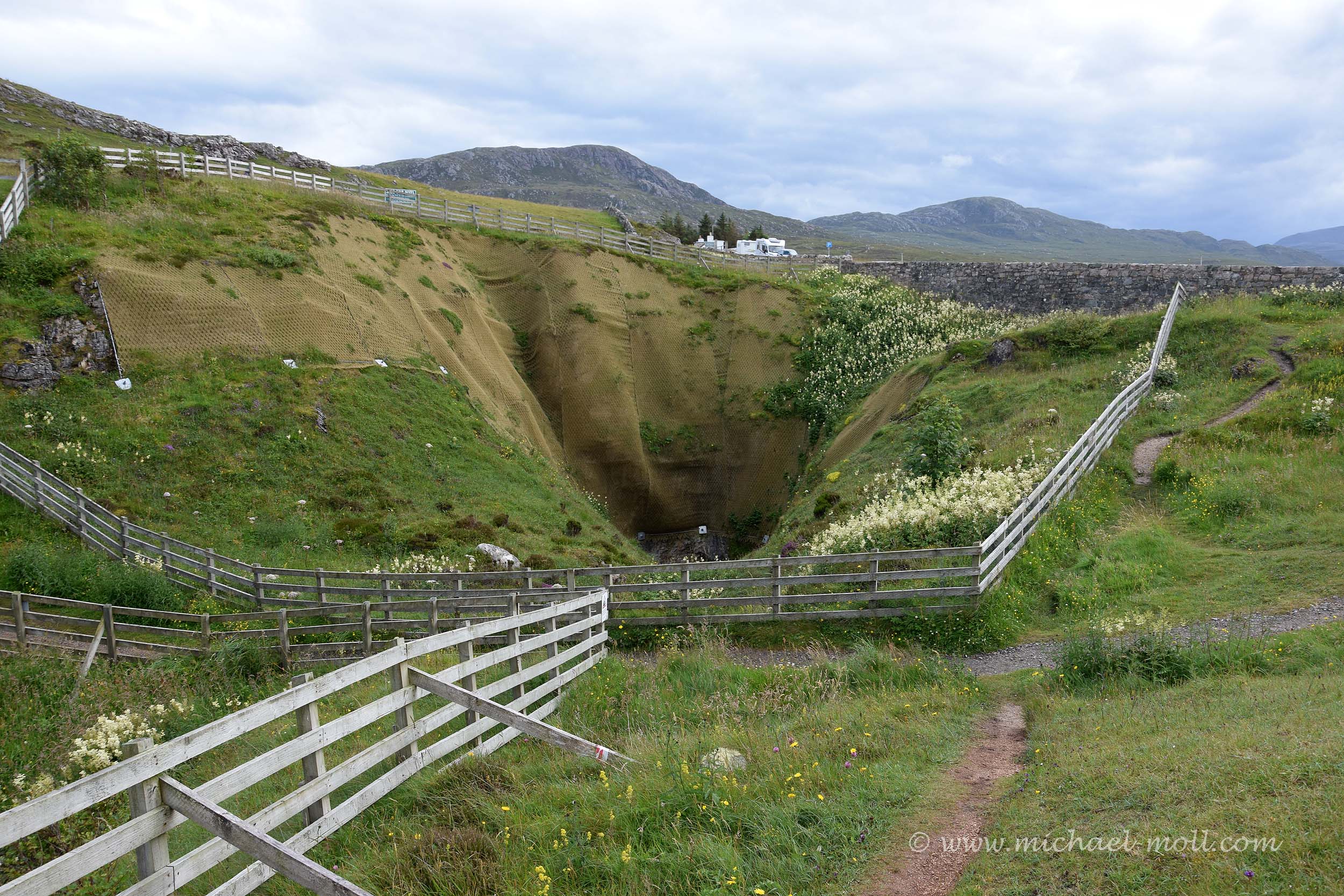 Das sieht man am besten, wenn man die Höhle wieder verlässt und sich in Richtung Straße zurück begibt. Denn auf der anderen Straßenseite fließt ebenfalls ein Bach. Sein Wasser verschwindet aber plätschernd durch ein Loch im Erdreich. Die Lösung liegt auf der Hand: Der Bach heißt Allt Smoo und fällt von oben durch ein weiteres Loch in der Höhlendecke hinab in die Smoo Cave, was die Höhle in Großbritannien einzigartig macht. Streng genommen kann man diese Höhle also sowohl von innen als auch von außen besichtigen, denn neben der Straße kann man natürlich in die beiden Löcher in der Höhlendecke hineinblicken.