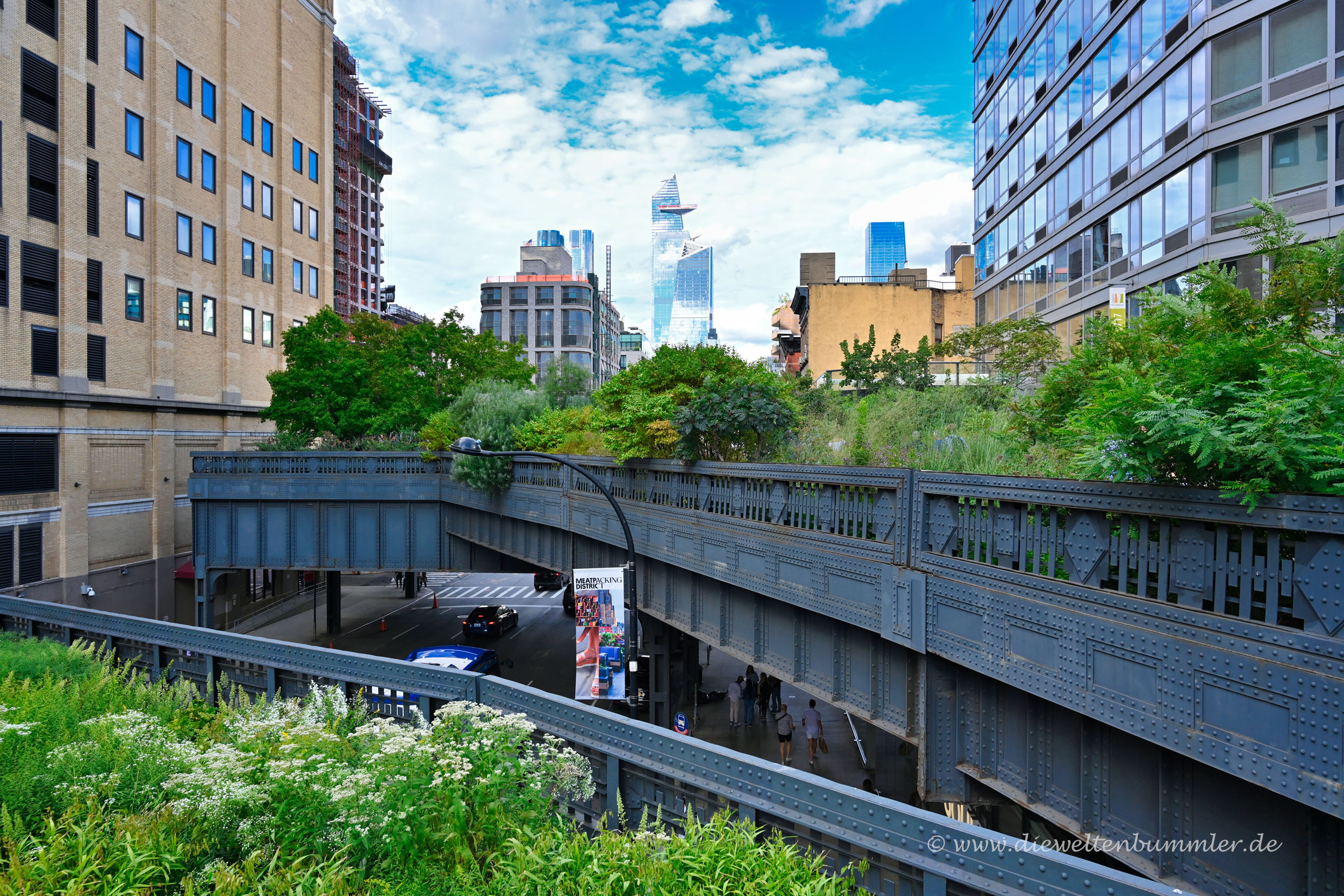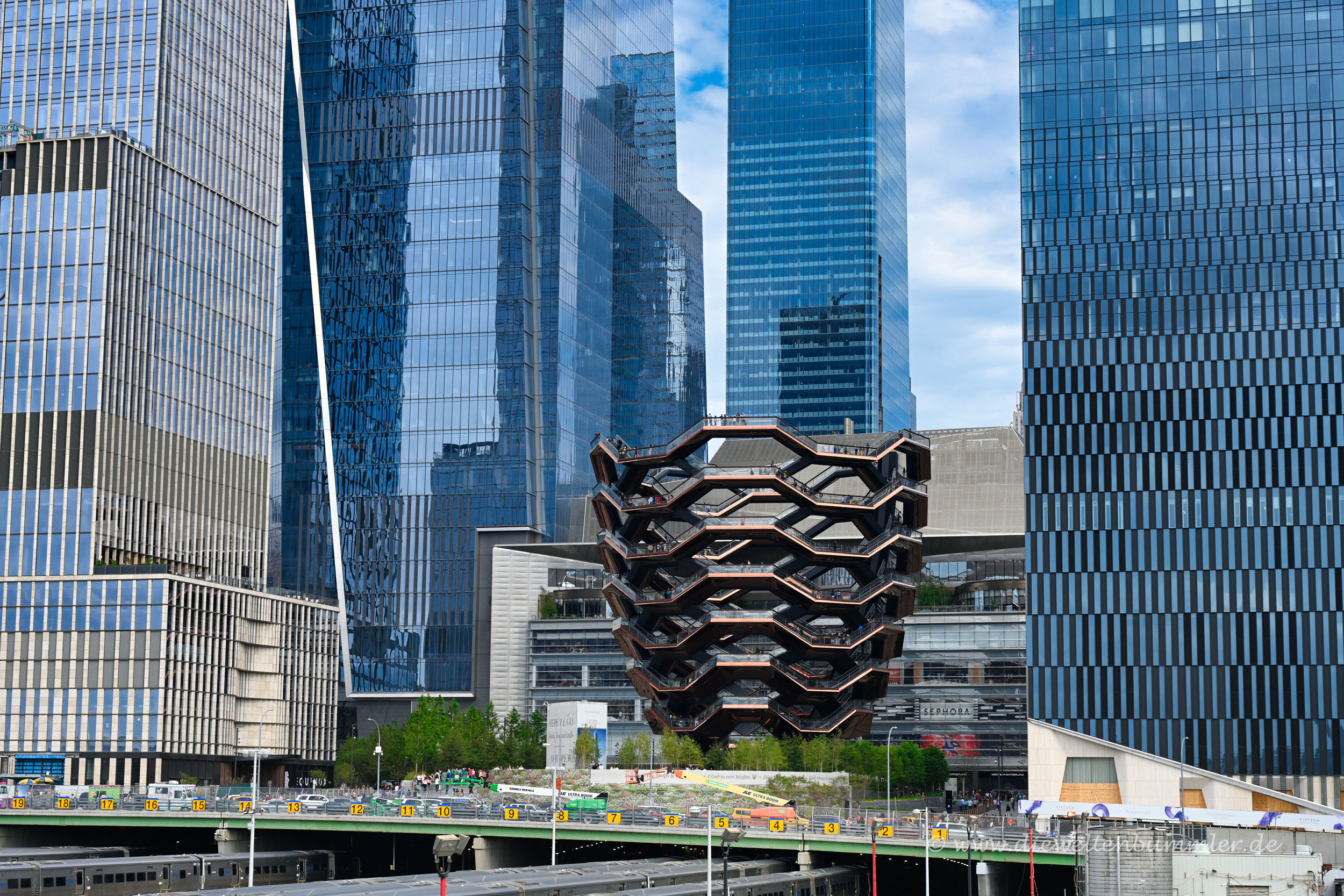 Im Norden endet die Highline im relativ jungen Viertel Hudson Yard. Relativ neue Hochhäuser dominieren das Viertel. Dazu gehört zum Beispiel das Gebäude mit der Aussichtsplattform The Edge. Zwischen den Hochhäusern erhebt sich außerdem der vasenförmige Aussichtsturm Vessel, von dem ich vor kurzem schon einige Bilder zeigte.