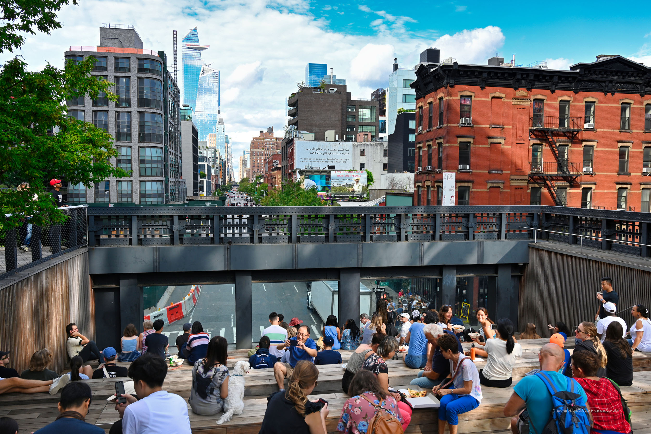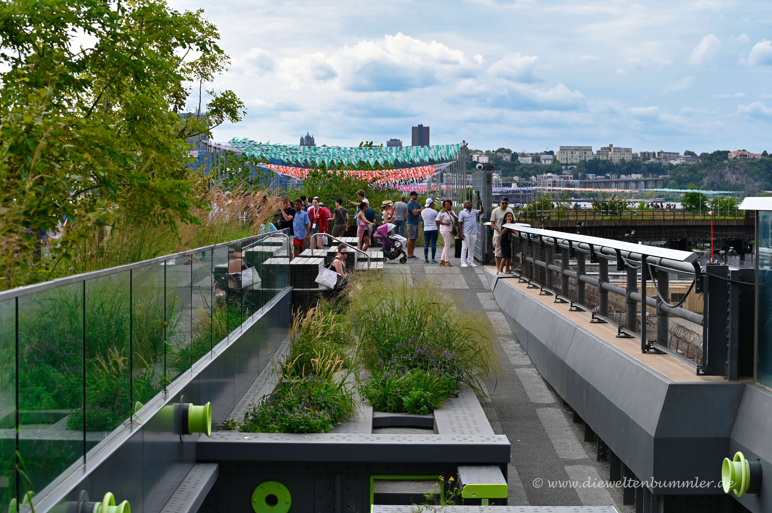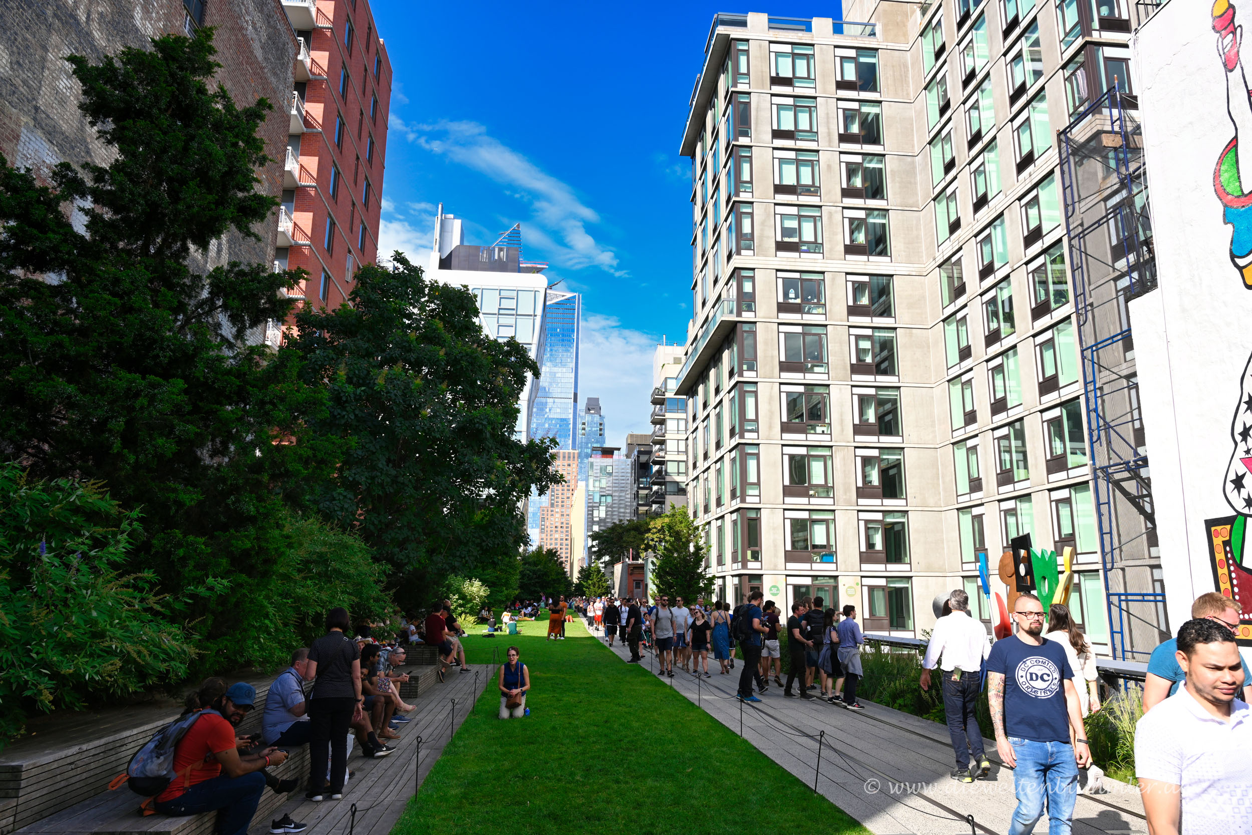 Dabei spazierte ich zwischen den Wolkenkratzern und war definitiv nicht alleine. Die Highline in New York ist wahrlich gut besucht. Der Weg ist ungefähr zwei bis drei Meter breit. Das ist also nicht sehr breit. Die gesamte Anlage ist dafür aber deutlich breiter. Denn die Highline besteht nicht nur aus einem Spazierpfad, sondern ist eigentlich als Grünanlage konzipiert.