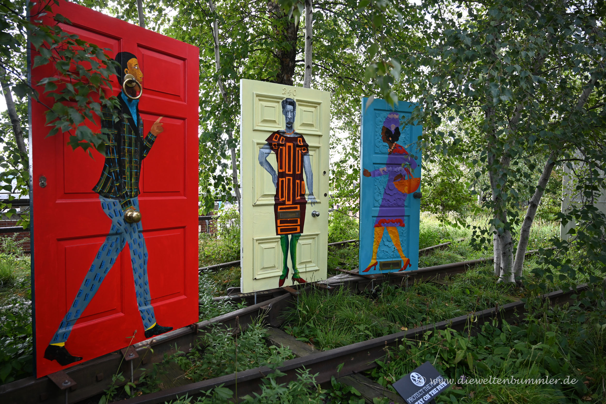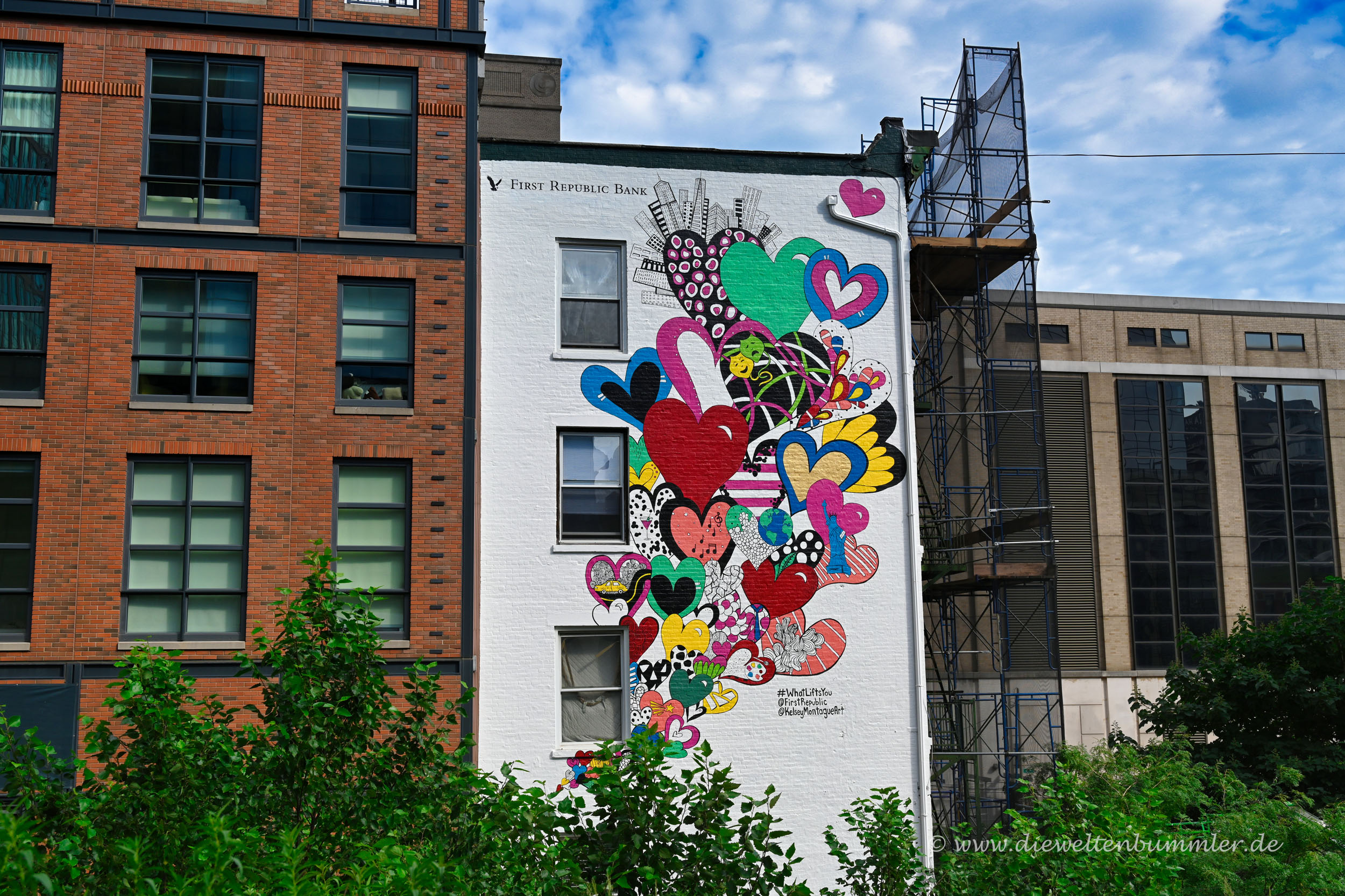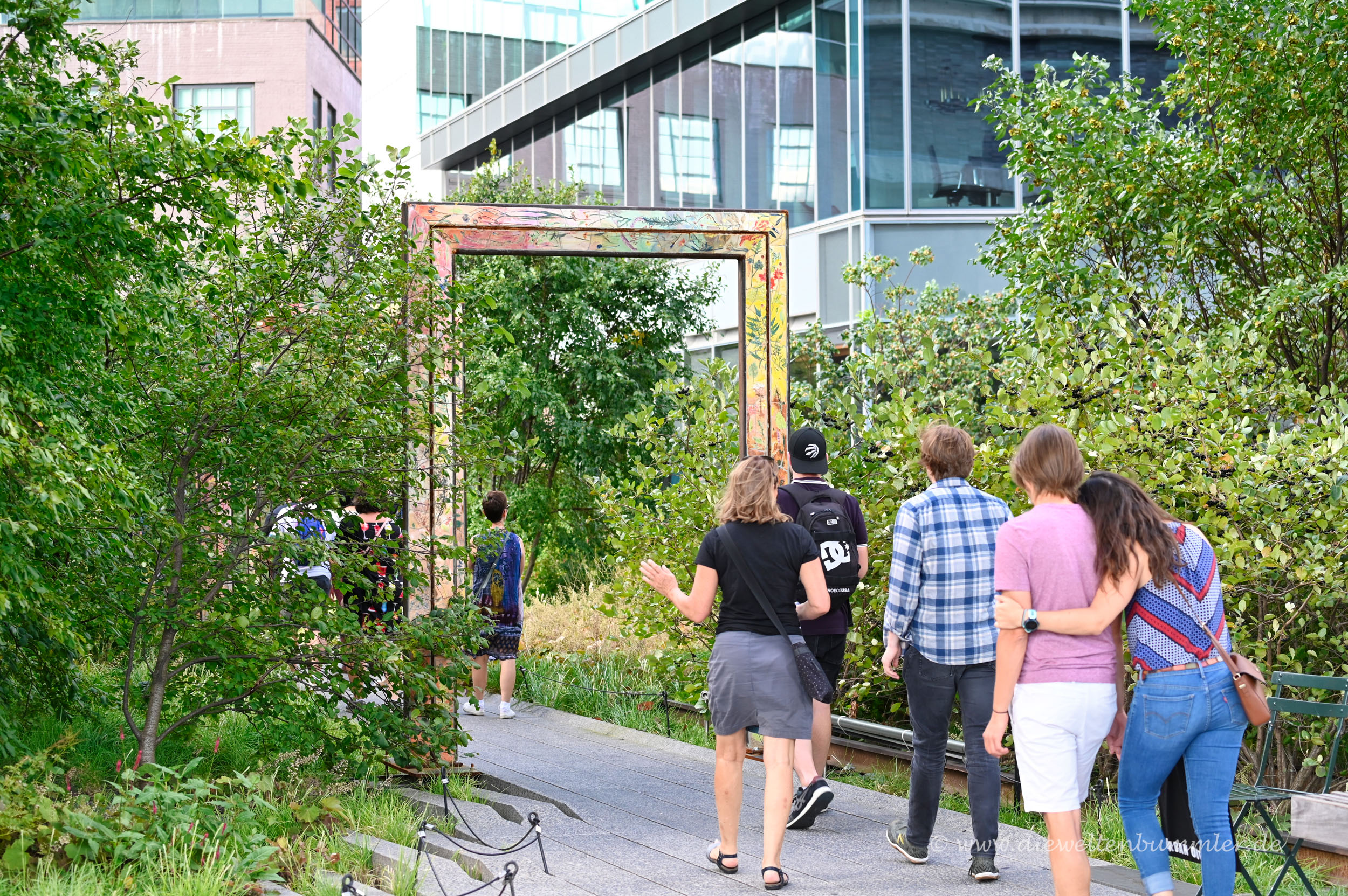 Es heißt, rund um die Highline in New York haben sich verschiedene kreative Firmen und Künstler angesiedelt. Das mag ich gerne glauben, denn manche der Hauswände rechts und links der Trasse sind farbenfroh gestaltet bzw. mit künstlerischen Motiven verziert. Auch auf der Highline selber findet man immer wieder mal kleinere oder größere Kunstwerke.