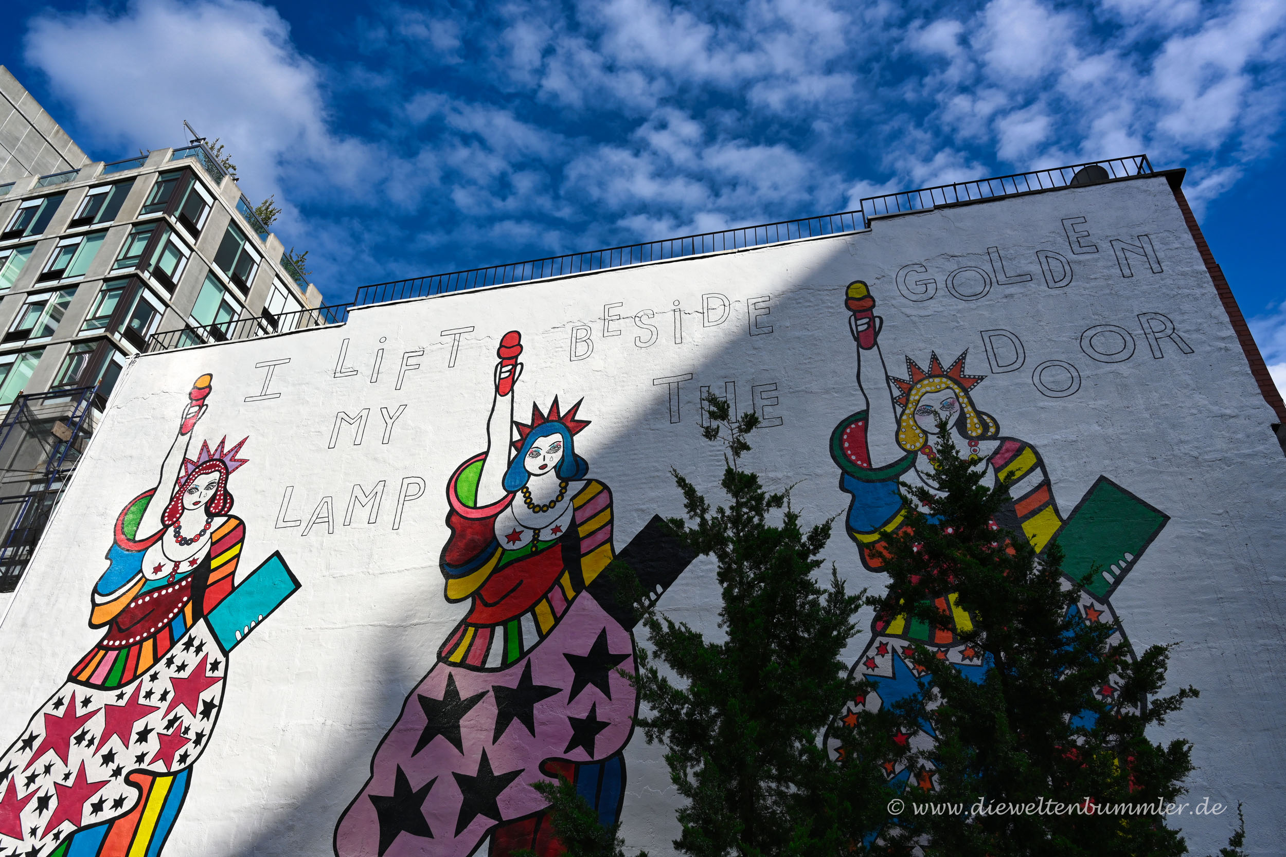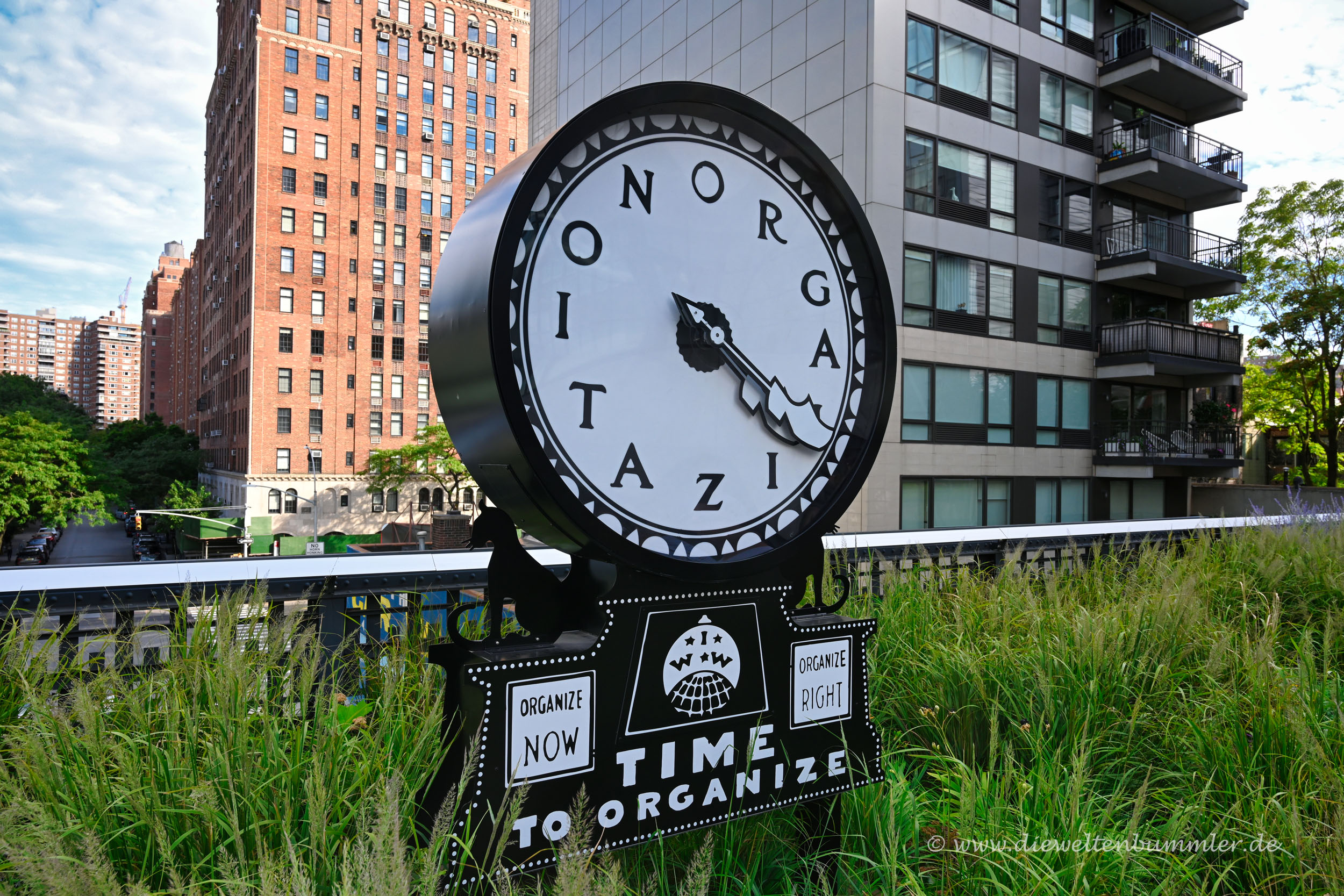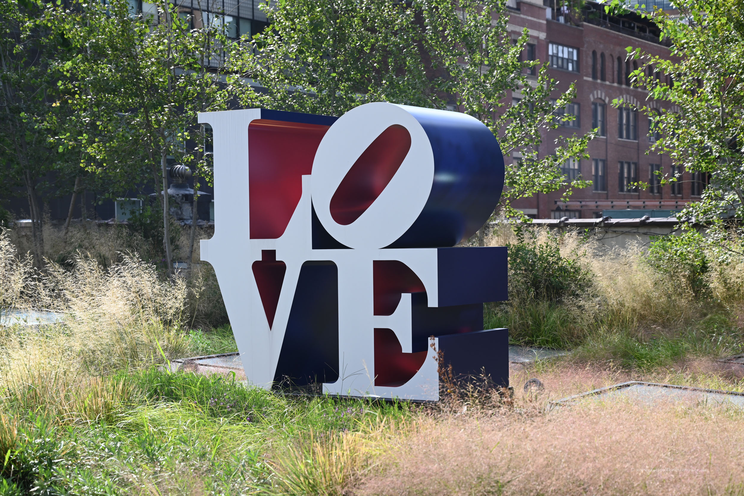Es heißt, rund um die Highline in New York haben sich verschiedene kreative Firmen und Künstler angesiedelt. Das mag ich gerne glauben, denn manche der Hauswände rechts und links der Trasse sind farbenfroh gestaltet bzw. mit künstlerischen Motiven verziert. Auch auf der Highline selber findet man immer wieder mal kleinere oder größere Kunstwerke.