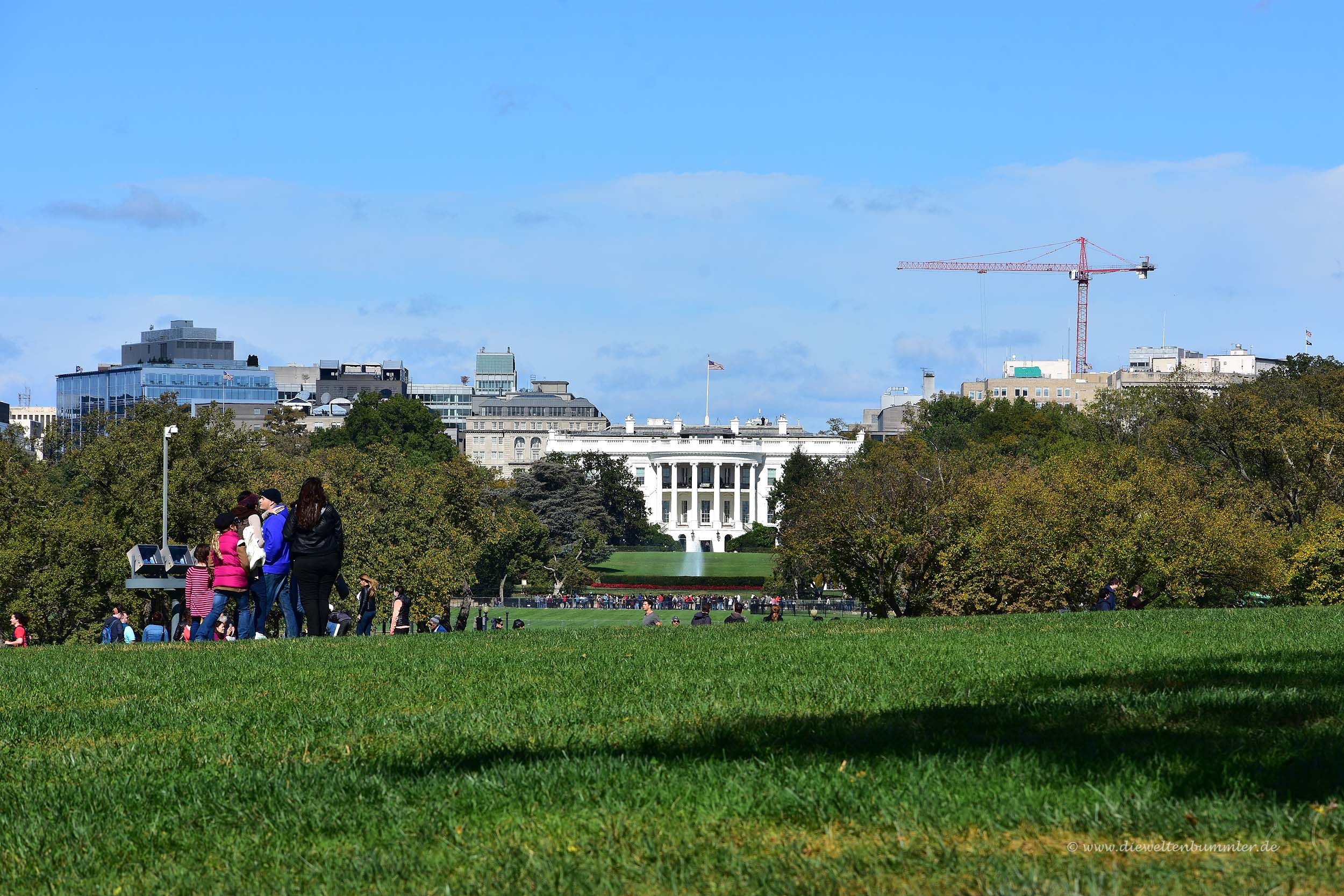 Von dem Hügel mit dem Obelisken kann man natürlich wunderbar in alle Richtungen schauen. Nach Westen geht der Blick zurück über den Pool zum Lincoln-Memorial, nach Osten wartet immer noch das Kapitol und nach Norden erblickt man das Weiße Haus.