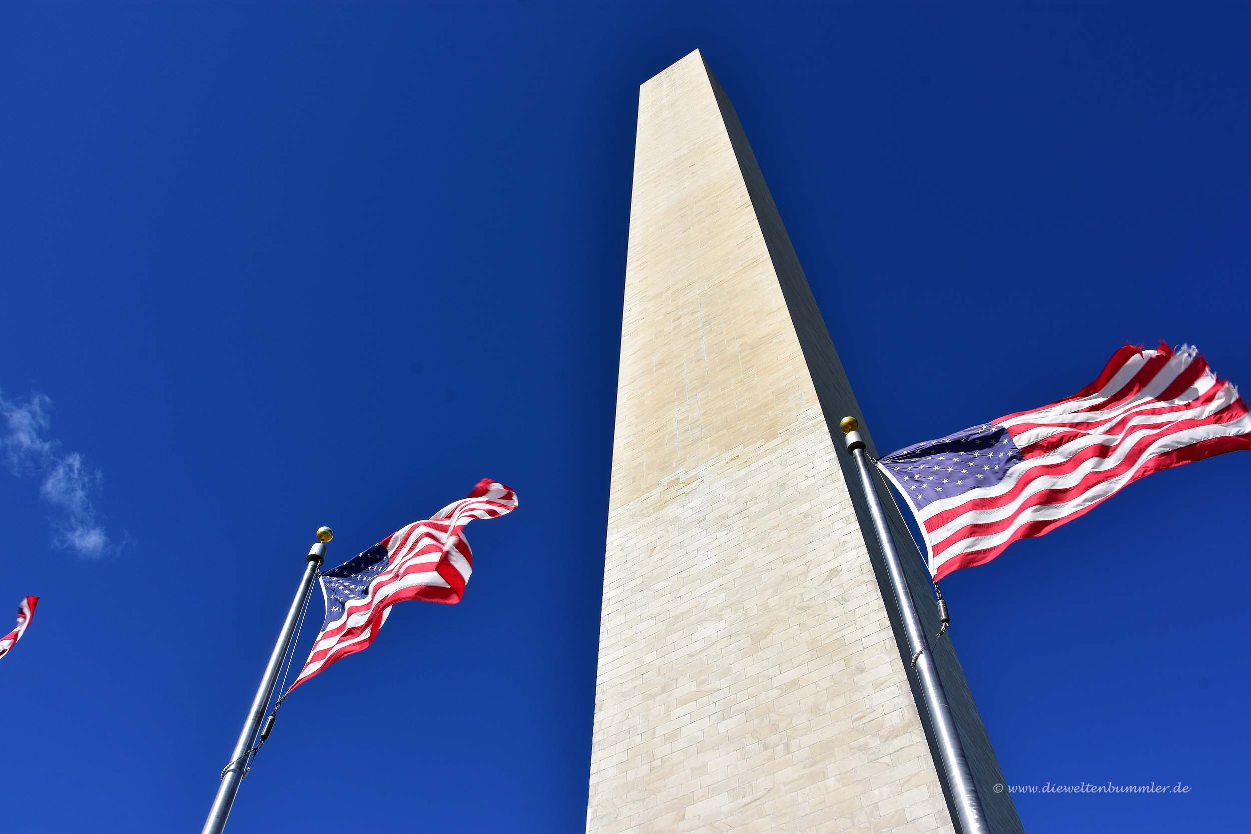 Gleich daneben erhebt sich ein Grashügel, auf dem das Washington Monument steht. Es befindet sich nicht exakt auf der Hälfte zwischen Abraham Lincoln und dem Kapitol, sondern schon nach einem guten Drittel der Strecke. Das Monument ist von zahlreichen Flaggenmasten umgeben, an denen natürlich die US-Flagge wehen.