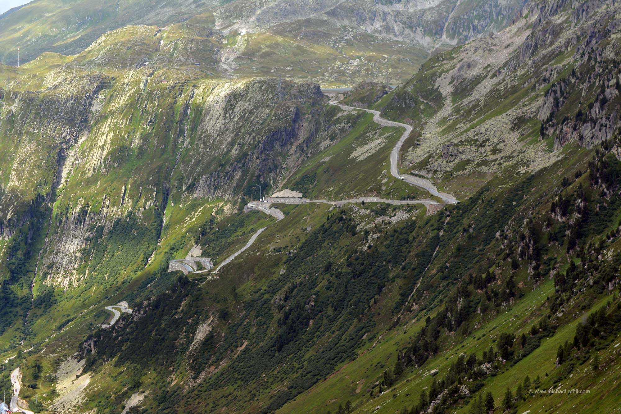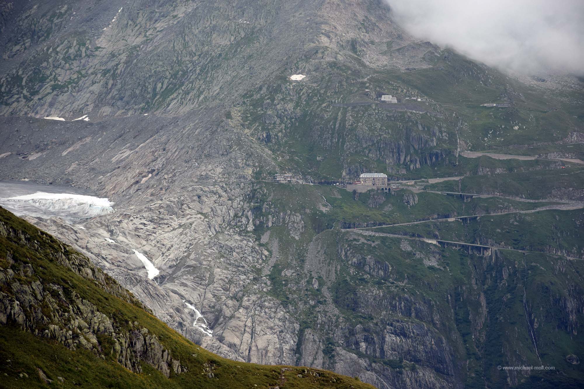 Die Südseite ist komplett anders. Denn sie geht steil und kurz hinab. Auf ihr überwindet man in sieben Spitzkehren 400 Höhenmeter. Dann hat man die Ortschaft Gletsch erreicht, wo es entweder nach links direkt auf den Furkapass geht oder nach rechts weiter bergab durch das Rhône-Tal. Vier Spitzkehren folgen noch und dann weitet sich das Tal so langsam und es geht stetig, aber nicht mehr steil bergab.