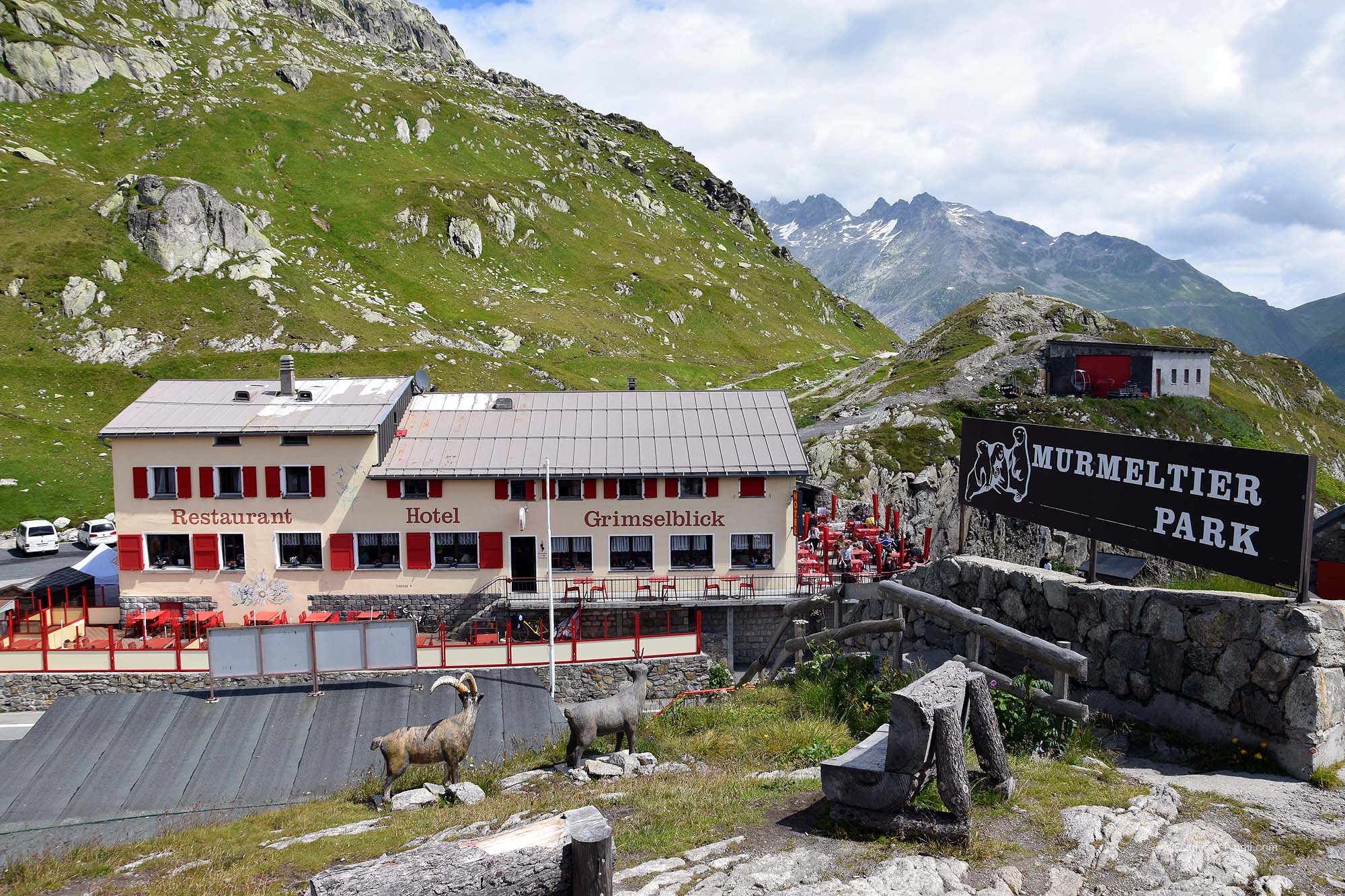 Drei Hotels befinden sich am Pass sowie der erwähnte Abzweig zum Oberaarsee. Wandermöglichkeiten dürften es deutlich mehr sein, ich hatte leider nicht die Gelegenheit hier eine Wanderung zu machen. Die Aussicht in Richtung Norden ist nett aber ein wenig eingeschränkt. Die Sicht nach Süden ist jedoch interessant. Man blickt gleich hinab in den Ort Gletsch und sieht fast gegenüber die Furkastraße, die sich zum gleichnamigen Pass hochwindet. Ungefähr auf der Hälfte erkennt man ein Gebäude, bei dem Zugang zum Rhône-Gletscher hat. Dazu aber später mehr in der Beschreibung des Furkapasses. Außerdem befindet sich gegenüber dem Hotel Grimselblick der dazugehörige kostenlose Murmeltierpark. Vielleicht ist es übertrieben, von Park zu reden und ob die Murmeltiere dort wirklich eingesperrt sein müssen, wage ich auch zu bezweifeln. Aber wer noch keine Murmeltiere gesehen hat, was in dieser Höhenlage eher ungewöhnlich ist, der wird dort mit etwas Geduld auf die Tiere treffen.