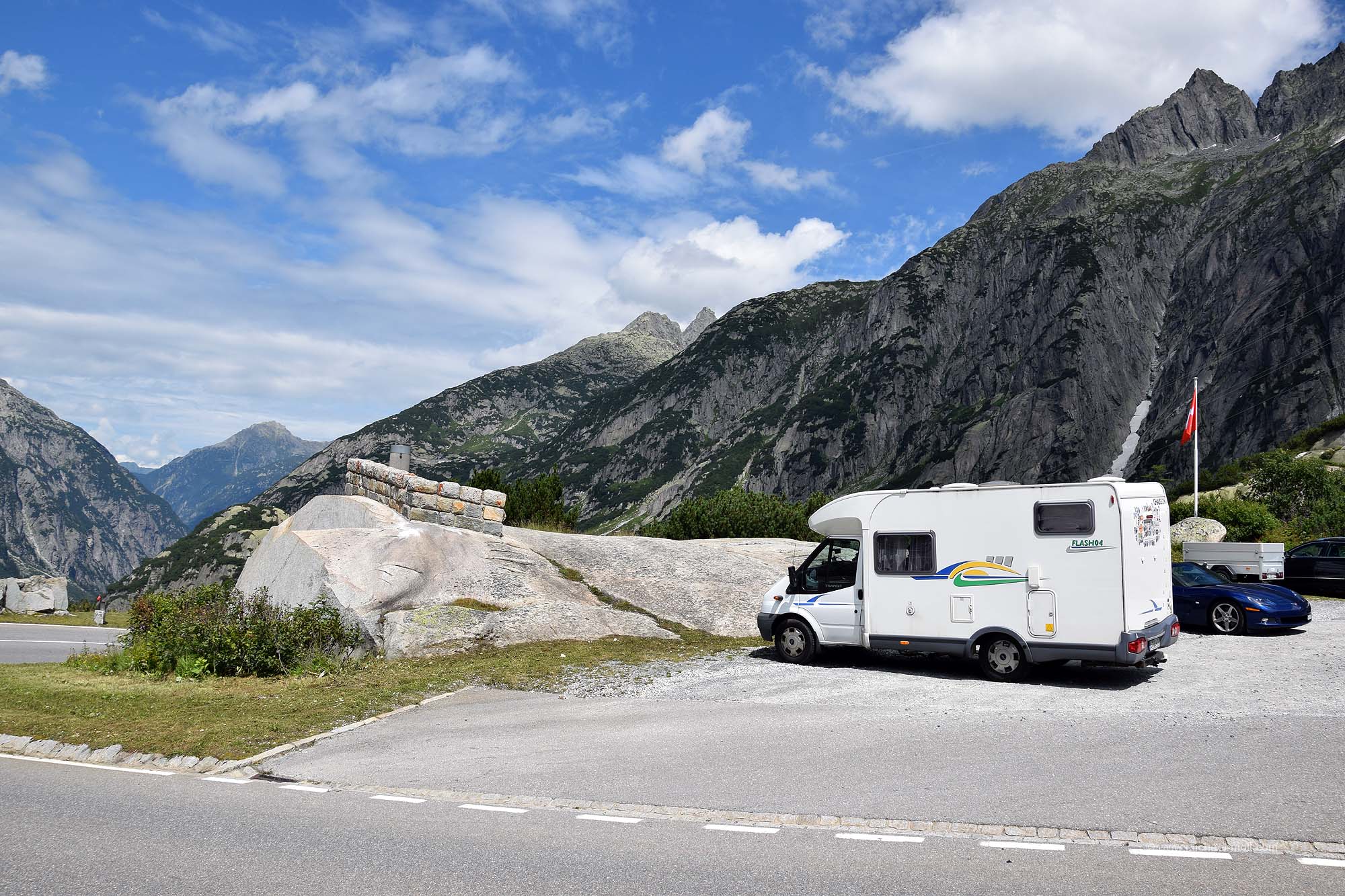 Freies Stehen ist an den Parkplätzen sicherlich gut möglich. Das habe ich nicht getestet, denn es war nicht erforderlich. Direkt an der Passhöhe befindet sich das Hotel Grimselblick und das hält einen kleinen Wohnmobilstellplatz bereit. Im Grunde handelt es sich nur um einen Schotterparkplatz, doch dieser ist durch eine Felswand von der Straße abgetrennt und daher in der Nacht absolut ruhig. Das Hotel erwartet dafür 10 Franken, was ich als günstig bezeichnen würde. Darin enthalten ist die Nutzung der Toiletten des Hotels, zumindest solange sie geöffnet haben. Für weitere fünf Franken kann man auch die Duschen nutzen. Unweit von der Passhöhe befindet sich auch noch die ampelgeregelte Panoramastraße zum Oberaarsee, wo man wohl auch auf einer Höhe von über 2.300 Metern übernachten kann und darf. Muss ich beim nächsten Mal ausprobieren.
