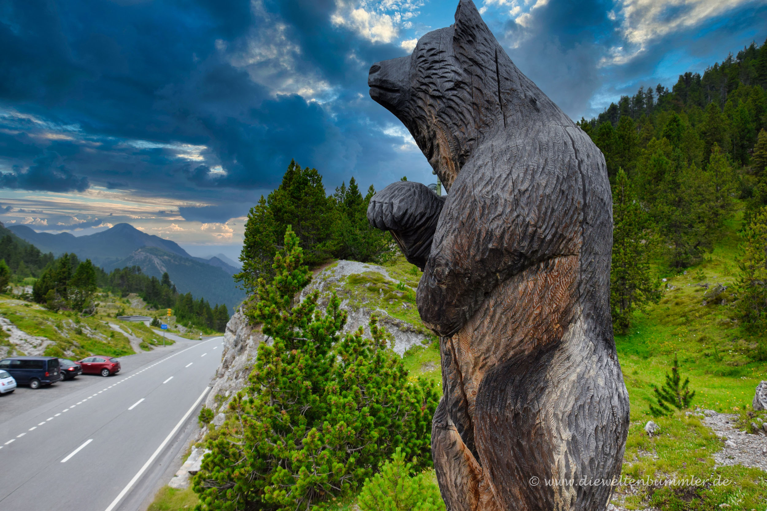 Gegenüber, auf der anderen Straßenseite, erhebt sich eine hölzerne Bärenskulptur. Erinnerte mich ein wenig an die Bärenskulptur im Langass Woodland auf den Äußeren Hebriden. Sowohl dort in Schottland als auch hier am Ofenpass erinnert diese Skulptur tatsächlich an einen lebenden Bären. Es war JJ2, der hier im Jahr 2005 gesichtet wurde. Sein Bruder ist deutlich bekannter und wurde in der Presse als Bruno, der Problembär bezeichnet. Sein Leben wurde in Bayern tragischerweise beendet. Was aus JJ2 geworden ist, ist dahingegen unbekannt.