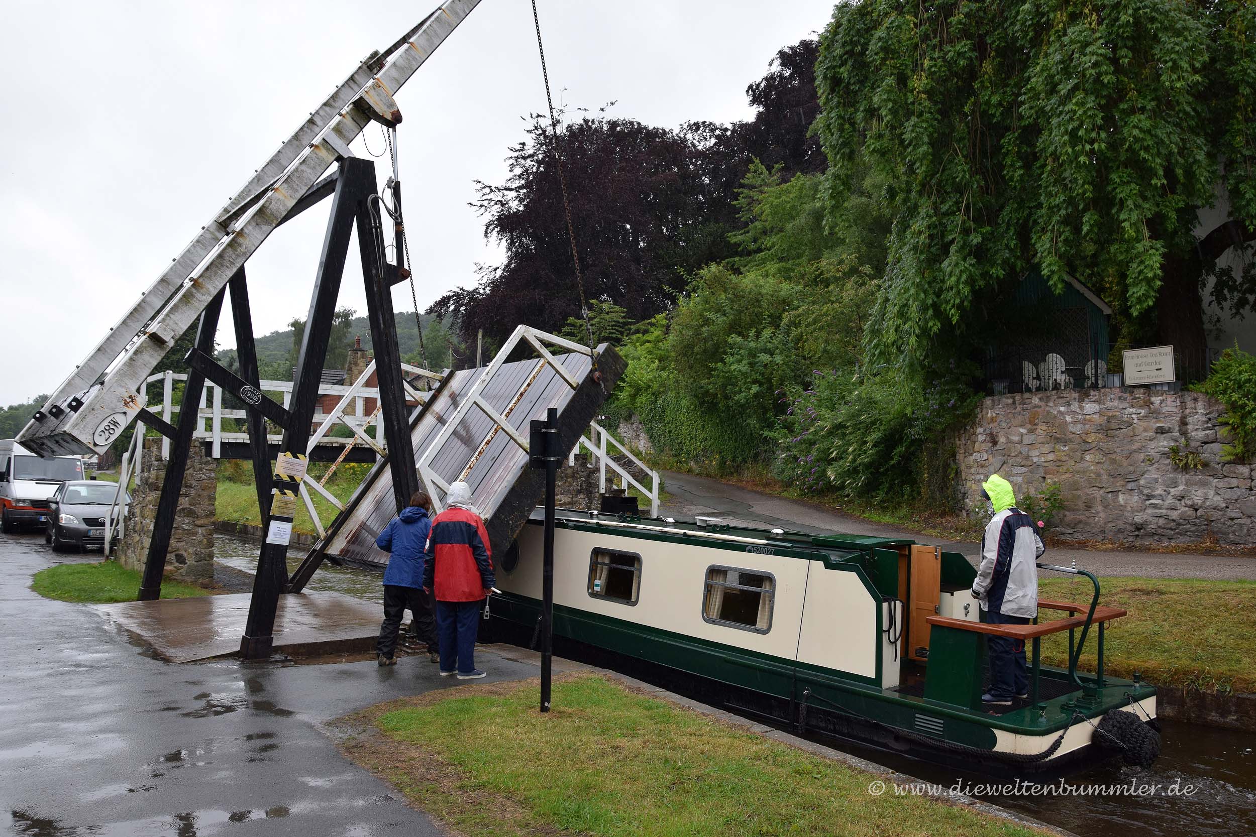 Spaziert man am Ufer des Llangollen-Kanals entlang, gelangt man hinter einer Kurve zu einer kleinen Fußgängerbrücke. Da der Kanal ja selber nur etwas über zwei Meter breit ist, sind auch die Brücken eher niedlich. Dennoch sind sie den Booten im Weg und müssen per Handkurbel von den Bootsbesatzungen selber hochgekurbelt werden. Anschließend kann das Schiff durch und die Mitreisenden kurbeln die Hebebrücke wieder hinunter.