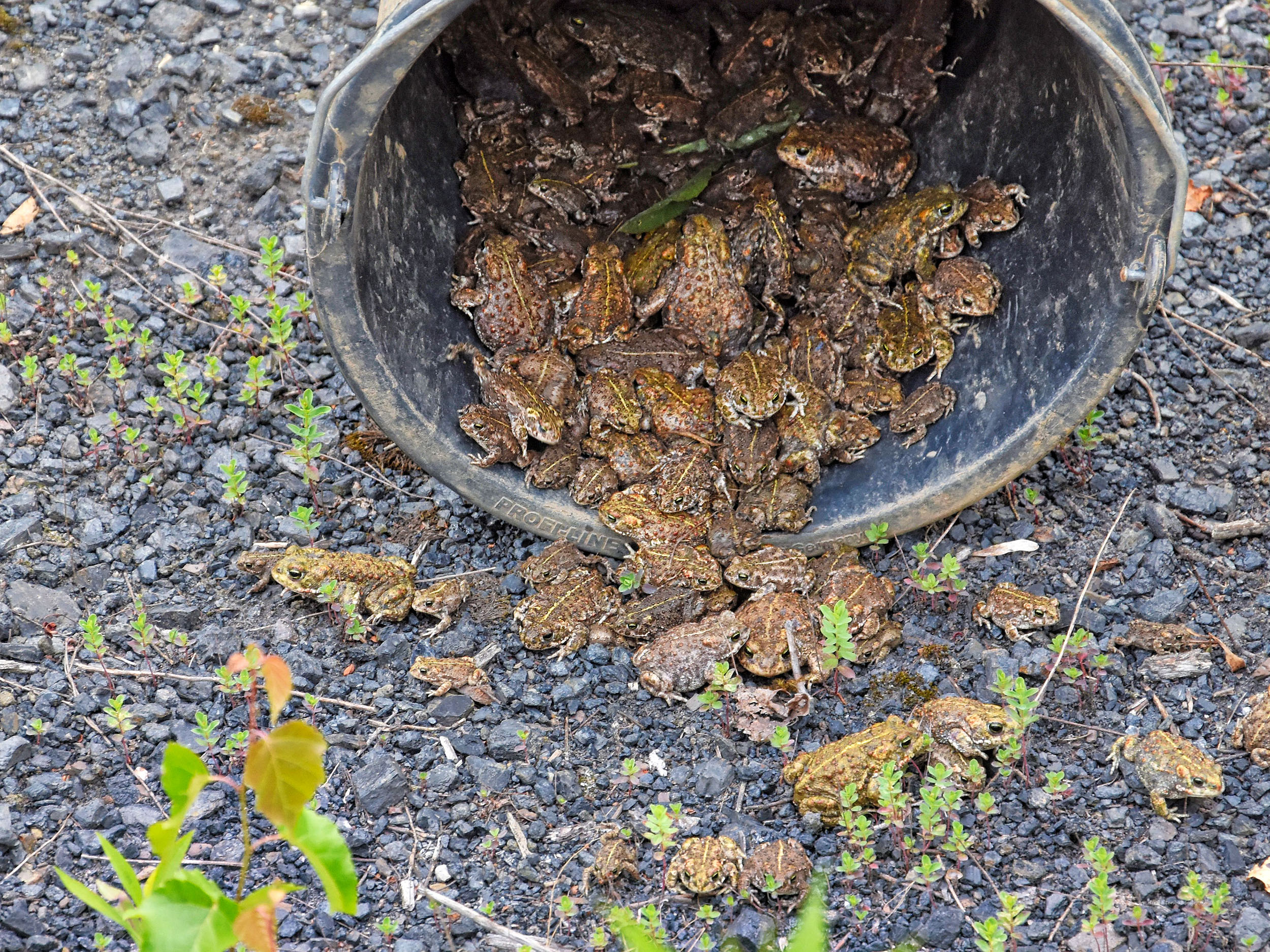 Aber so weit ist es noch lange nicht. Erst einmal geht es darum, die Tiere von ihrem jetzigen Standort in Sicherheit zu bringen. Daher wurden wir Krötenretter eingeladen, einmalig an dieser Aktion teilnehmen zu können. Einmalig deshalb, weil das Gelände normalerweise nicht betreten werden darf. Einerseits handelt es sich um ein Privatgelände und andererseits besteht dort Bergrecht. Das heißt, üblicherweise trägt man festes Schuhwerk, Warnwesten und einen Helm. Auf den Helm konnte in diesem Fall verzichtet werden, aber dennoch gibt es hier Regelungen, die man vorher wissen muss.