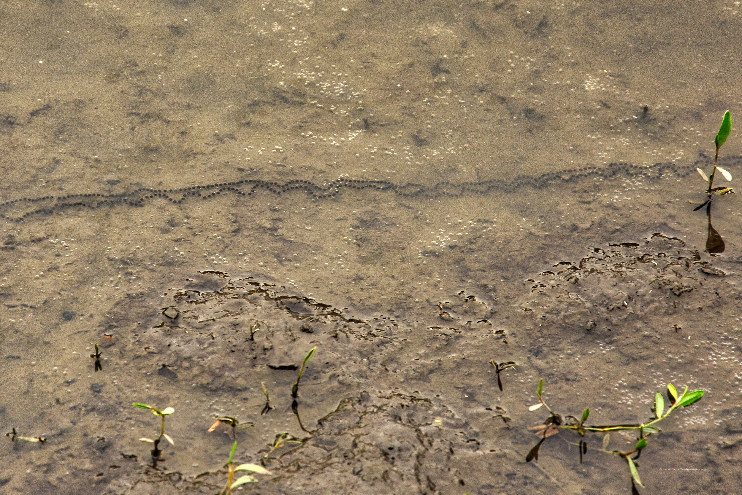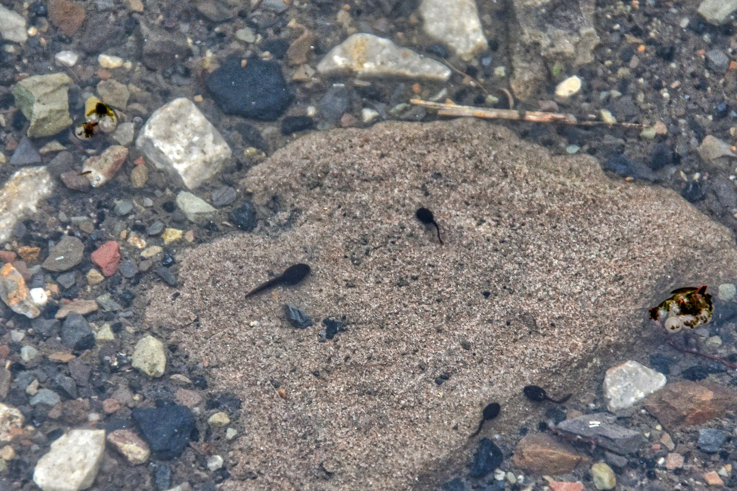 Dafür zeigte man der Gruppe eine etwas größere Pfütze, die nach dem letzten Regen übrig geblieben ist. Deutlich konnte man dort die Laichspur sehen. In einer anderen Pfütze wuselten Dutzende Kaulquappen umher. Kreuzkröten im Frühstadium hatten wir also schon einmal. Sehr schön. Danach schnappten wir uns Eimer und die Helfer gingen getrennt ins Gelände.