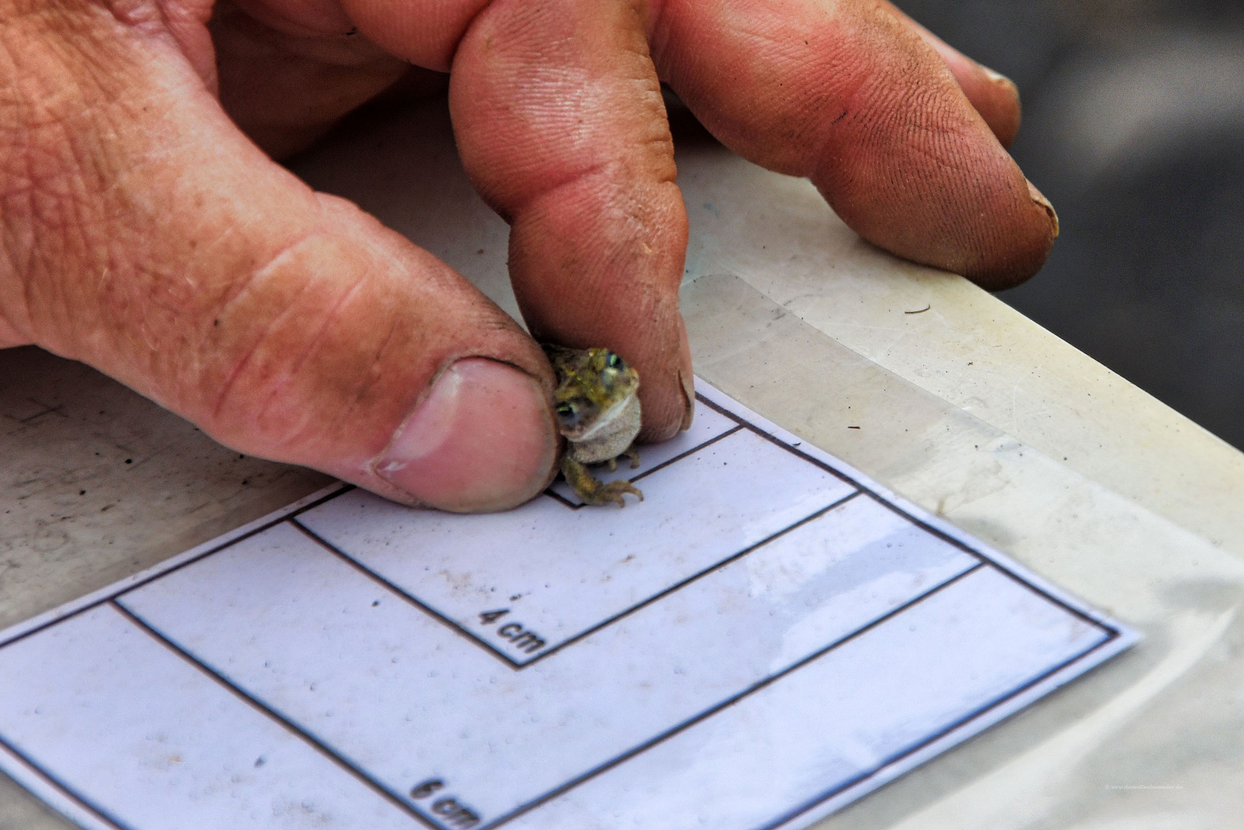 Letztendlich sind es 40 Kreuzkröten geworden, die Moni und ich im Eimer hatten, eine ziemlich hohe Anzahl. Nach mehr als einer Stunde trafen sich alle Krötenfreunde an einem vereinbarten Punkt wieder ein. Denn nun stand die Vermessung und die Zählung auf dem Programm. Auch das Geschlecht musste geprüft werden. Das ist übrigens gut an der Färbung des Halses zu erkennen. Die Vermessung ist insofern wichtig, damit man nachher weiß, wie viele adulte Tiere dabei waren. Denn davon abhängig ist nachher die Größe des Schutzgebietes, das für die Kreuzkröten eingerichtet wird.