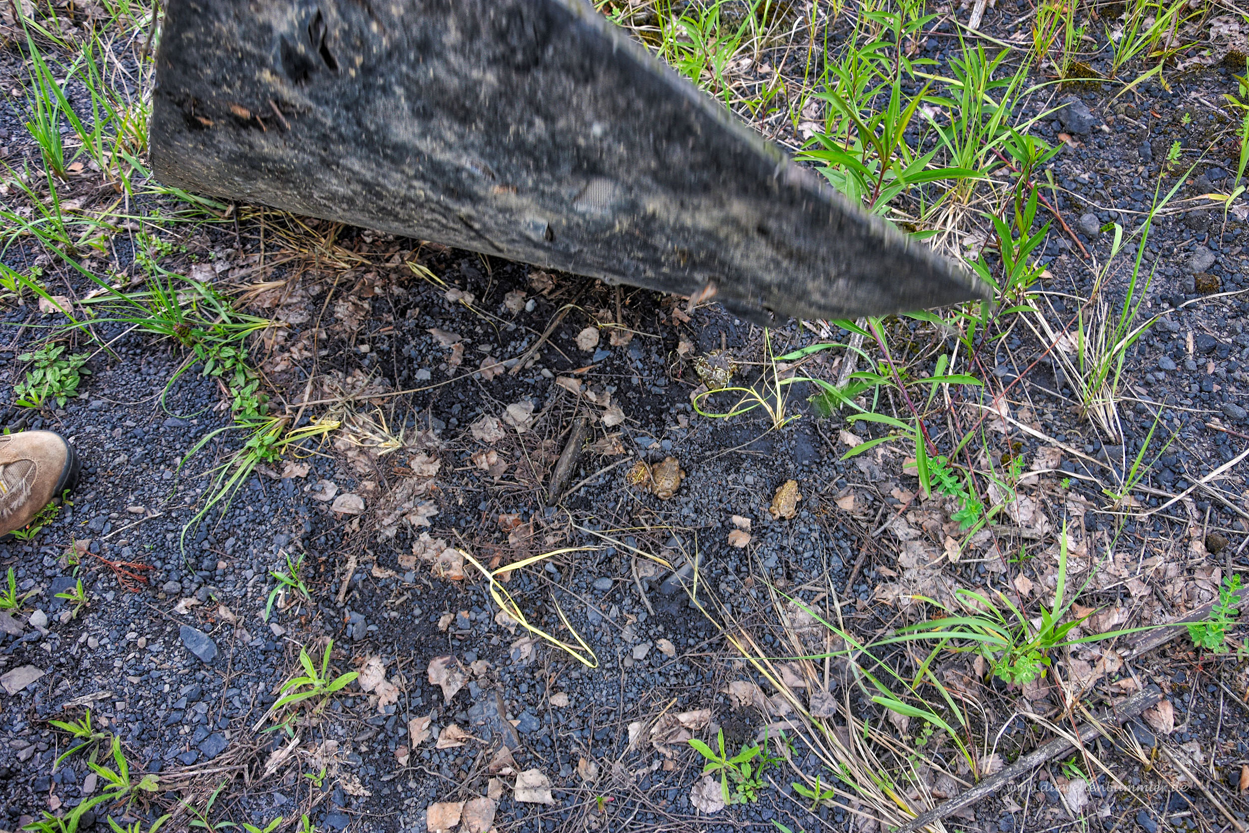 Auf dem gesamten Areal lagen große Gummimatten verteilt, die von den Kreuzkröten gerne als Unterschlupf angenommen werden. Moni und ich waren zunächst skeptisch, ob man wirklich auf so einem riesigen Gebiet Kröten finden würde, die zum Teil gerade mal zwei Zentimeter groß sind und optisch auf dem grauen Untergrund kaum zu sehen wären. Doch als Moni und ich vorsichtig die erste Matte anhoben, rannten vor Schreck die ersten Kröten weg. Und ja, sie rennen. Kreuzkröten sind wahnsinnig schnell und eben nicht so behäbig wie die Erdkröten.