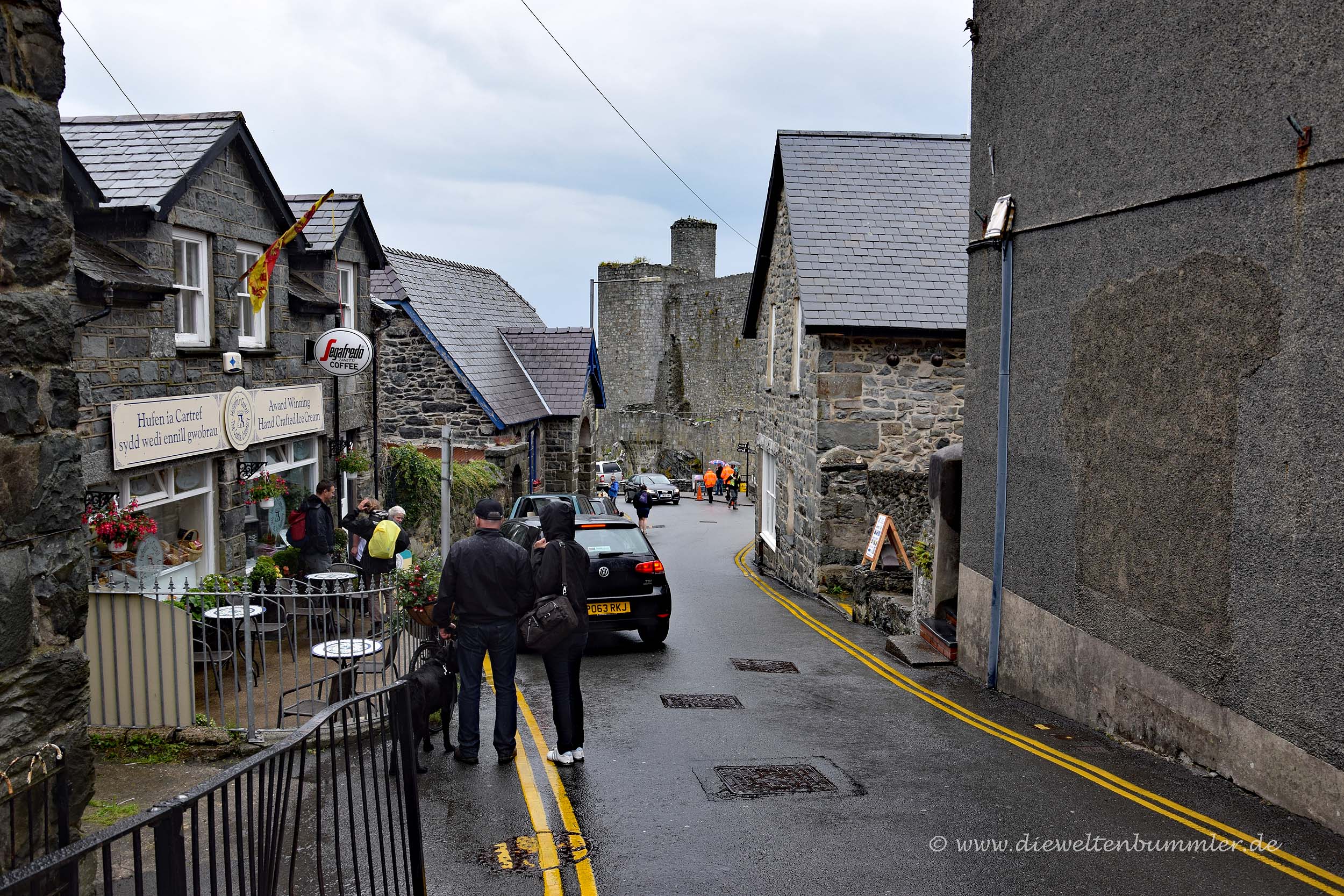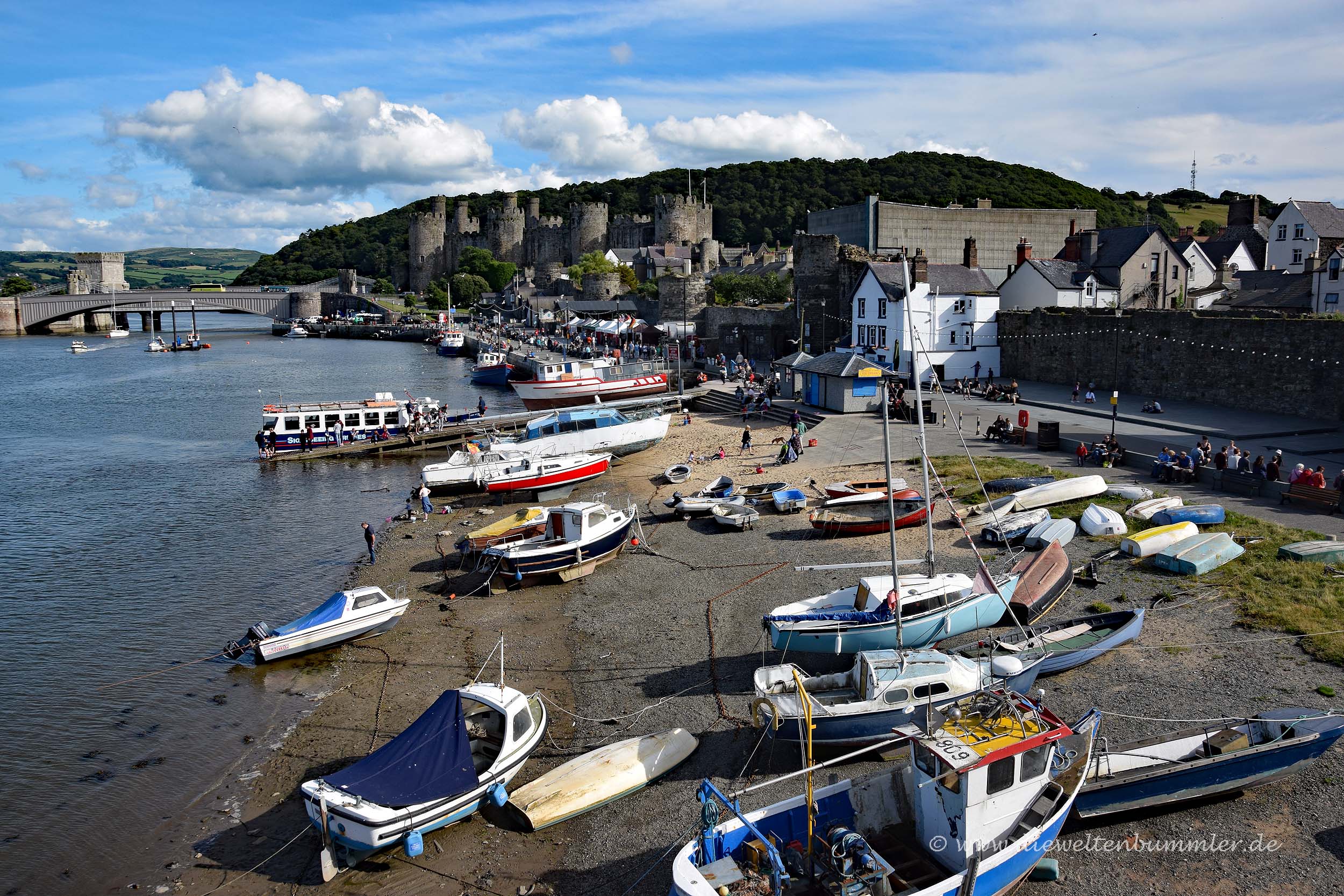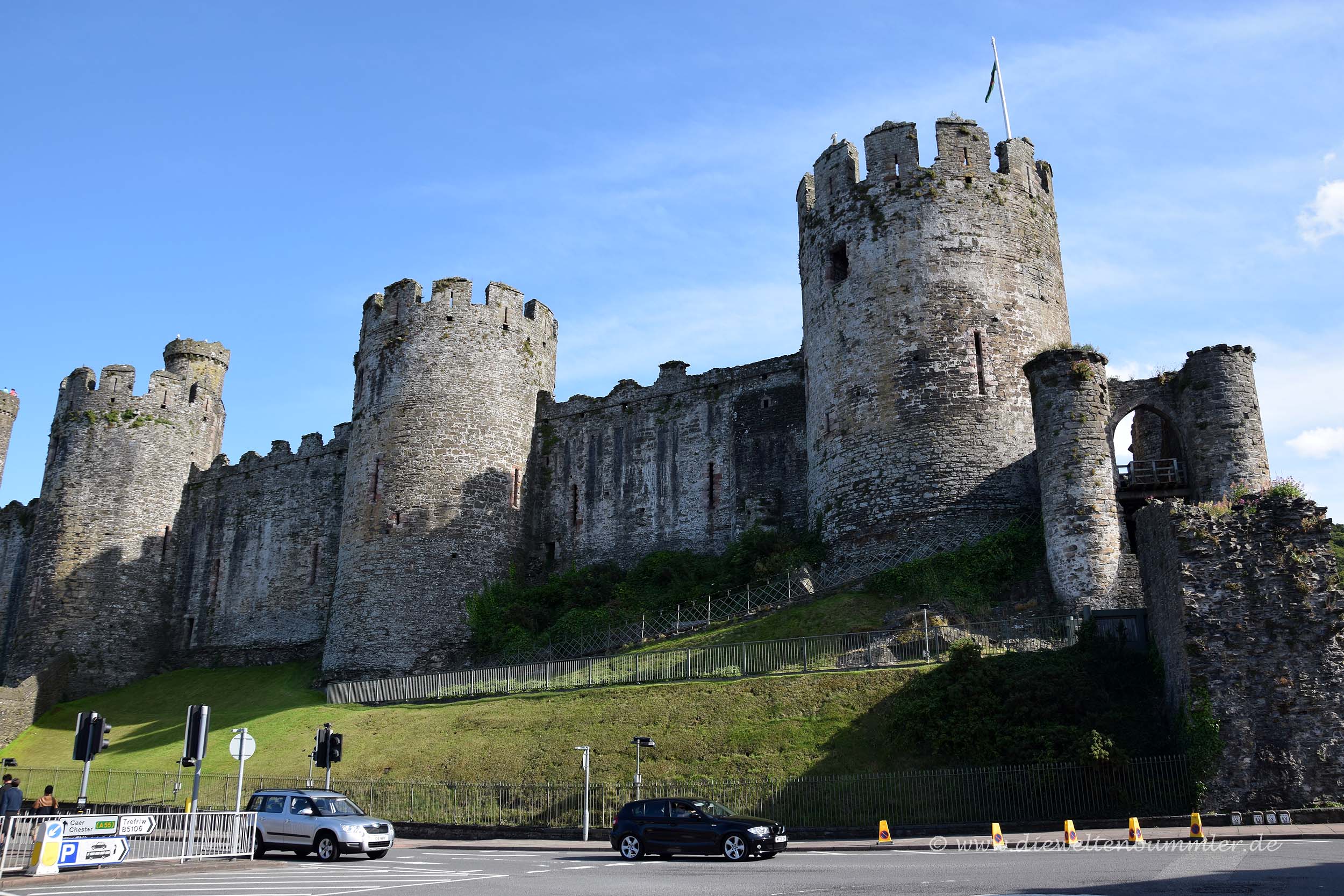 Über die vierte und letzte Burg schrieb ich schon ein paar Zeilen im Artikel Stadtmauern und als ich die dazugehörige Stadt Conwy vorstellte. Conwy Castle ist die älteste der vier Burgen und wird ergänzt durch eine Stadtmauer, die rund um die Altstadt zum Hafen führt. Fast die komplette Stadtmauer ist noch heute begehbar und man hat von ihr einen schönen Blick über die Dächer von Conwy bis zur historischen Burg.