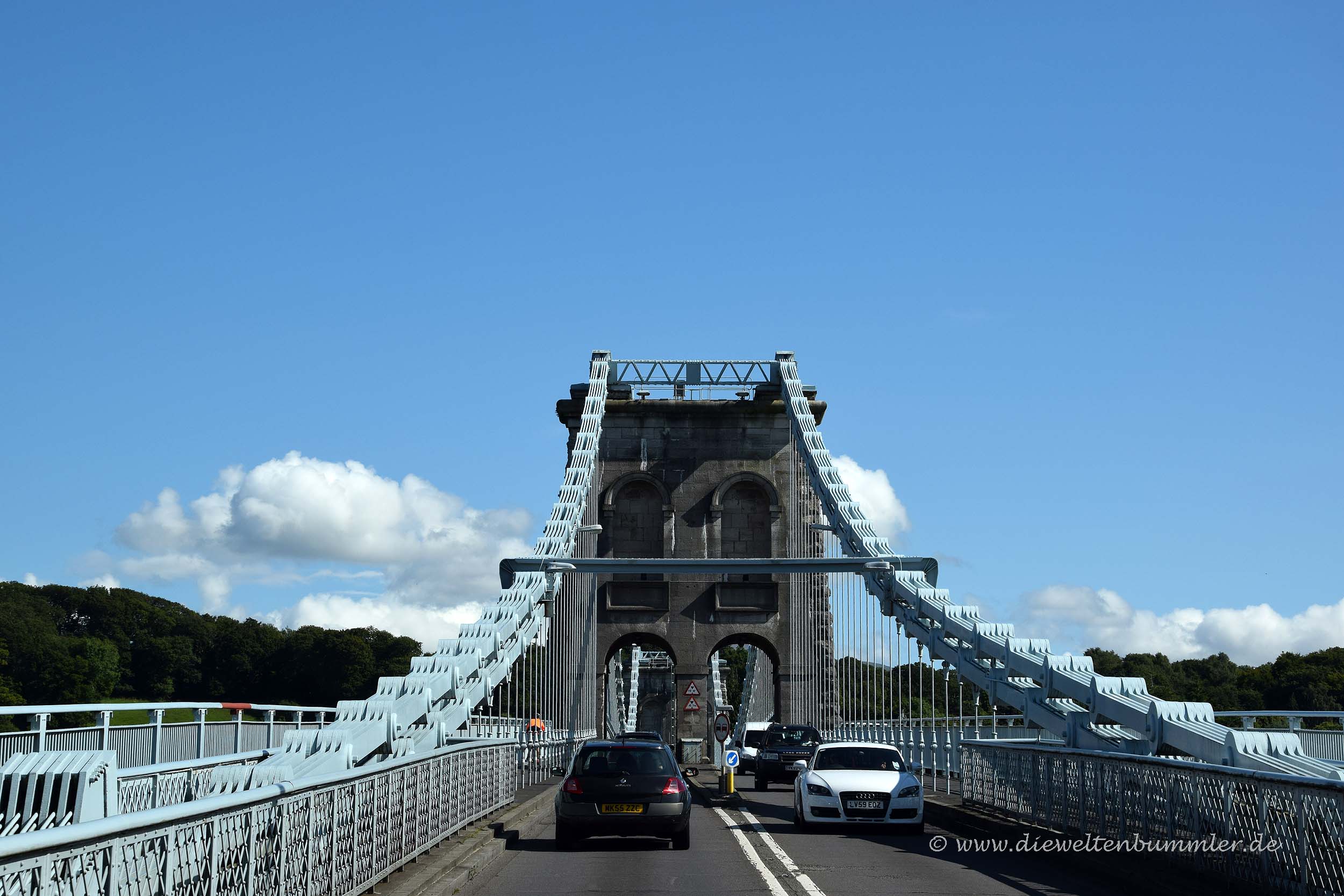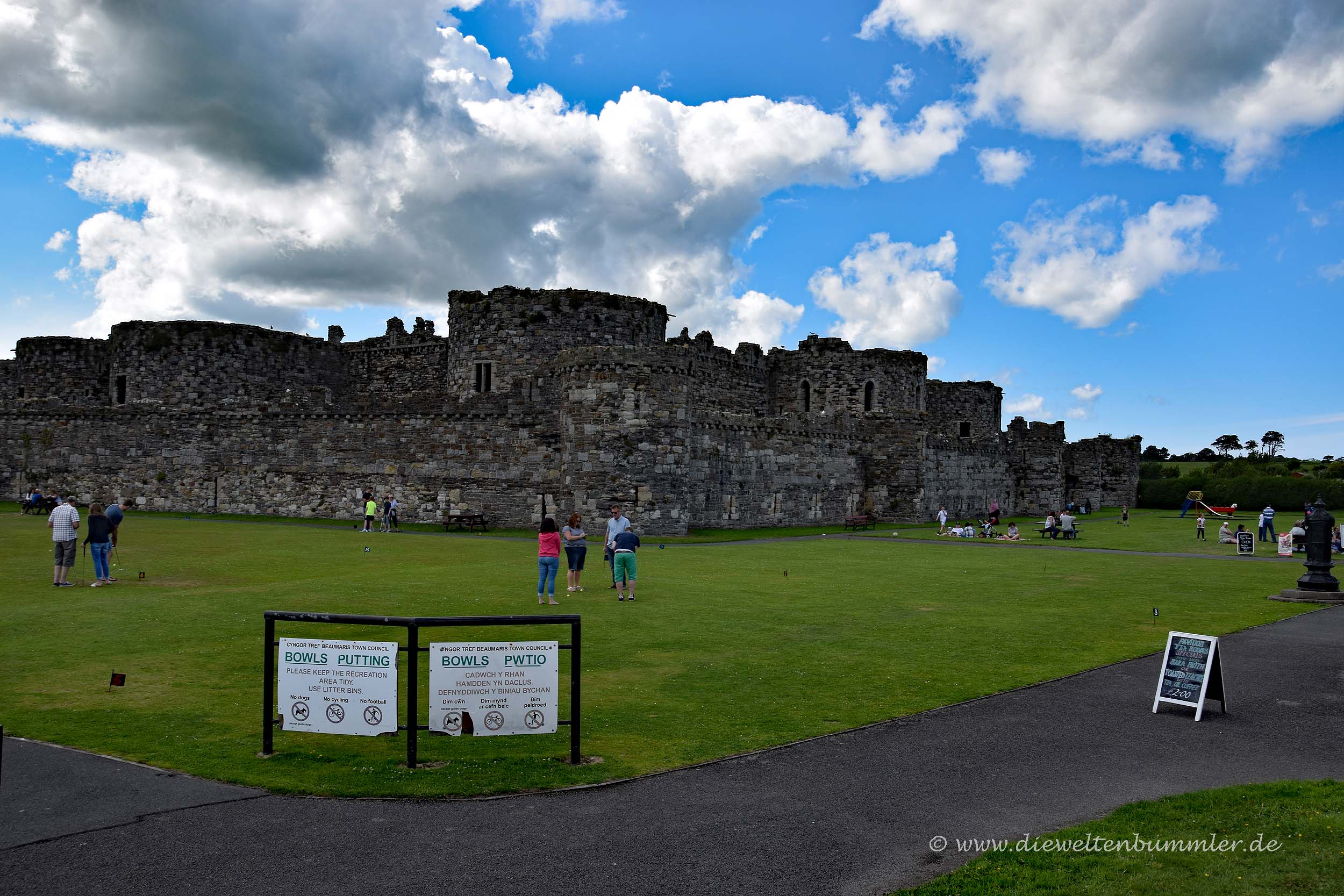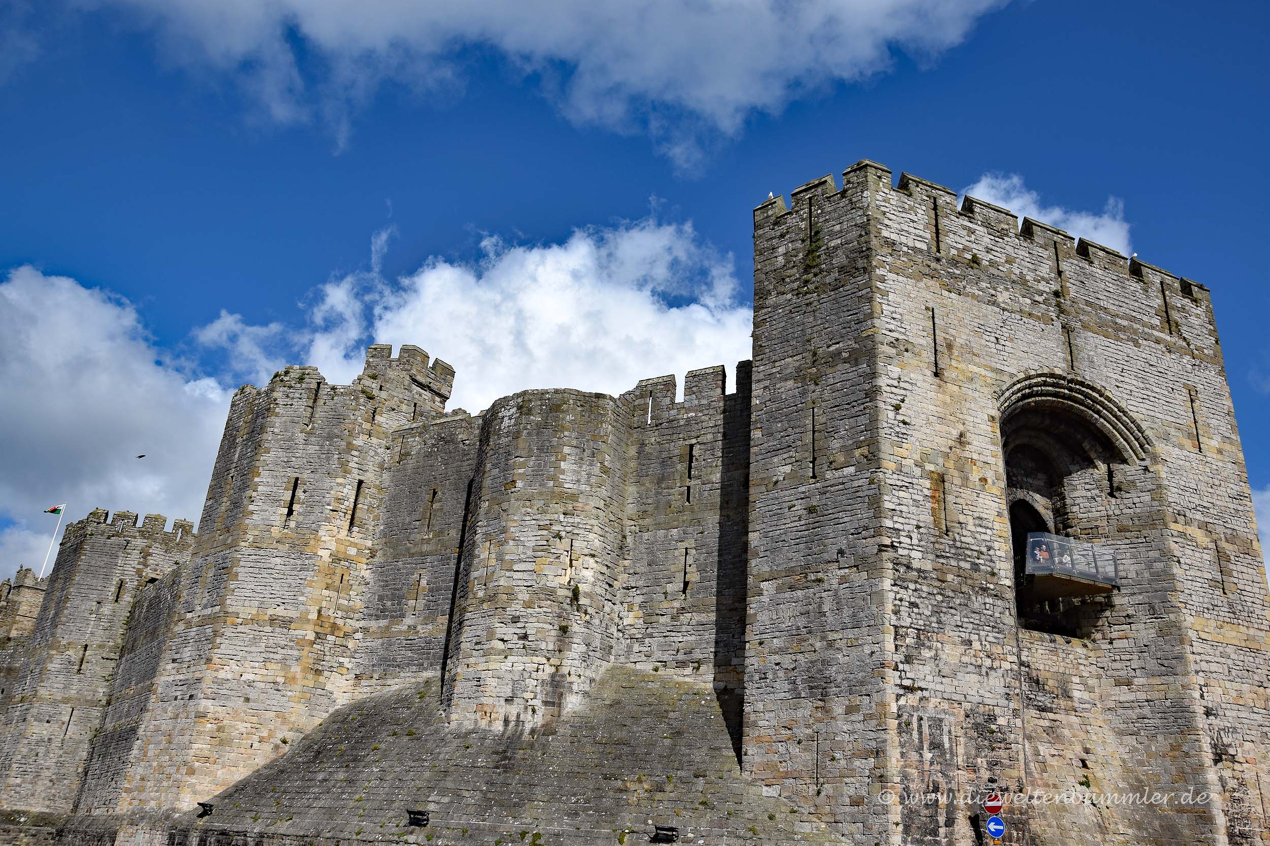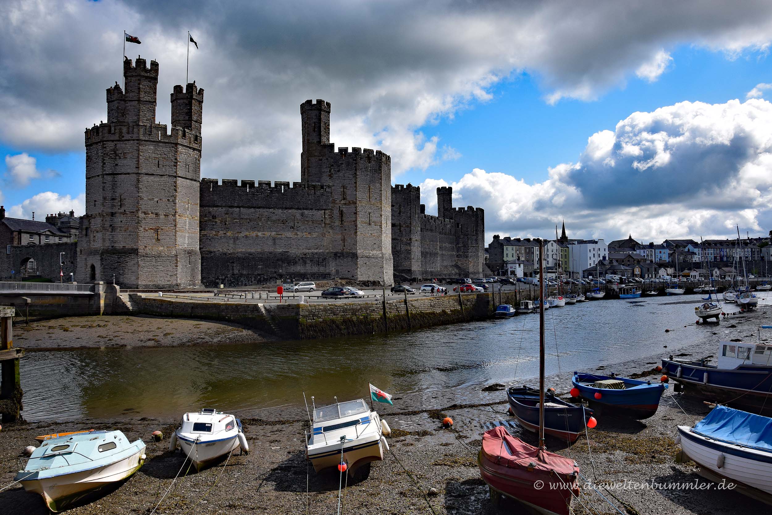 Zwischen der Insel Anglesey und dem walisischen Festland befindet sich die Menaistraße. Auf der Karte und auch bei ihrer Überquerung auf der Menai-Brücke wirkt sie fast wie ein Fluss, ist aber eine Meerenge. Während Beaumaris Castle von der Inselseite aus die nördliche Einfahrt in die Menaistraße überwachte, erhebt sich weiter südlich auf dem Festland das Caernarfon Castle.