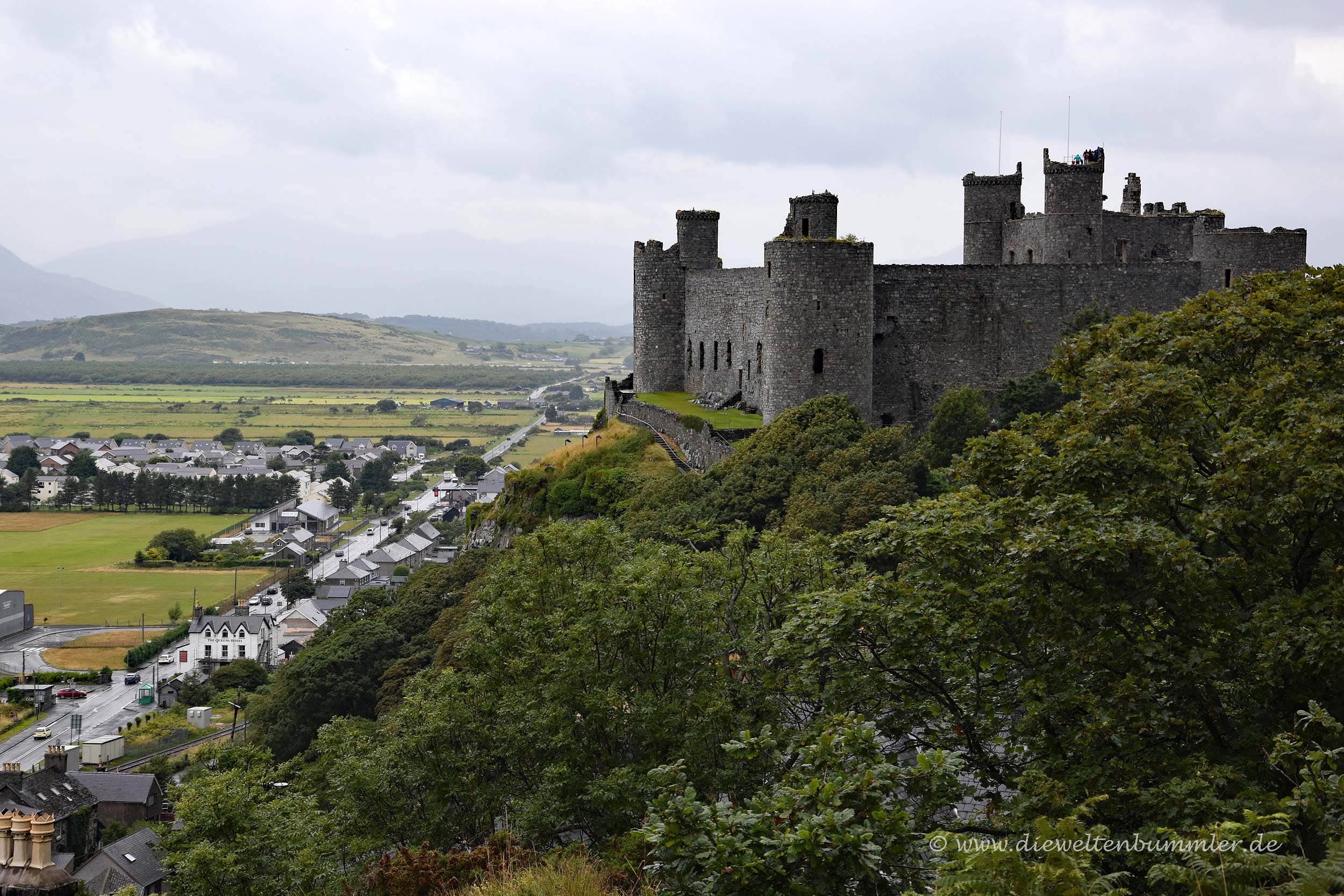 Bedeutend weiter südlich befindet sich die Ortschaft Harlech, die von der weit oberhalb gelegenen Burg dominiert wird. Sie erhebt sich auf einem Felsplateau, das an drei Seiten steil abfällt. An der vierten Seite erstreckt sich die Altstadt von Harlech, während ein modernerer Teil der Stadt unten in der flachen Marschlandschaft zu sehen ist. Es wird vermutet, dass sich diese weite Ebene erst nach der Fertigstellung der Burg entwickelte und Harlech Castle damit ursprünglich auf einer Felsküste errichtet wurde.