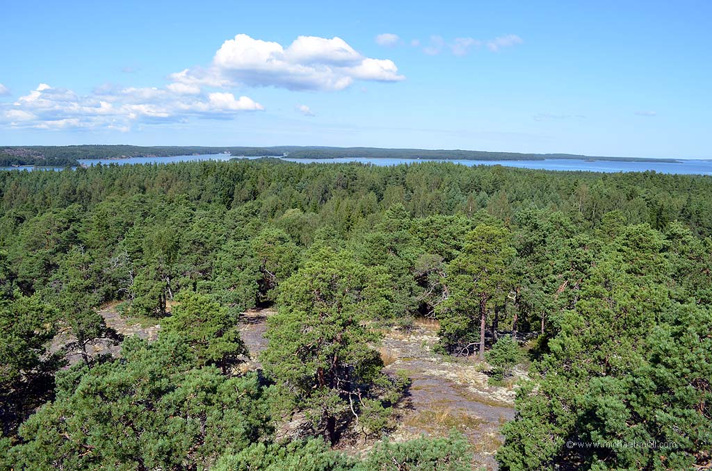 Uralte Grabsteine markieren einen kleinen russisch-orthodoxen Friedhof mit nicht mehr als zehn Gräbern. Weiter geht es auf einem breiten Grasweg, der erstaunlich gut gepflegt ist. Er erinnert schon fast an eine Gartenlandschaft im Süden Englands. Gesäumt wird der Weg von kleinen Steinmauern, die wir bald über eine Holztreppe überwinden. Und dann geht es auch schon bergauf. Zugegeben, bergauf ist vielleicht übertrieben, wenn man bedenkt, dass die Åland-Inseln doch sehr flach sind und der höchste Berg knapp 130 Meter hoch ist. Aber über moosbewachsene Felsen und Holztreppen gewinnen wir an Höhe und stehen am höchsten Punkt der Insel Prästö plötzlich vor einem hölzernen Aussichtsturm. Ich kann nur sagen: Ein grandioser Blick über die bewaldeten Inseln mit ihren Schären, die in die Ostsee eintauchen.