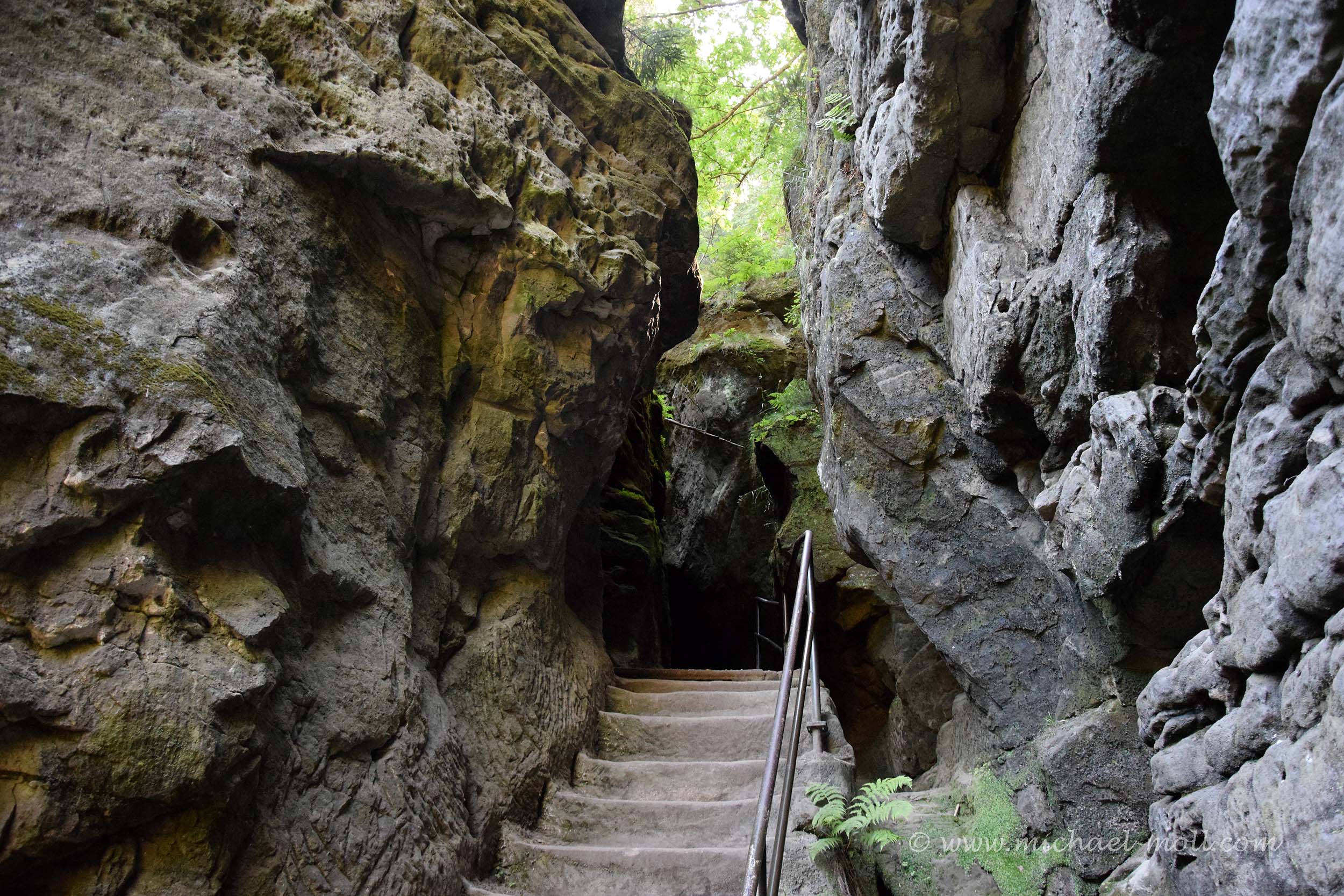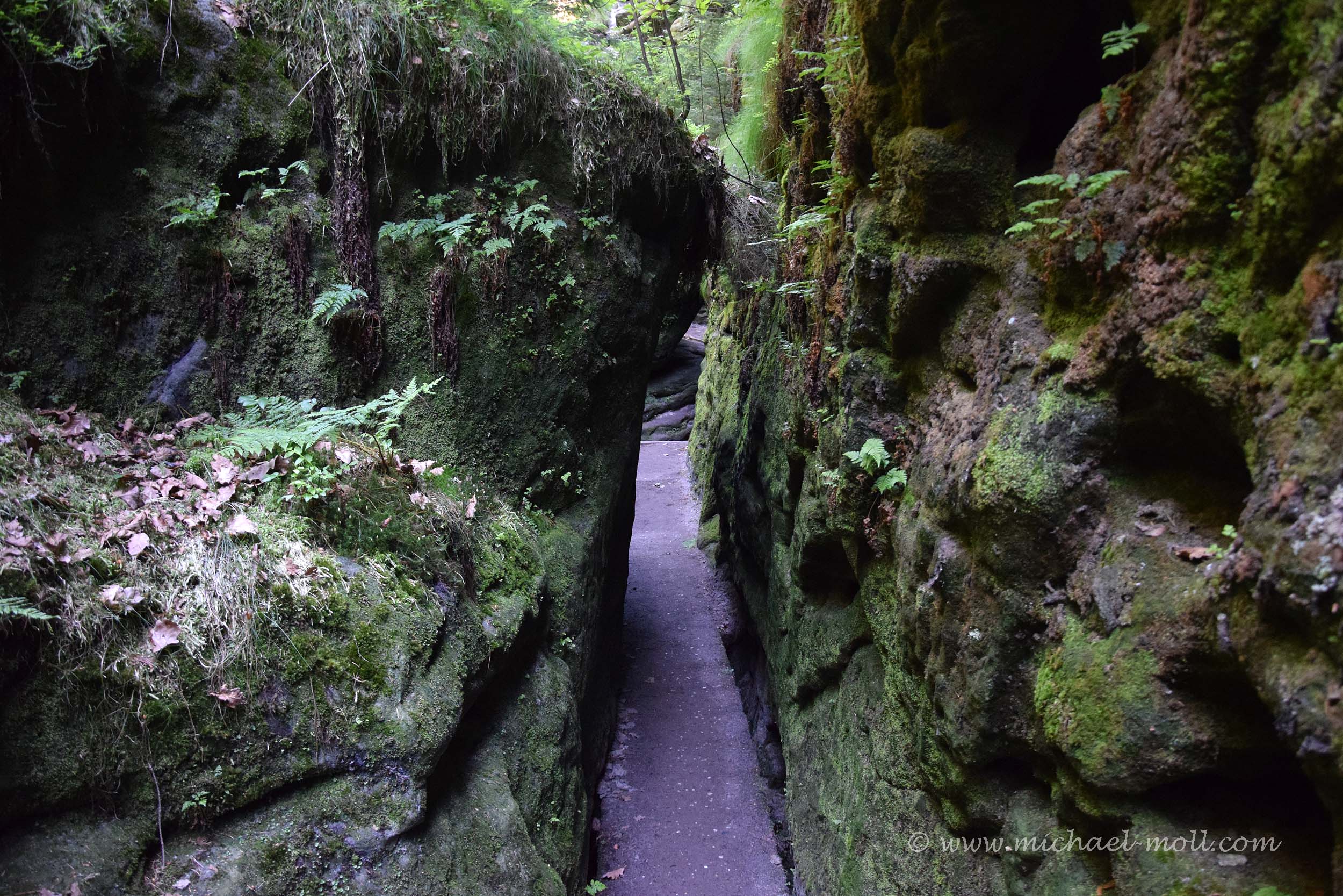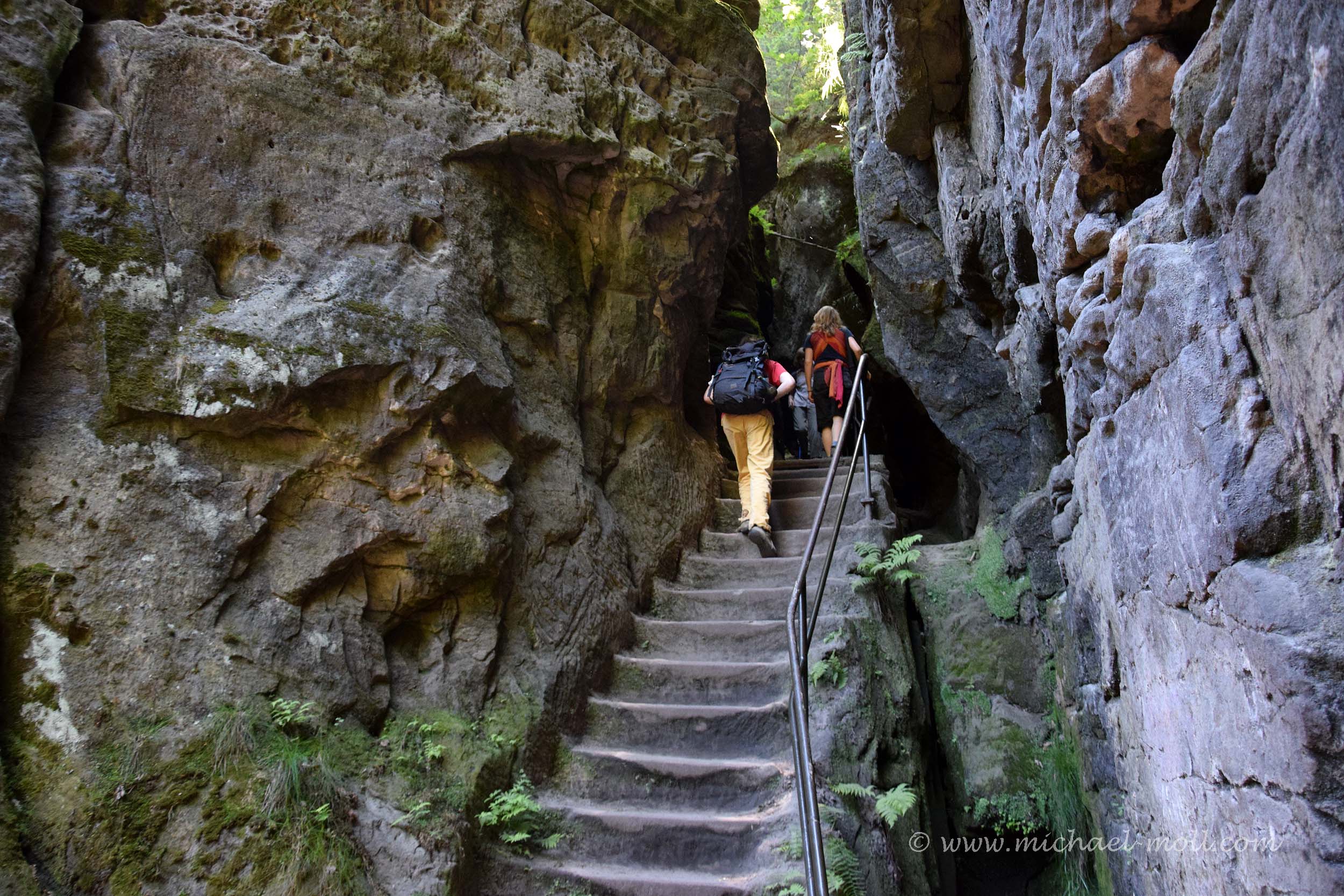 Bevor man von der Bastei wieder zurück zum Parkplatz geht, sollte man rechts abbiegen und dem Weg zu den Schwedenlöchern folgen. Ein Schild weist wenig später darauf hin, dass es noch fünf Minuten zum Einstieg zu den Schwedenlöchern sind. Zum Einstieg? Ja, denn bei den Schwedenlöchern handelt es sich um eine Schlucht, in der es beständig bergab geht. Dabei wird es stellenweise so eng, dass man gerade so eben zwischen den Felswänden hindurch passt. Das Witzige ist, dass man von oben nicht weiß, wie weit es eigentlich noch nach unten geht und man sich über das Schnaufen und Hecheln der entgegenkommenden Wanderer zunächst ein wenig wundert. Doch die Verwunderung lässt irgendwann nach und wechselt über in ein erstauntes „Wie weit geht das denn noch hinab?“. Bis man dann irgendwann im Amselgrund angekommen ist und sich nach links zur nahe gelegenen Amselbaude begeben kann.