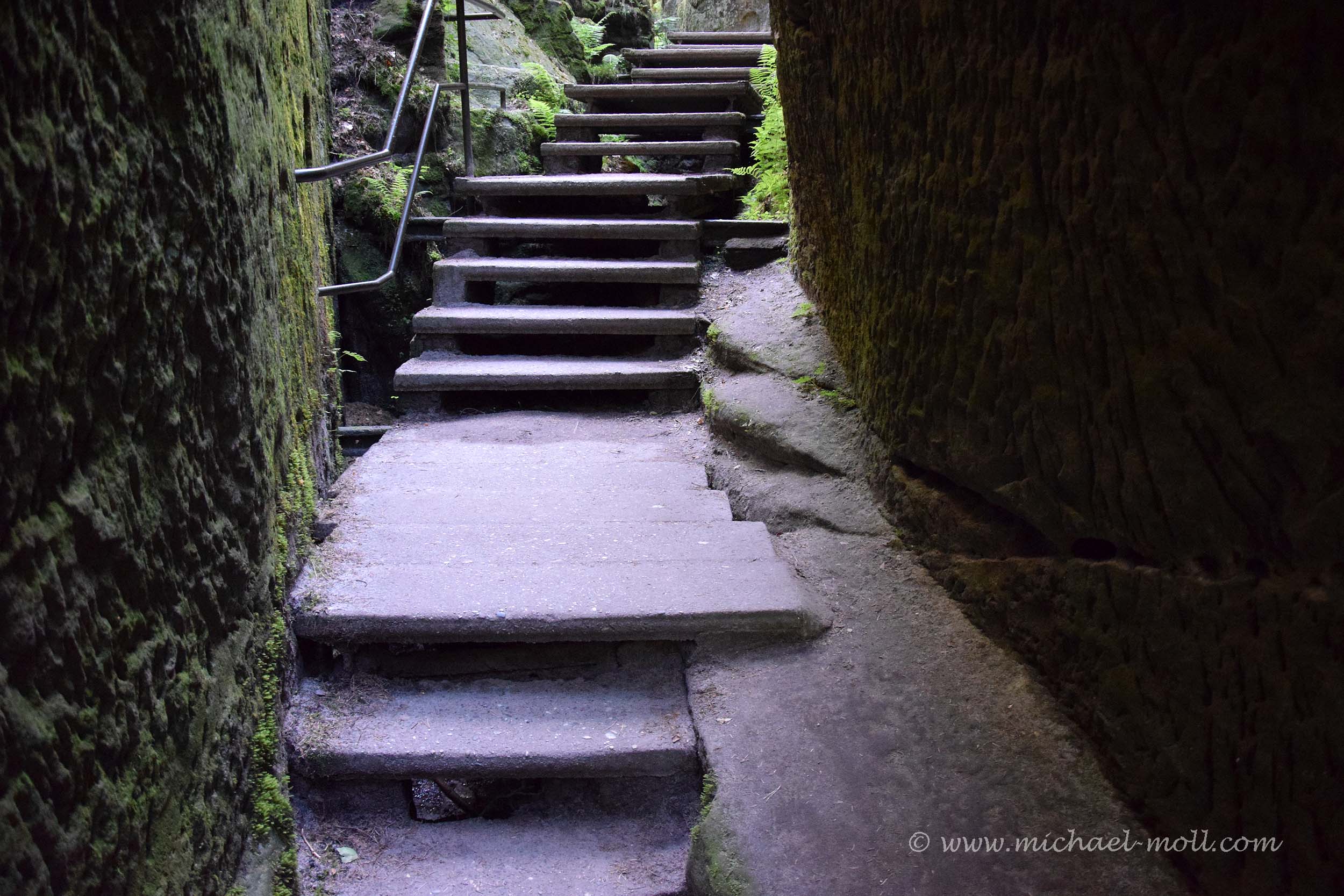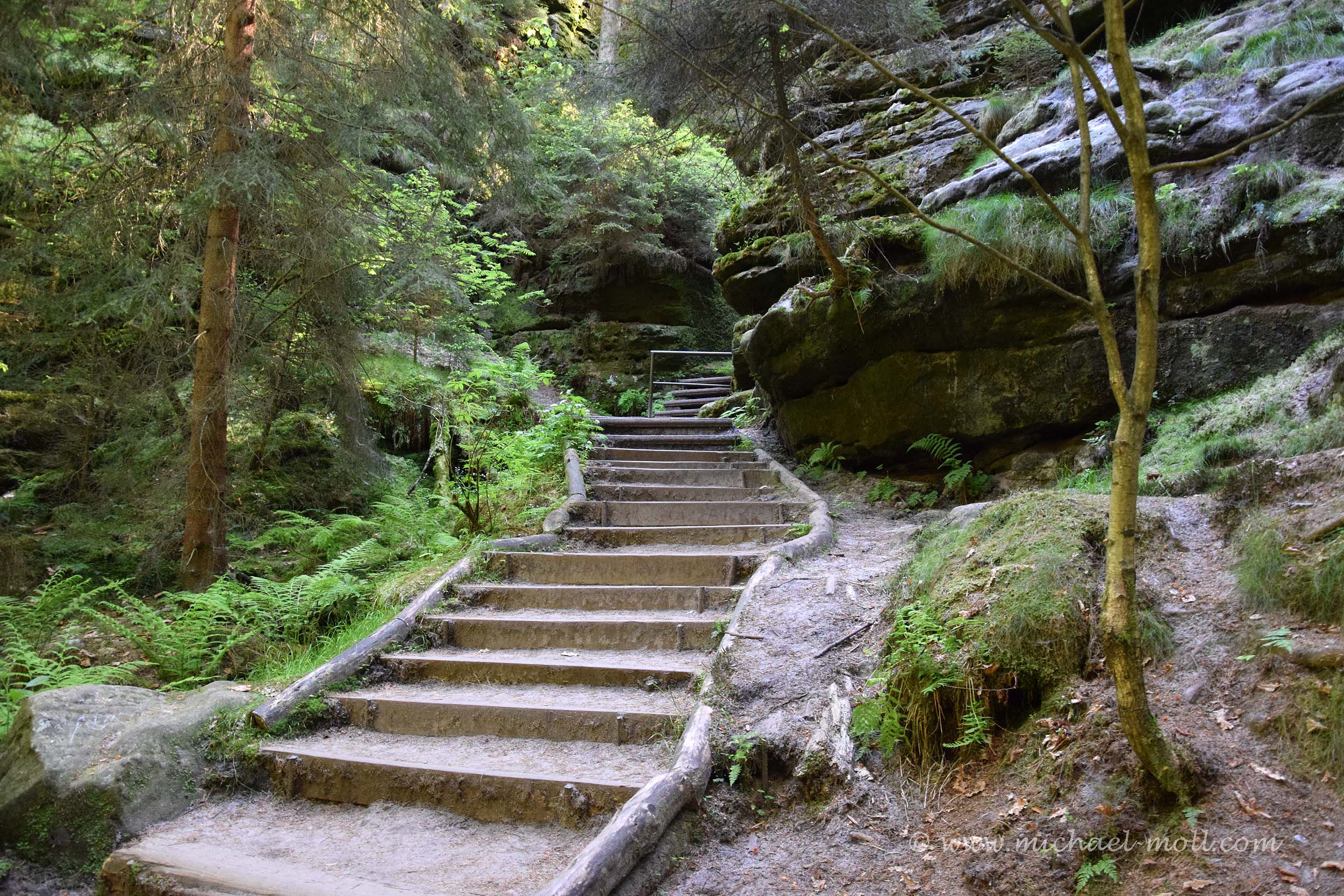 Gleich neben der Baude befindet sich eine kleine Infostelle der Nationalparkverwaltung der Sächsischen Schweiz und natürlich der dazugehörige Wasserfall. Als ich dort war, fiel dieser aber recht bescheiden aus. Aber was soll’s, dafür war das Wetter schön. Eine kurze Pause zur Stärkung schadet in der Amselbaude nicht, denn wenn man nun wieder zur Bastei bzw. zum Parkplatz zurück möchte, dann hat man eine gute Steigung vor sich. Der überwiegende Teil des Wanderwegs durch die Schwedenlöcher ist mit Stufen befestigt. Manchmal sind es auch nur größere Wurzeln oder aber Holzbretter, die man in das Erdreich versenkt hat. Bevor wir hinauf wanderten, beschlossen Moni und ich, die Stufen unabhängig voneinander zu zählen. Sie kam auf 857 Stufen, während ich die ein oder andere Wurzel vermutlich zu sehr als Stufe betrachtet hatte und bis 863 zählte. Wir betrachteten diese Differenz als erstaunlich gering und einigten uns auf 860 Stufen, die man in den Schwedenlöchern überwinden muss. Das ist immerhin mehr als die Hälfte der Stufen im Empire State Building.