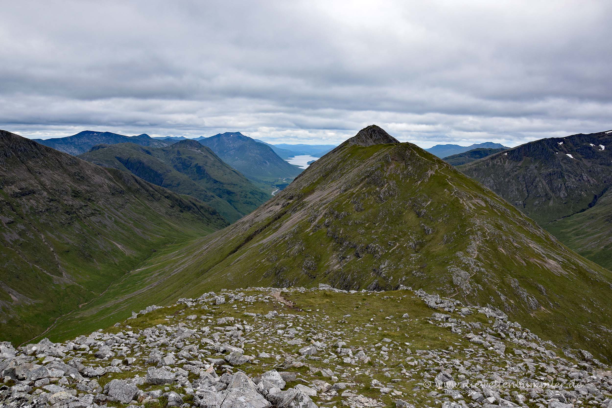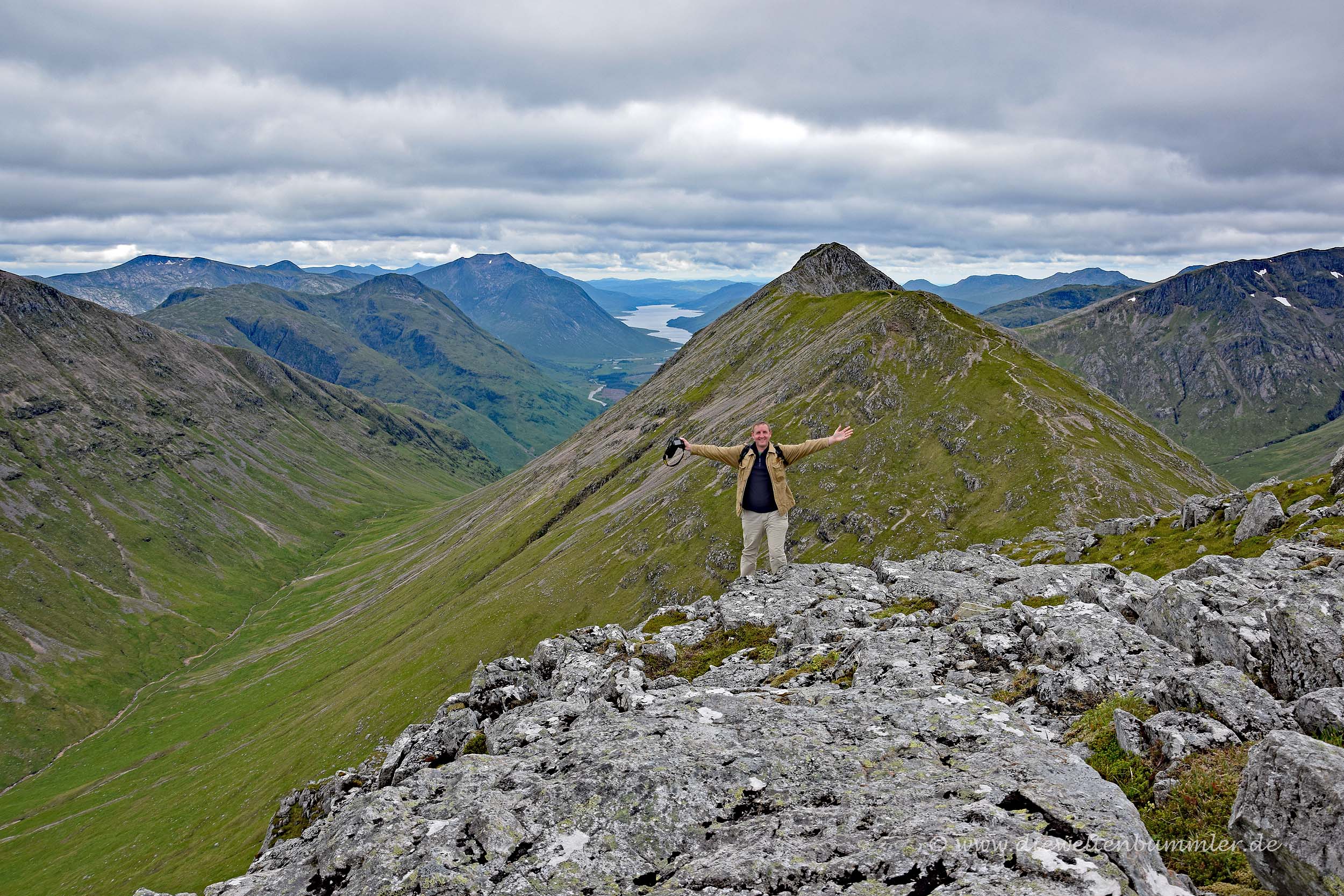 Wir folgten also dem verhältnisäßig kurzen Aufstieg zum Stob Coire Raineach und genossen schon bald den Rundumblick. Er reichte bis zum erwähnten Loch Etive, natürlich durch weite Teile des Glen Coe und hinüber zum Ben Nevis. Dieser war ziemlich gut zu erkennen, obwohl er von dicken Wolken eingehüllt war. Aber eben das ist typisch für den Ben Nevis und er war der einzige Berg in der näheren Umgebung, der sich in den Wolken versteckte.