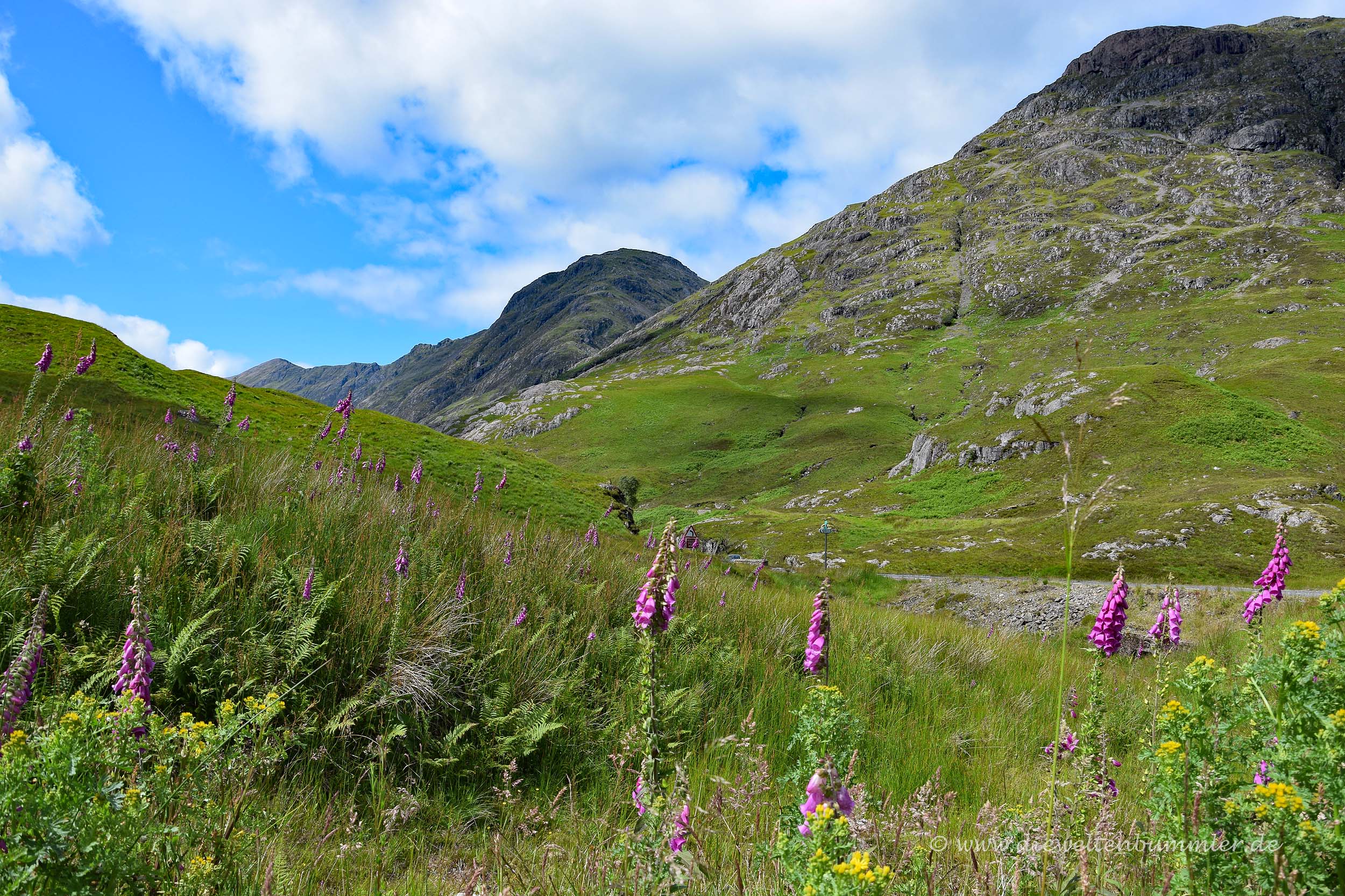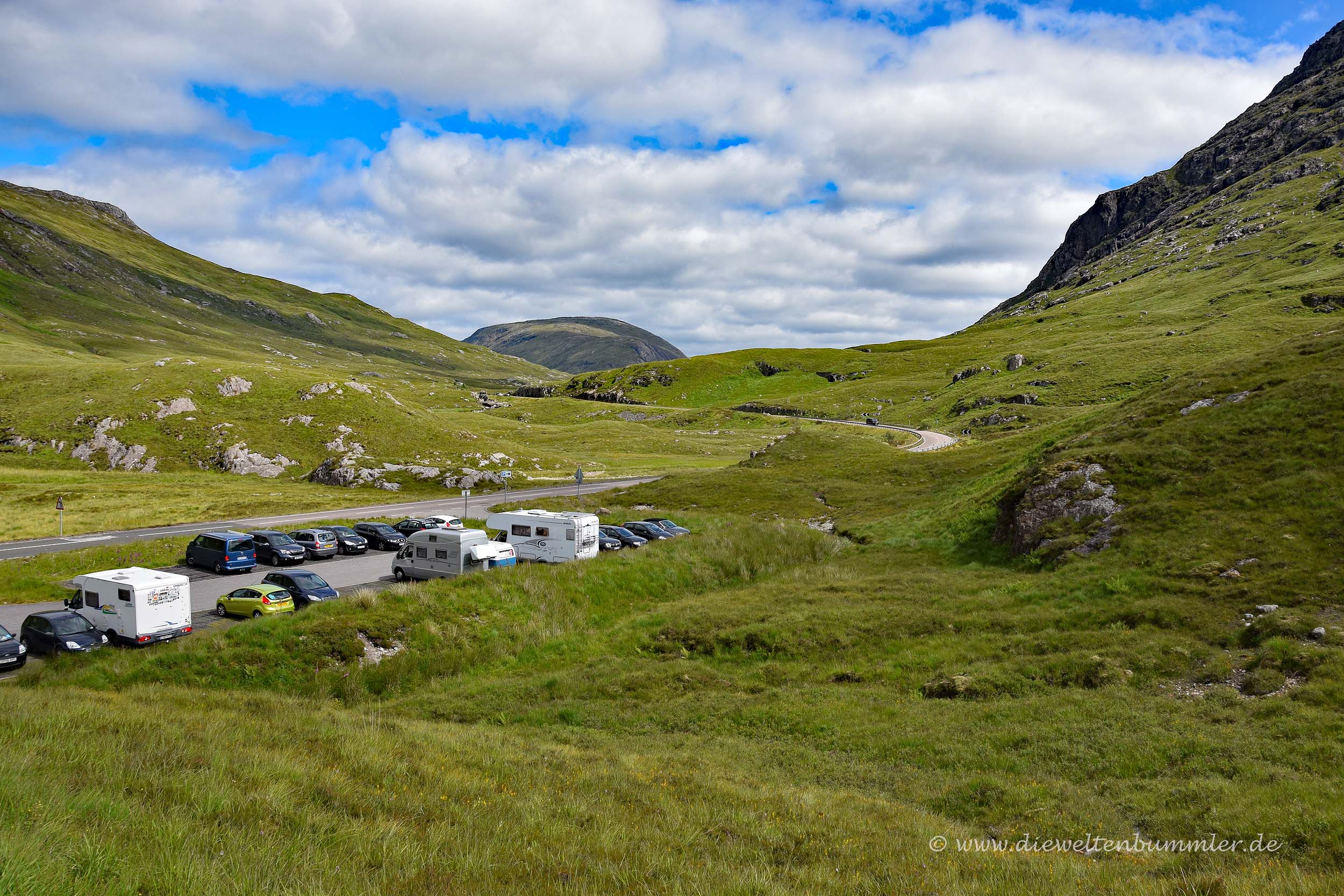 Ungefähr auf der Hälfte der Strecke des Tals lassen wir das Auto an einem Wanderparkplatz stehen (GPS: 56.662719, -4.958008). Kommt man von Süden, dann befindet sich der Parkplatz einige Zeit hinter dem Abzweig zu King’s House auf der linken Seite.