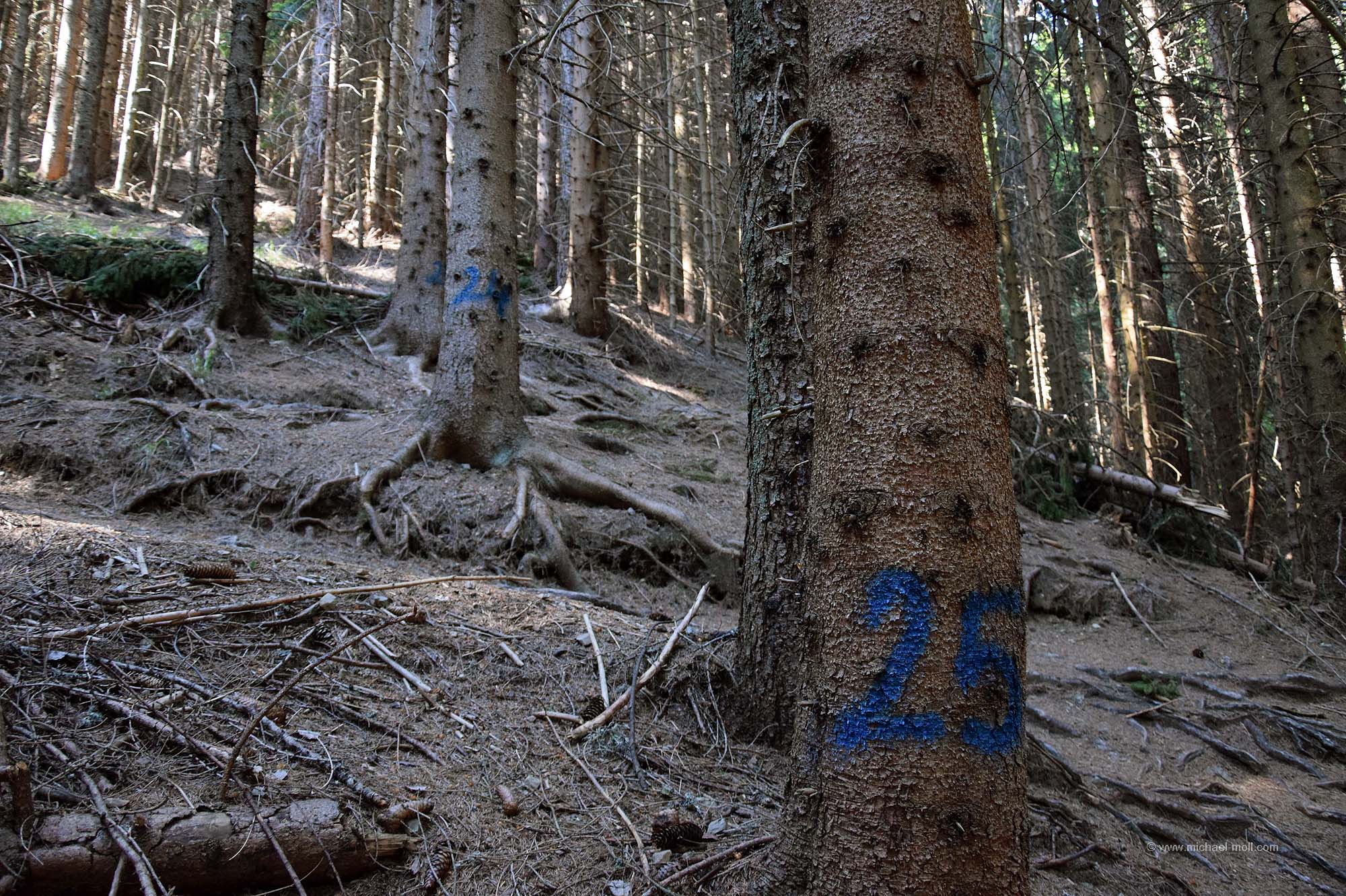 Es geht ständig bergauf und bei hochsommerlichen Temperaturen hatte ich eigentlich etwas Sorge, dass die Sonne auf die Südflanke des Berges brennt. Doch fast die gesamte Wanderung verläuft unter dichten Baumkronen. Den ersten Teil der Strecke wandert man auf einem breiten Forstweg, auf dem man rund 330 Höhenmeter überwindet. Damit hat man gut die Hälfte hinter sich gebracht und steht nun vor der Entscheidung, ob man einen steilen Zickzack-Weg direkt an der slowenisch-italienischen Grenze wandern möchte oder ob man einen ziemlichen Umweg in Kauf nimmt und einfach auf dem breiten Forstweg bleibt. Witzig ist, dass die 31 Kurven des Zickzack-Weges an den Bäumen durchnummeriert sind.