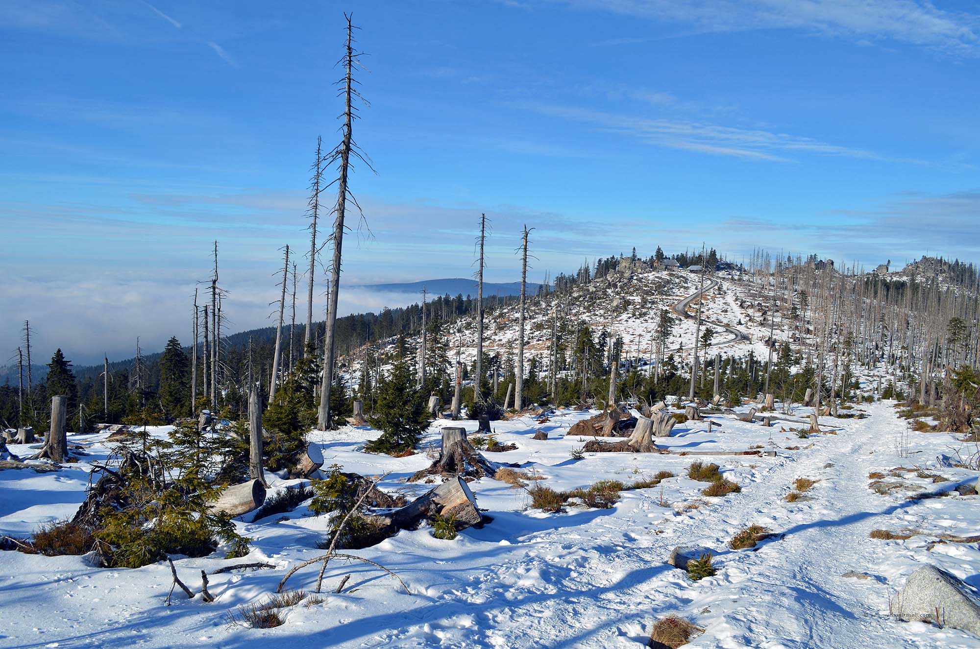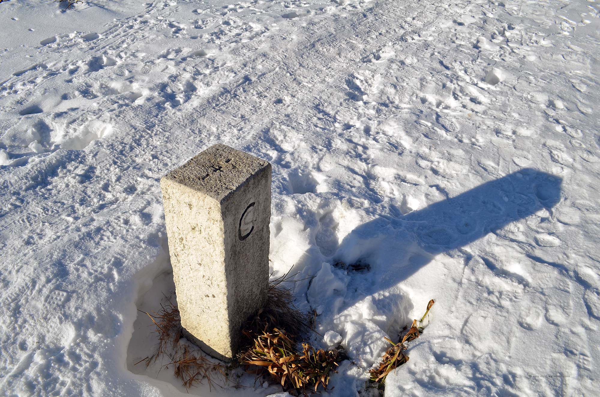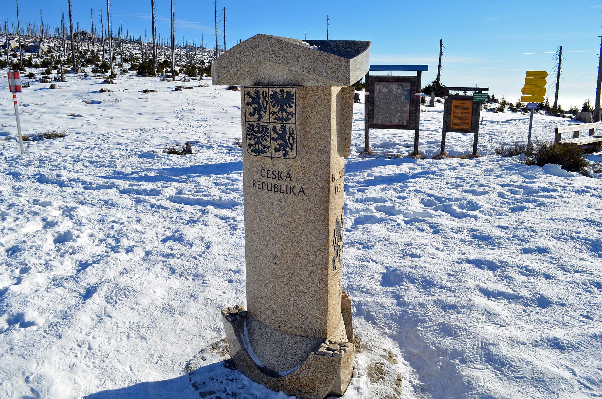 Wir beschlossen, beide Wege zu erkunden und begannen mit dem Grenzweg. Dieser verläuft im leichten Auf und Ab geradewegs auf den Dreiländerpunkt zu und ist trotz des Schnees gut begehbar. Immer wieder läuft man an Grenzsteinen vorbei und wird durch Hinweisschilder darauf aufmerksam gemacht, dass sich linker Hand der tschechische Nationalpark Šumava befindet.