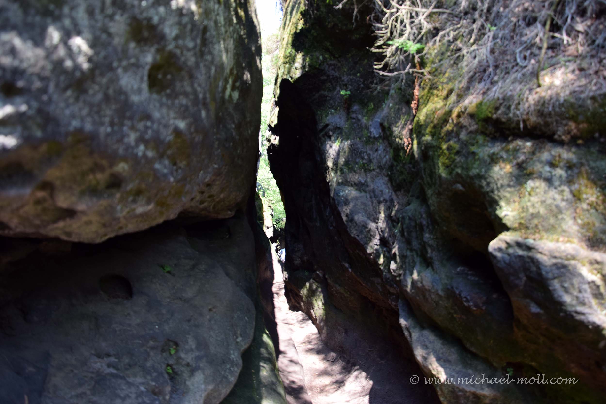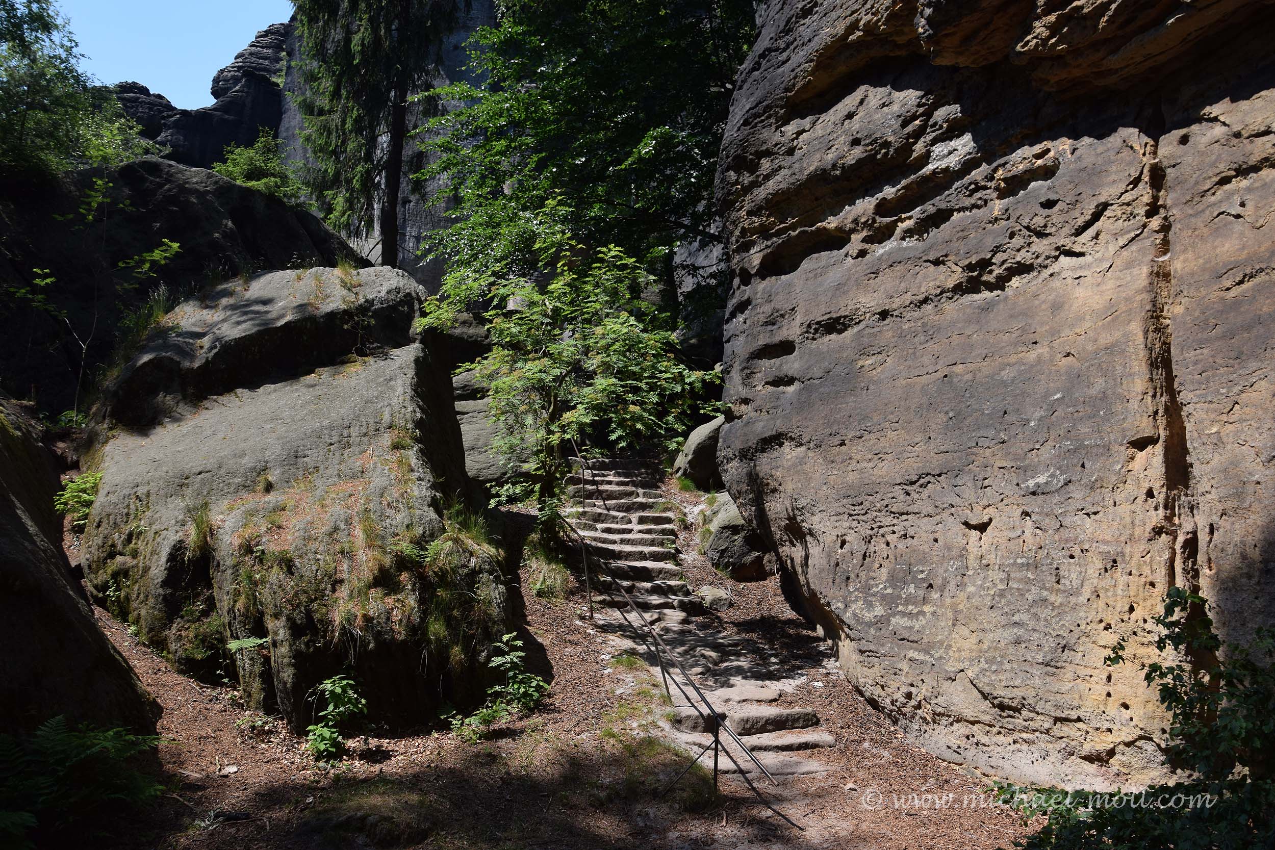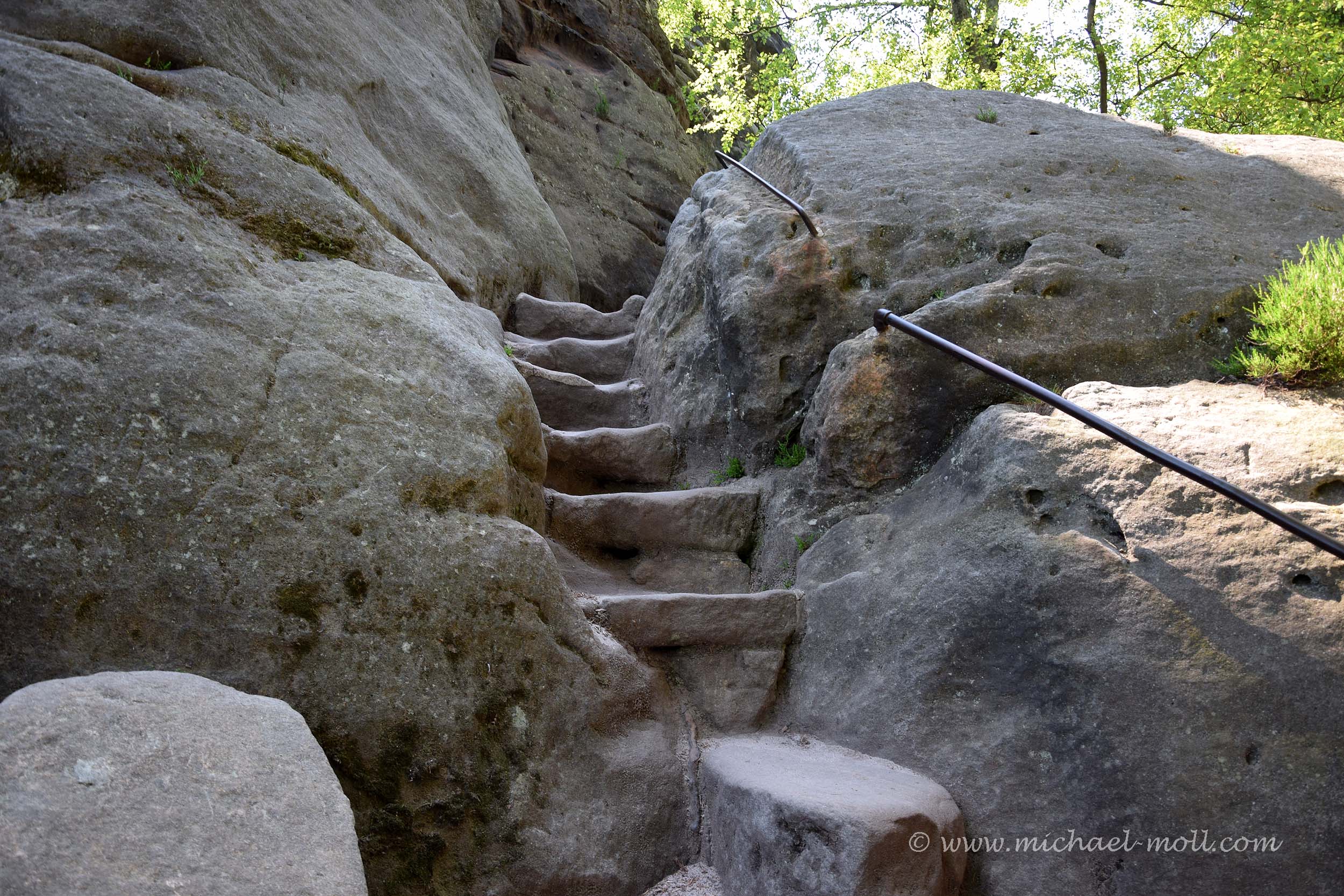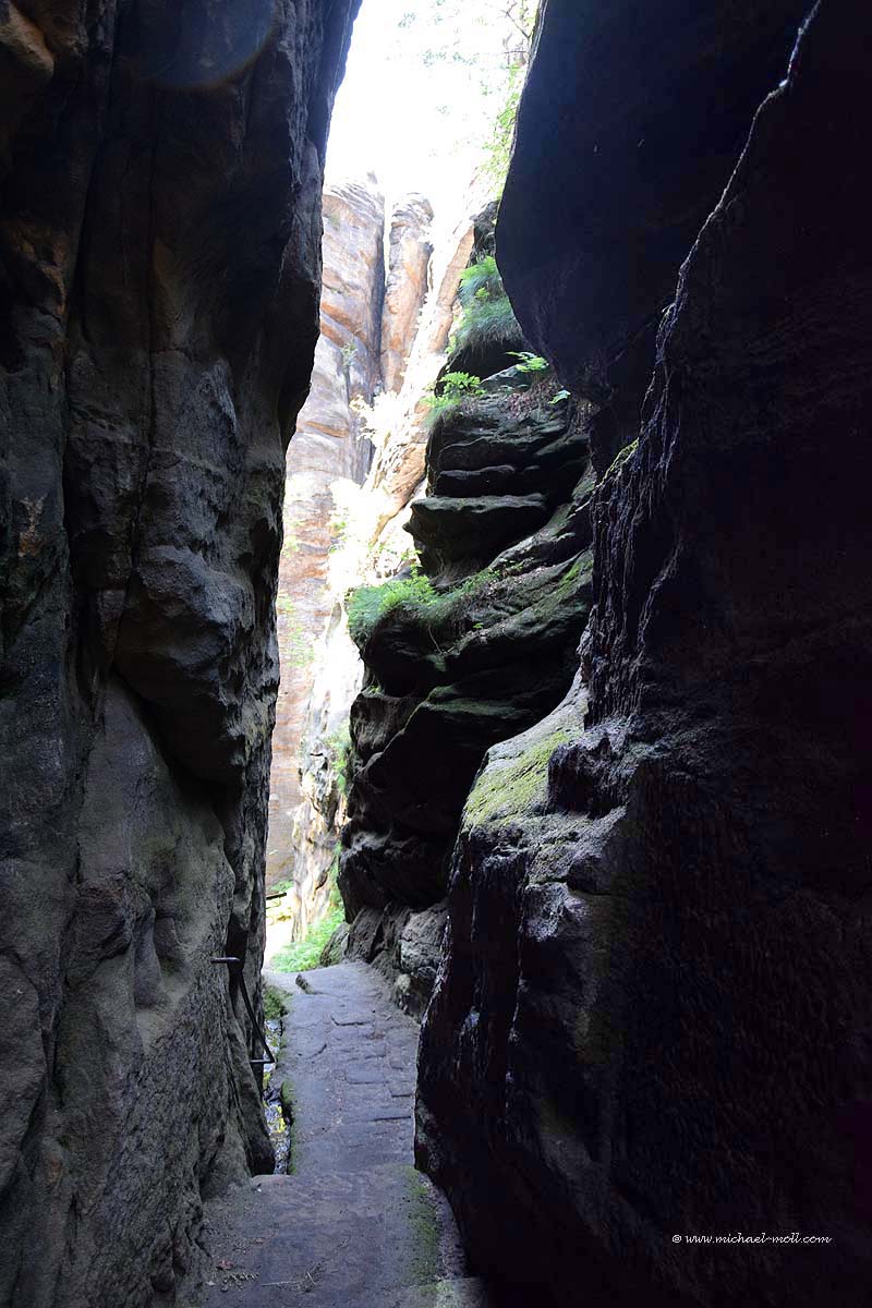 Gleich am Anfang kann man sich nun entscheiden, ob man rechts herum dem Normalaufstieg folgt oder halblinks durch den dunklen Wald die zahlreichen Treppen auf sich nimmt. Wer mich kennt, weiß, dass mir die Entscheidung bei so etwas nicht schwer fällt. Die ersten Stufen fallen noch recht breit aus, doch je höher man kommt, umso schmaler werden sie, weil der gesamte Platz logischerweise auch enger wird. So eng, dass man nachher auf einer Steigleiter unter einem Felsen hindurch klettern muss. Da schrappt der Tagesrucksack schon mal am Felsen entlang.