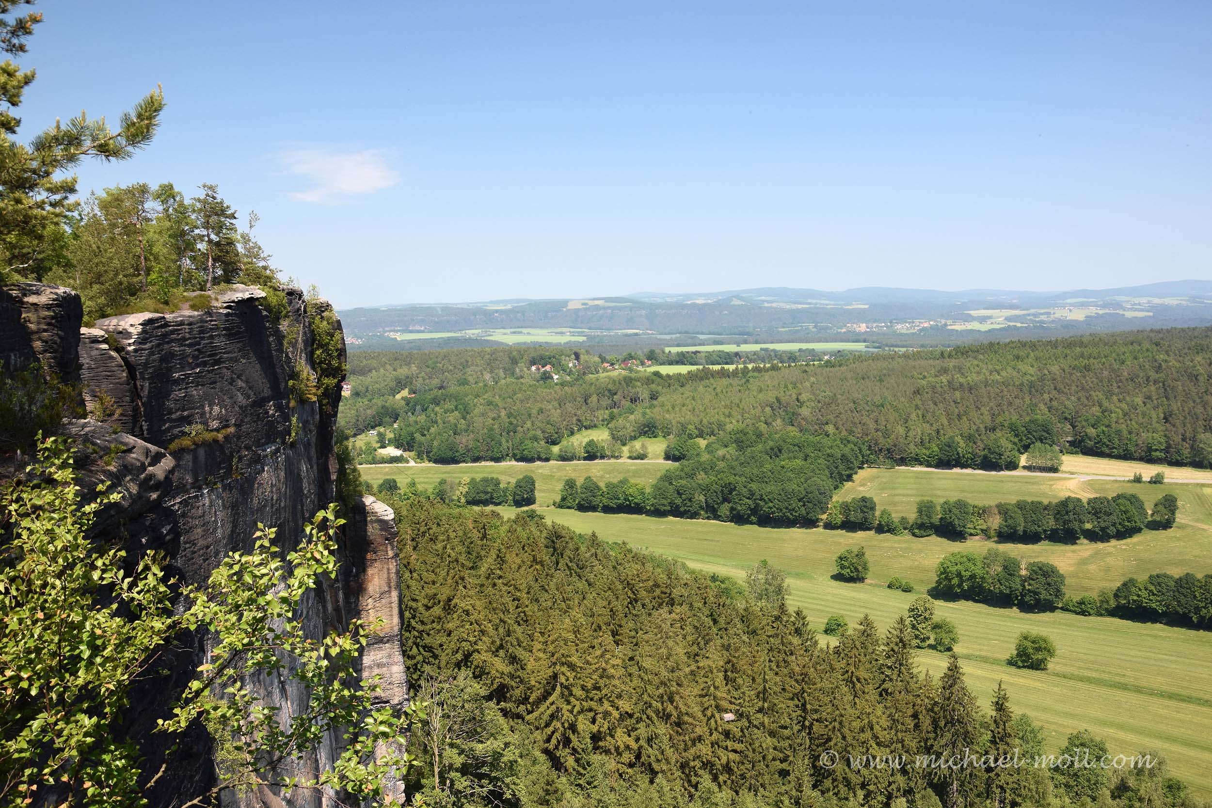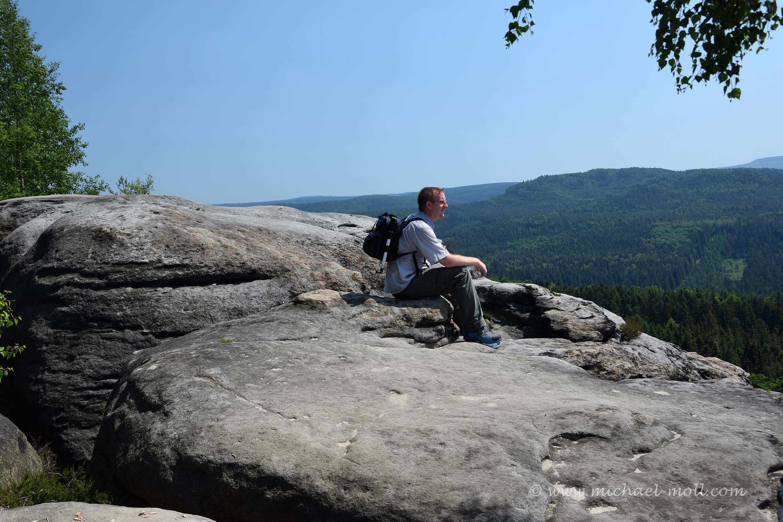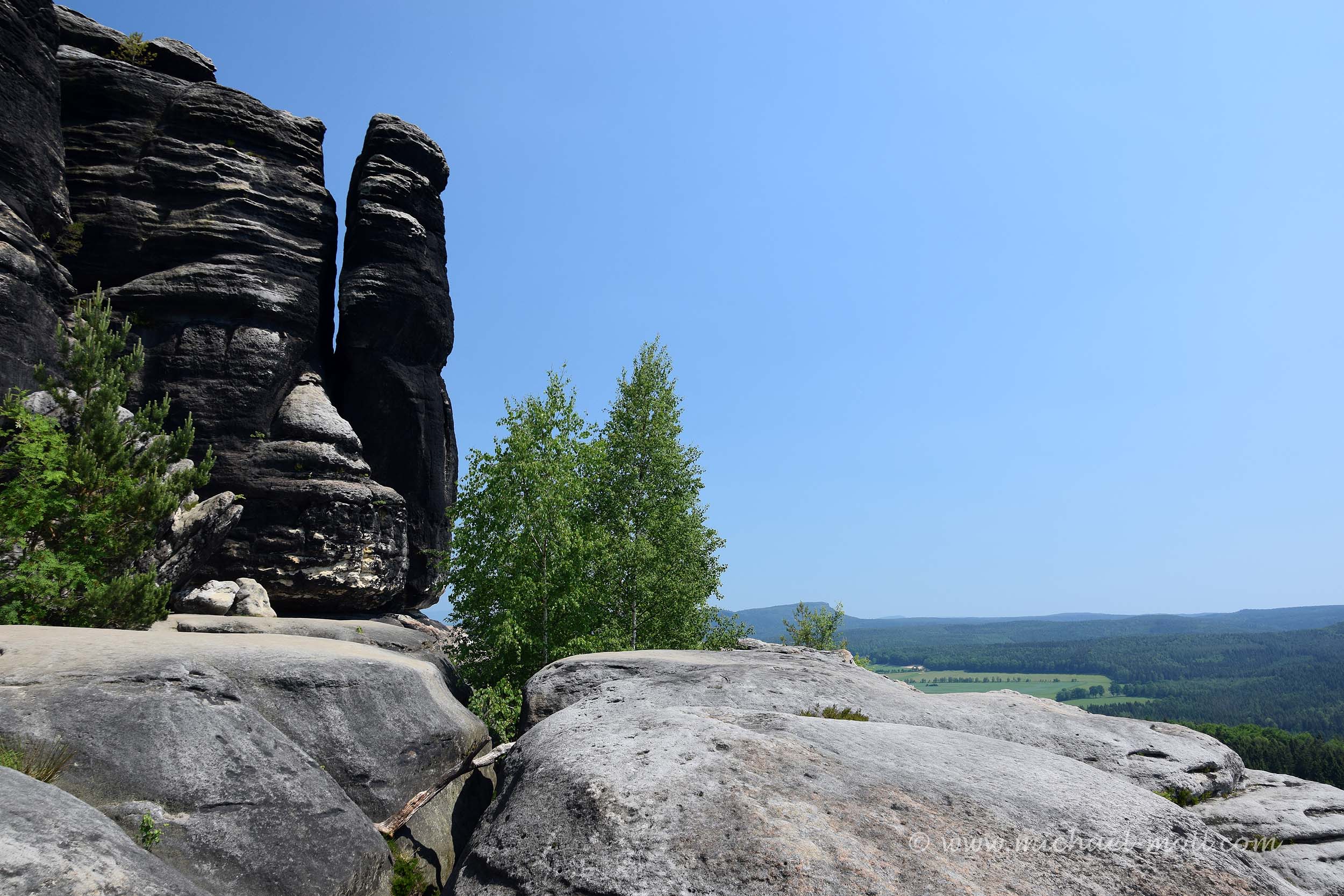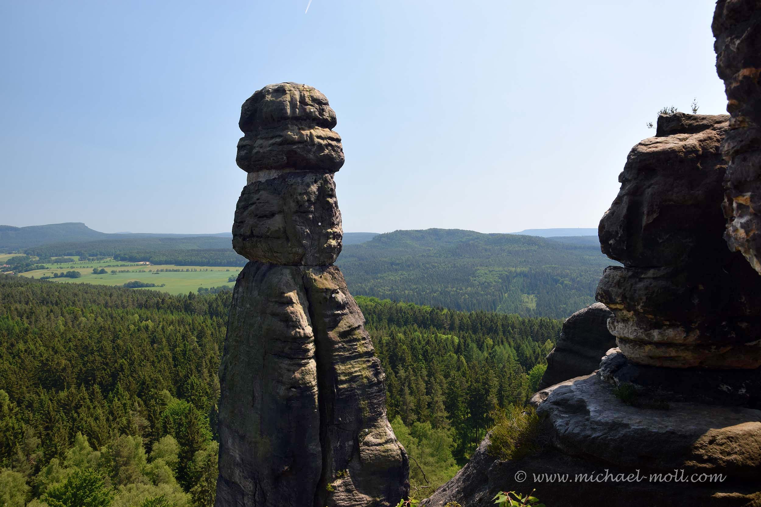 Ist man aber erst einmal oben, gibt es mehrere Aussichtspunkte, eine Gaststätte (an der es seltsamerweise sehr unappetitlich roch) und ein Aussichtsturm. Letzteren haben wir uns verkniffen und sind geradeaus weiter zur Barbarine, wo man dann weitere Engstellen zu passieren und Gegenverkehr durch andere Wanderer abzuwarten hat. Schließlich steht man vor der Barbarine und kann sowohl dort als auch auf den nahe gelegen Felsen eine wunderbare Aussicht auf die Sächsische Schweiz genießen. Schön ist hier übrigens, dass hier nicht in typisch deutscher Manier alles mit Geländern abgesichert wurde. Wer also einen falschen Schritt macht, fällt in die Bäume des Elbsandsteingebirges hinab.
