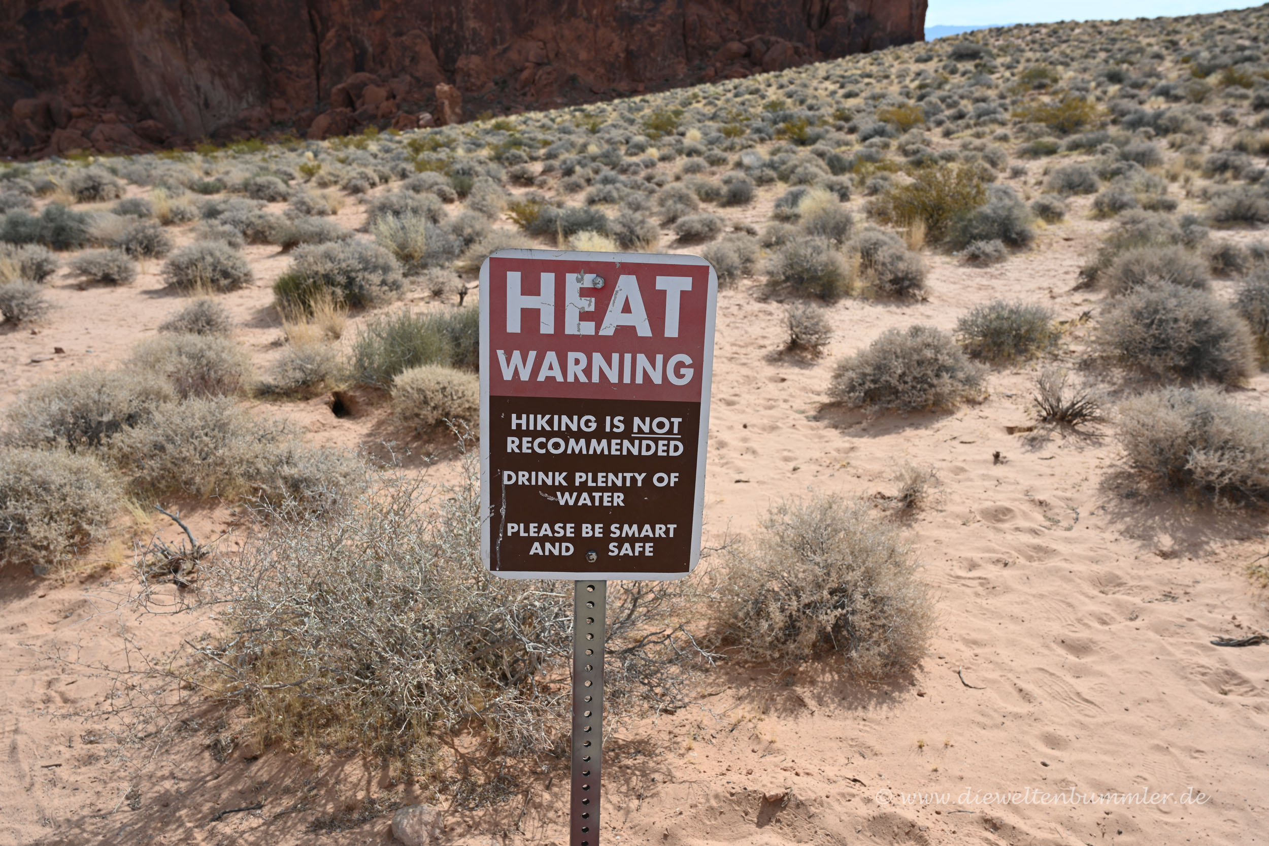 Andere Schilder wiesen darauf hin, dass man auf die Hitze aufpassen solle. Kein Wunder, man ist ja in der Wüste unterwegs und die Temperaturen sind tatsächlich nicht zu unterschätzen, auch wenn die Fire Wave nicht sonderlich weit vom Parkplatz entfernt ist.