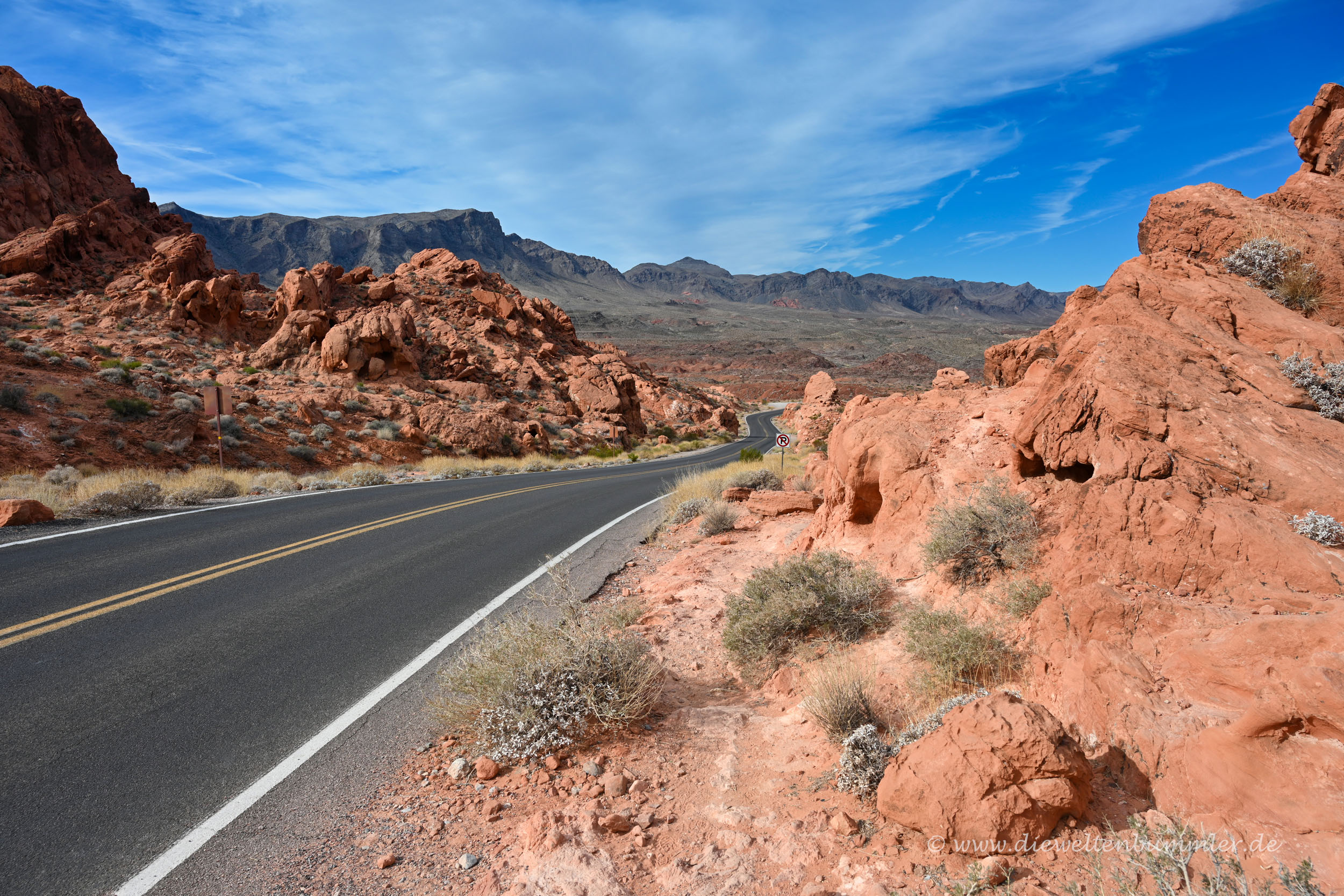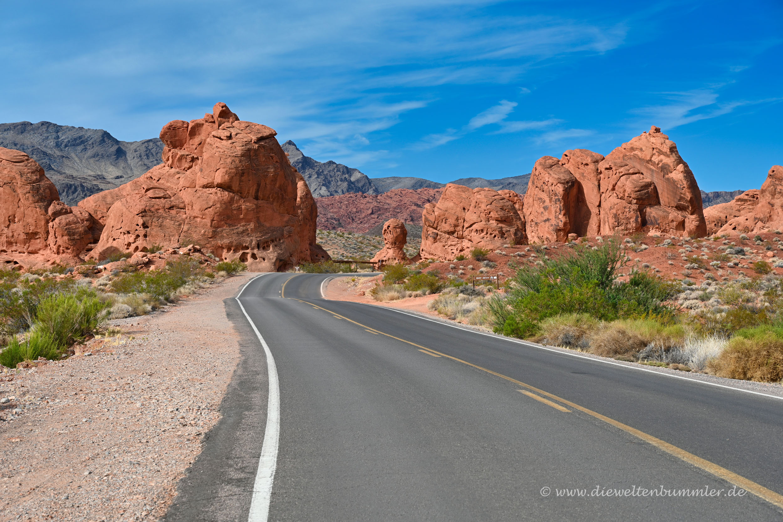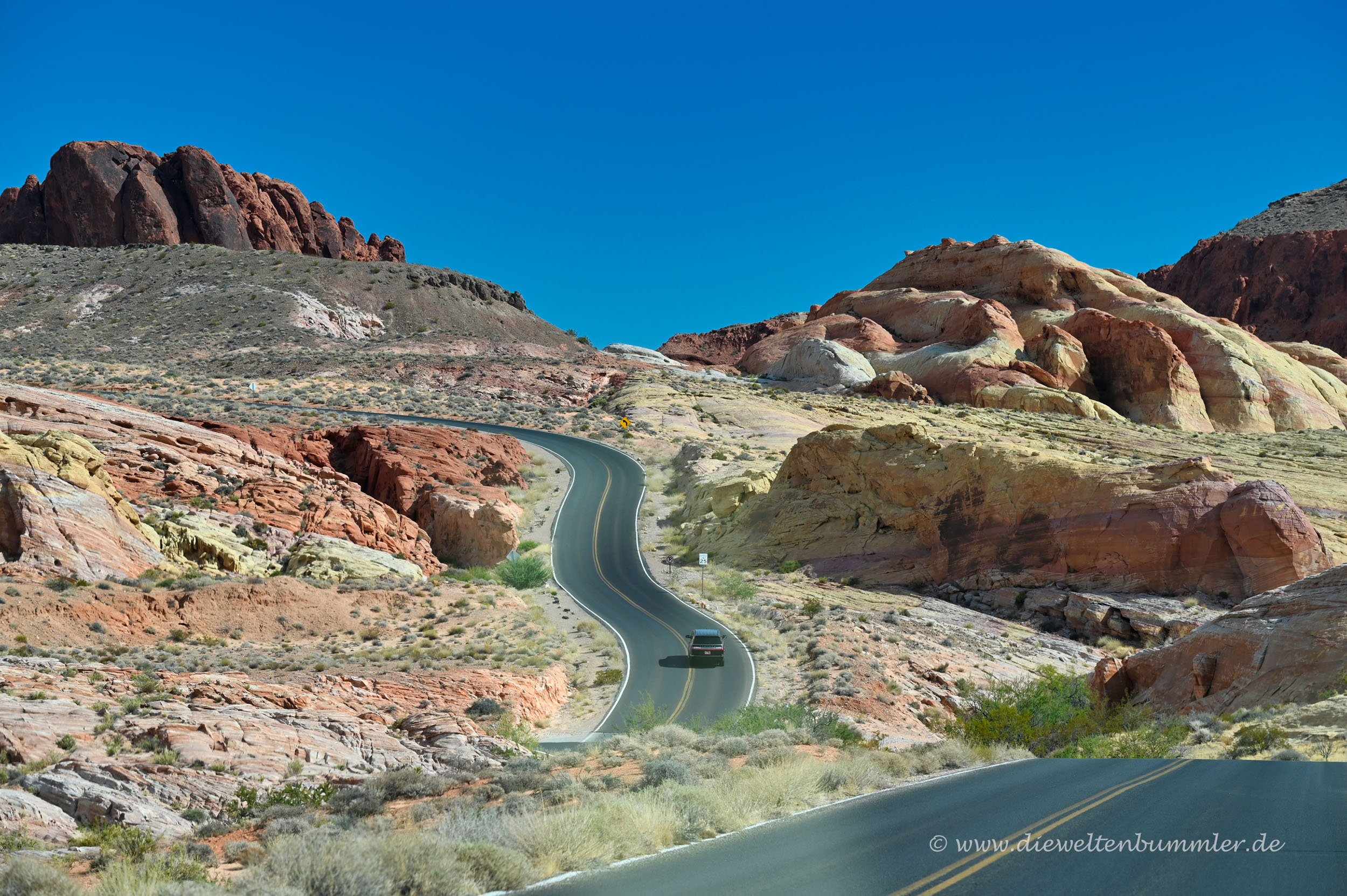 Im Süden des US-Bundesstaates Nevada befindet sich das Valley of Fire bzw. der Valley of Fire State Park. Er liegt nahe der Interstate 15 ziemlich gut erreichbar zwischen Las Vegas und dem Dreiländereck von Nevada, Arizona und Utah. Wer sich von Osten, also von Arizona nähert, der verlässt die Interstate 15 kurz hinter der Staatsgrenze, um auf den Highway 169 nach Süden abzubiegen.