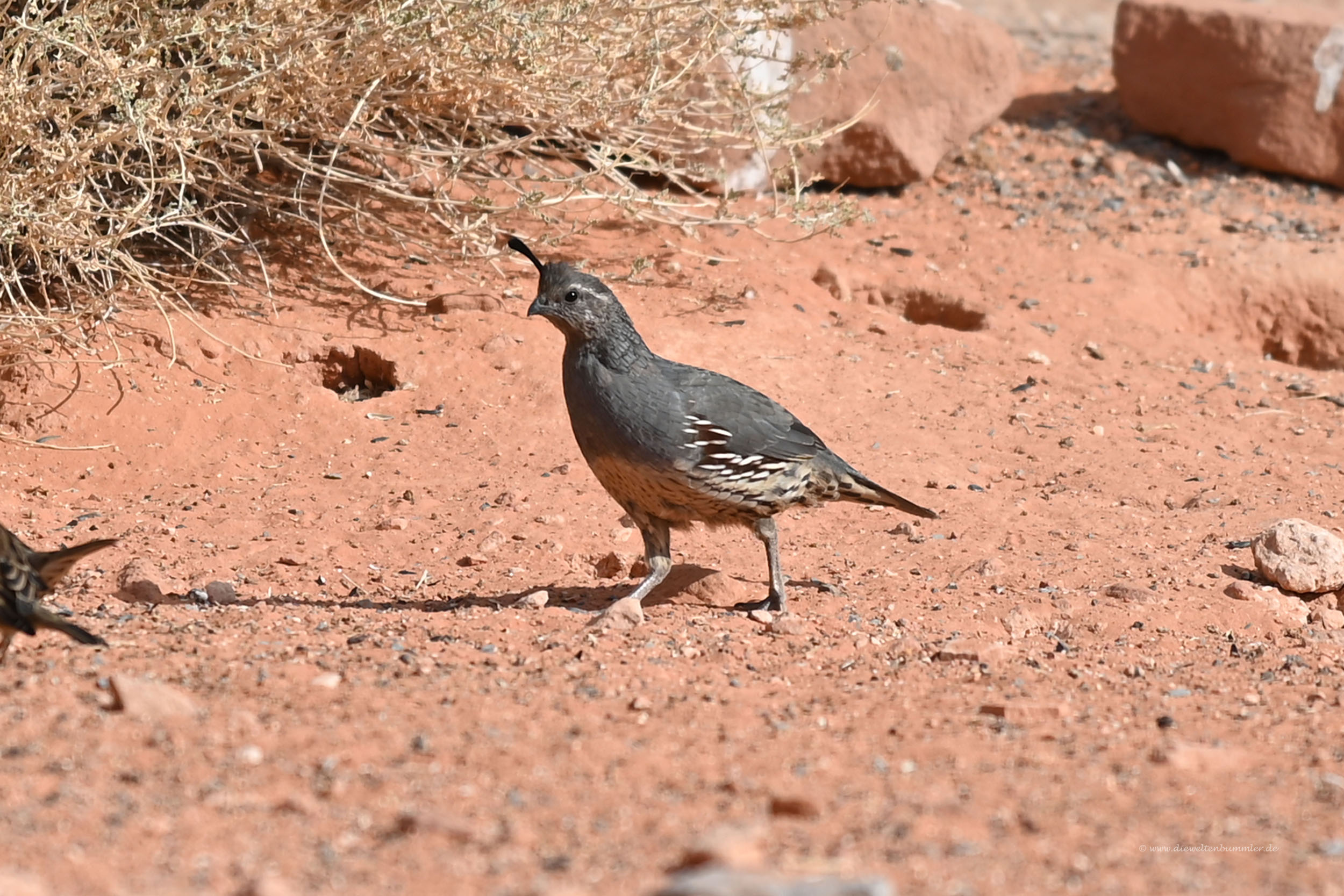 Hinter dem Haus konnte man wiederum eine Vogeltränke sehen, die von Helmwachteln aufgesucht wurde. Die Helmwachtel kannten wir bis dato nicht und mussten daher auch im Besucherzentrum fragen gehen, wie dieser merkwürdige Vogel mit der markanten Feder am Kopf. Als Antwort erhielten wir natürlich nicht Helmwachtel zu hören, sondern Gambel’s quail. Wieder etwas gelernt.