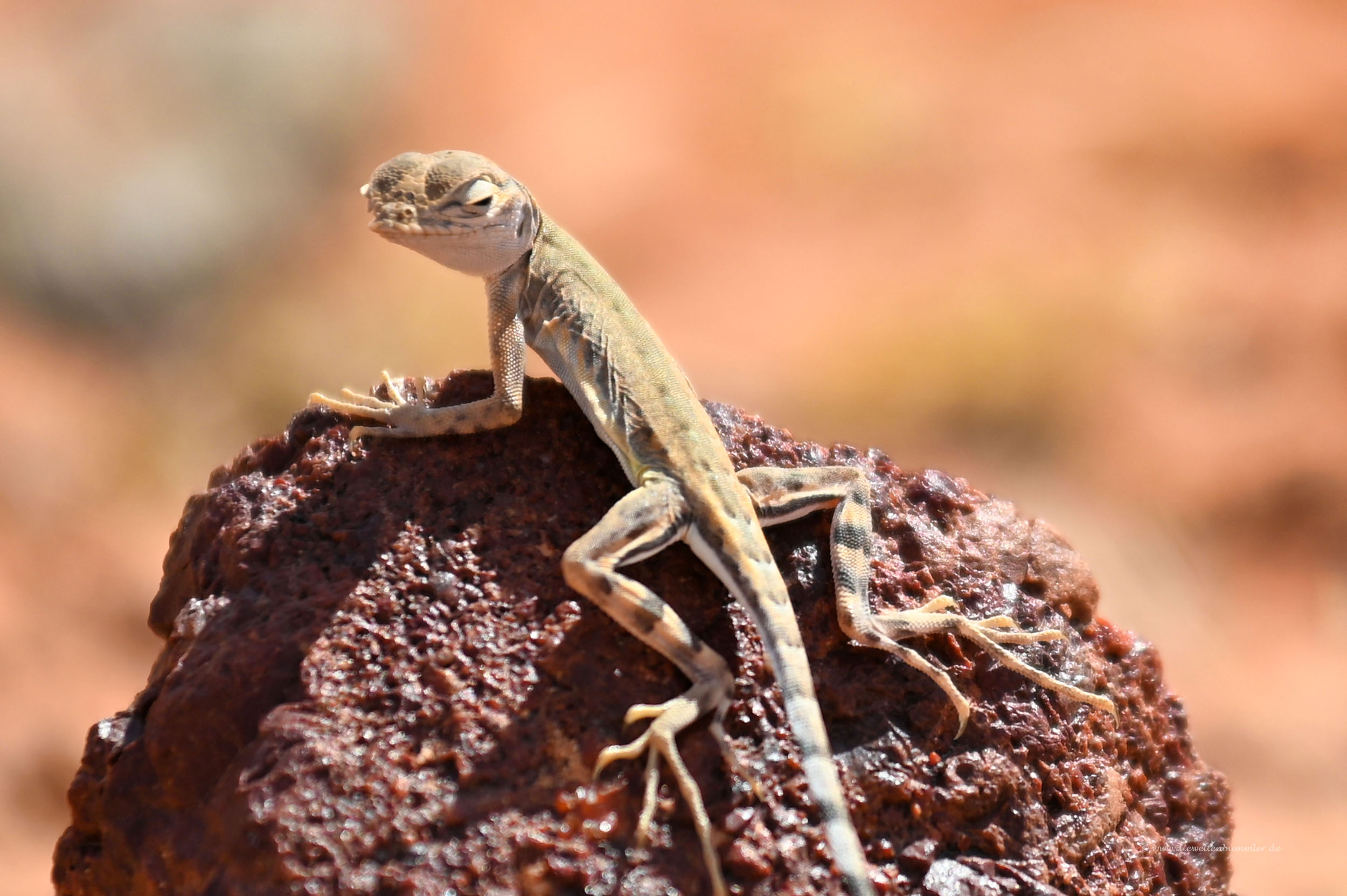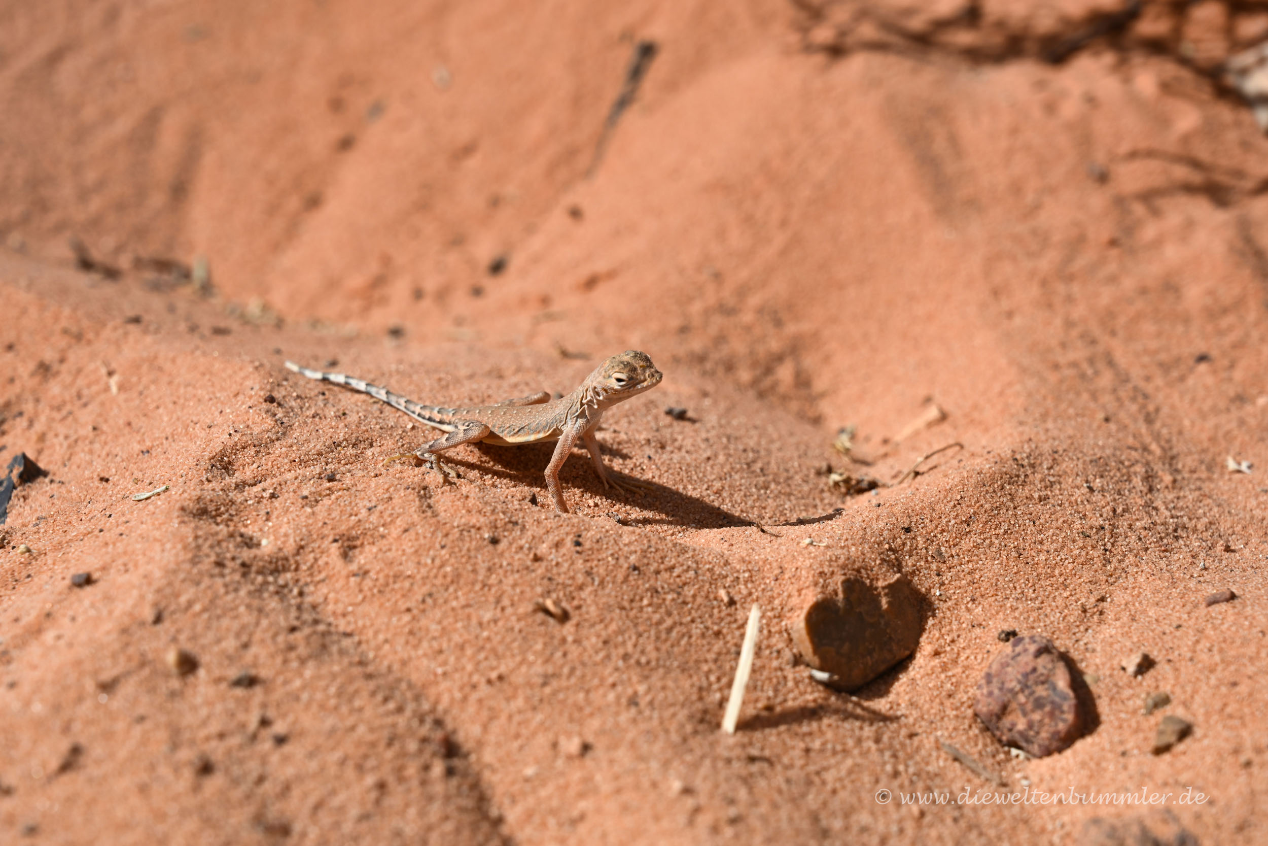 Aber auch die Wanderung zur Fire Wave ist schon schön. Man sieht eben auch viele andere Felsen und hin und wieder die ein oder andere Eidechse, die sich in der Sonne aufwärmt. Verlaufen kann man sich nicht wirklich. Zum einen sind genug andere Touristen vor Ort und zum anderen ist der Weg gut ausgeschildert oder zumindest erkennbar.
