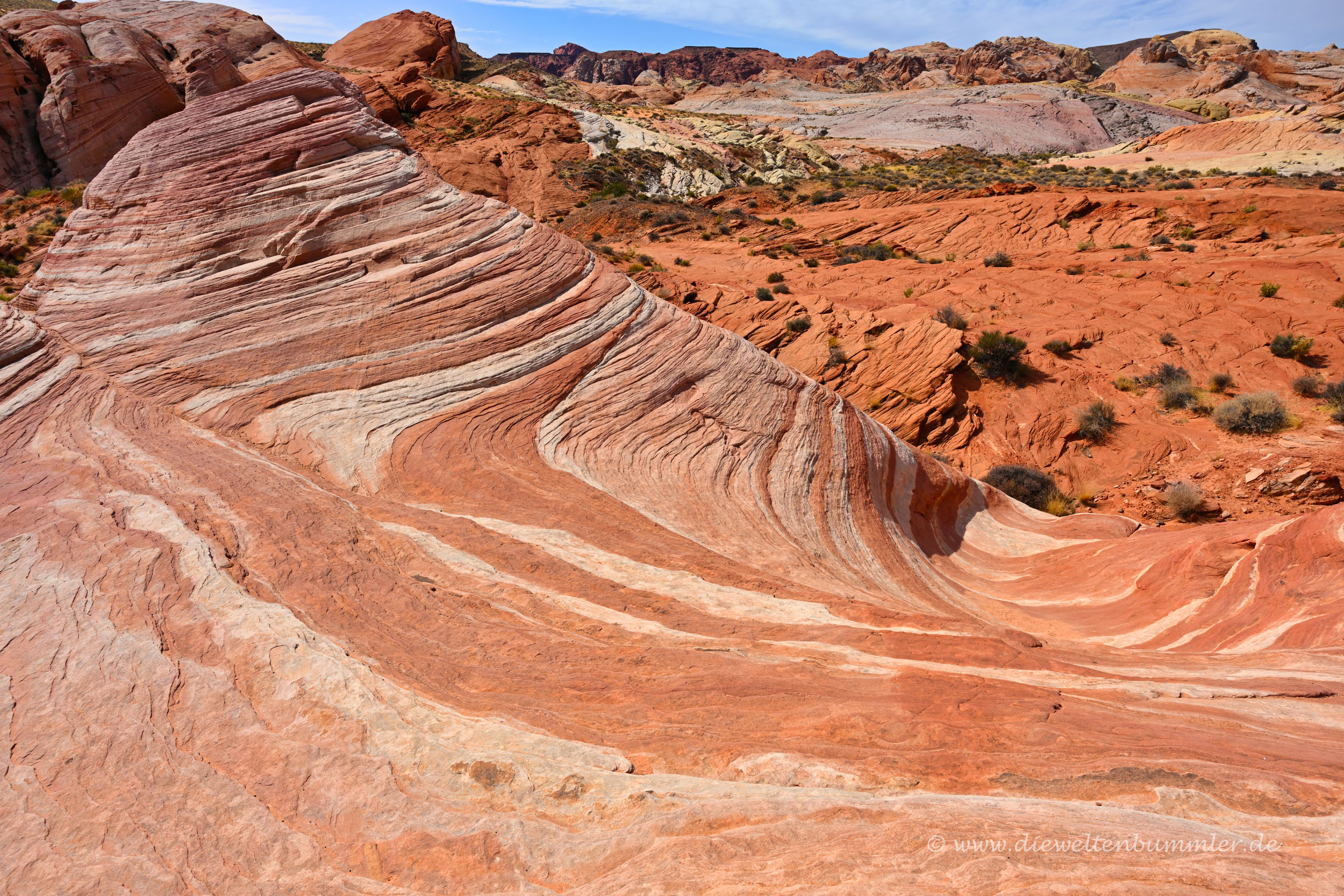 Die Farben schwanken von weiß über orange bis zu rot-braunen Tönen. Darüber hinaus sind manche Felsen dann auch noch sehr auffällig geformt und wirken wie geschliffen. So eben auch der Felsen namens Fire Wave. Er hat die Form einer Welle und präsentiert sich darüber hinaus mit diesen markanten Farben.