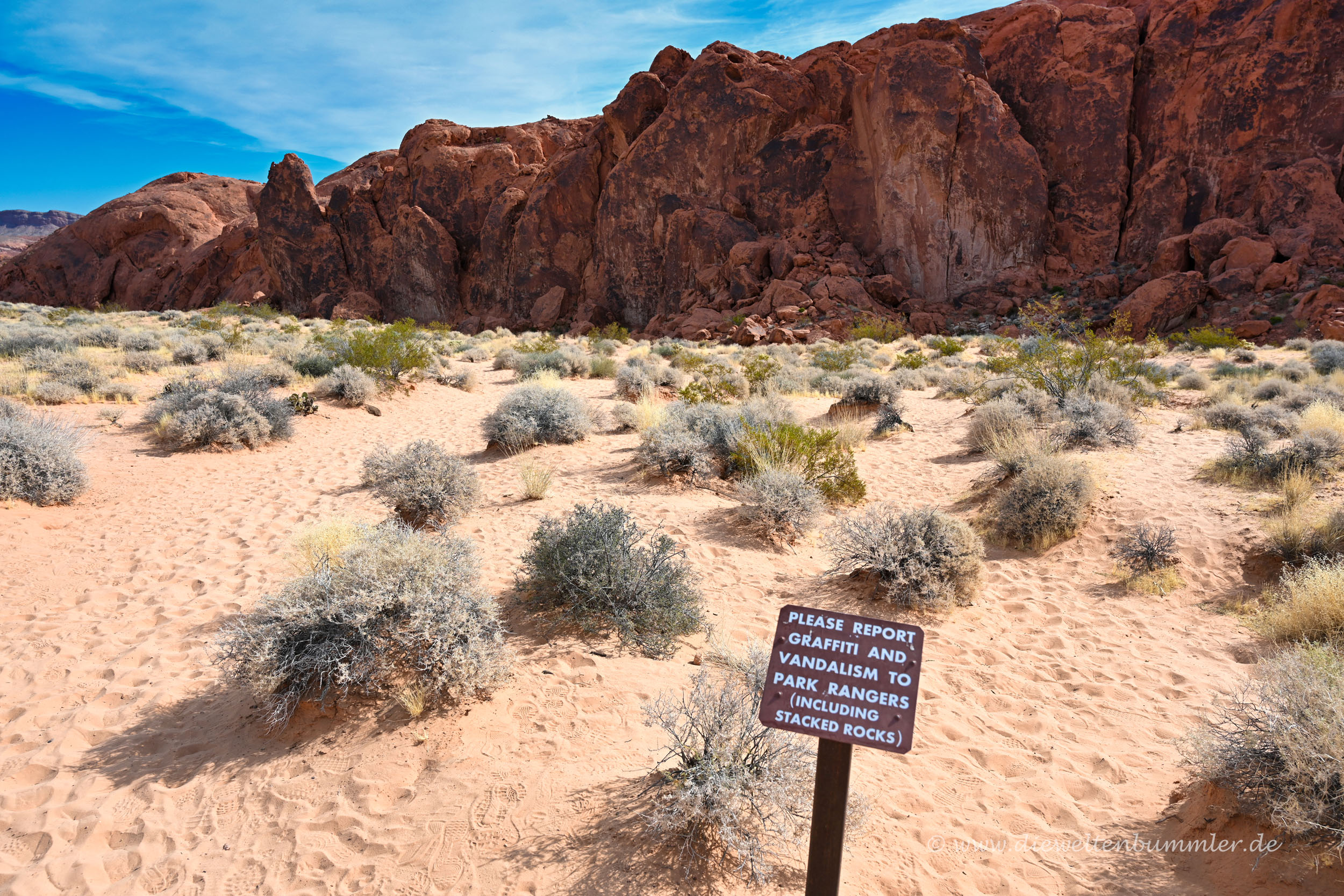 Ein weiteres Schild informiert darüber, dass Graffiti und Felsritzungen natürlich verboten sind und man so etwas den Rangern mitteilen solle. Finde ich gut, denn wir haben schon so oft gesehen, dass die Leute meinen sich irgendwo verewigen zu müssen.