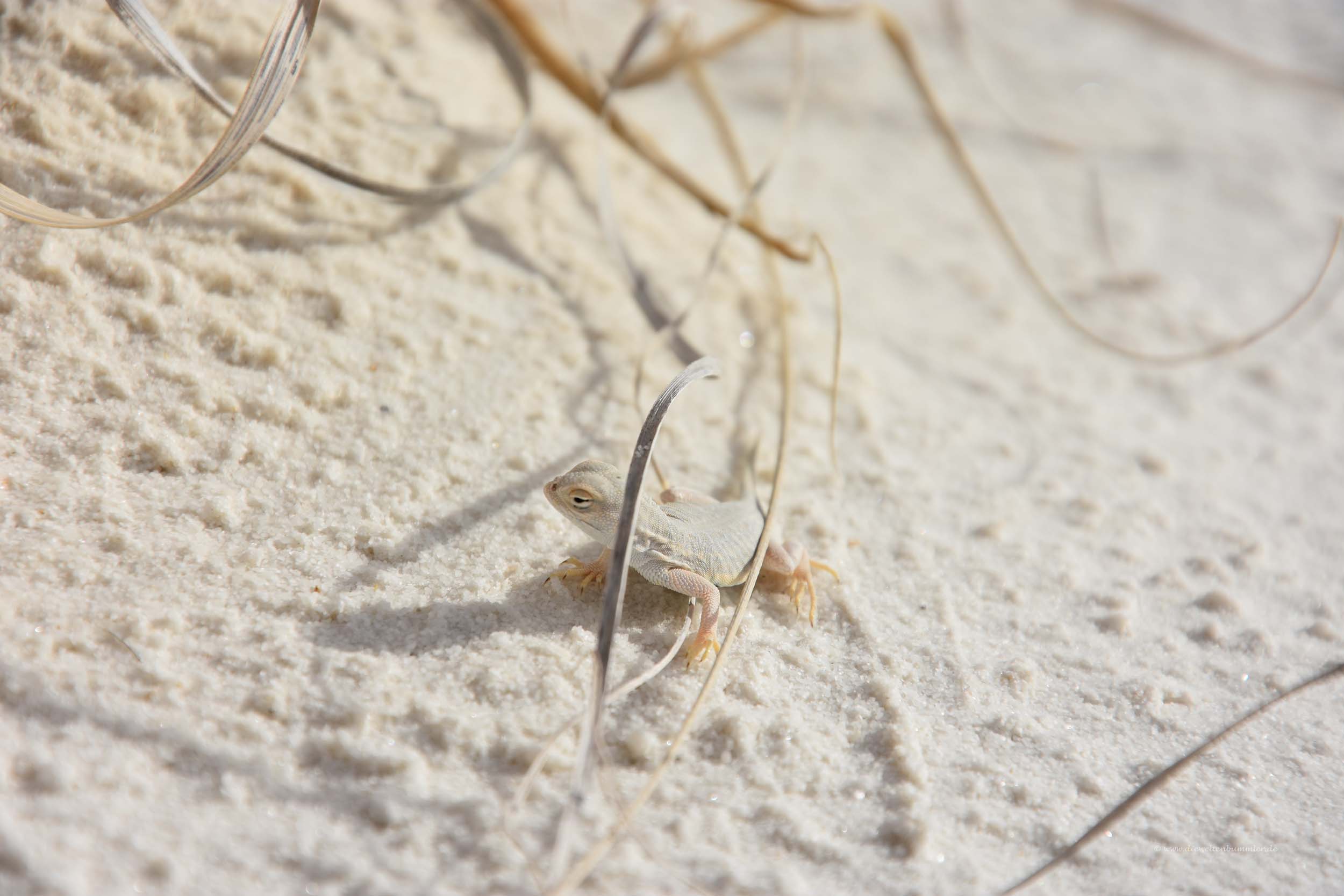 Aber man muss schon genau hinschauen und sehr viel Glück haben, um die Echsen zu sehen, die über den Sand huschen und sich unter den Gebüschen verstecken. Denn sie haben sich der Farbe ihrer Umgebung ideal angepasst. Sie sind ebenfalls weiß und heißen dementsprechend White Lizard. Tolle Tiere in einer tollen Umgebung.