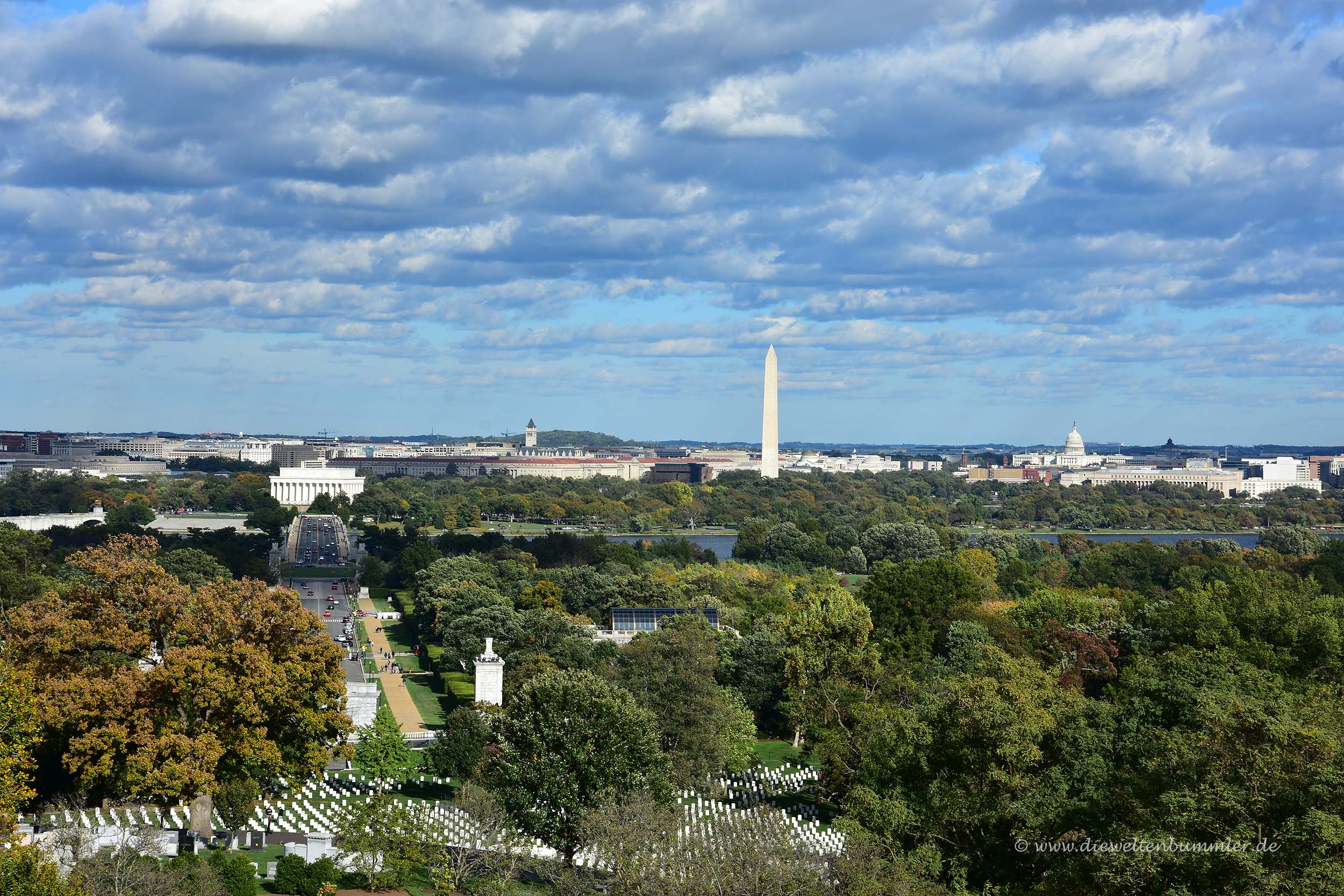 Nur wenige Meter davon entfernt schaut man auf die amerikanische Hauptstadt Washington D.C. Sie befindet sich gleich auf der anderen Seite des Potomac River. Ich hatte schon in der Beschreibung zum Stadtrundgang durch Washington geschrieben, dass man am Friedhof wunderbar parken kann, um von dort über die Brücke zum Lincoln Memorial zu gelangen. Den Weg erkennt man gut auf dem Bild.