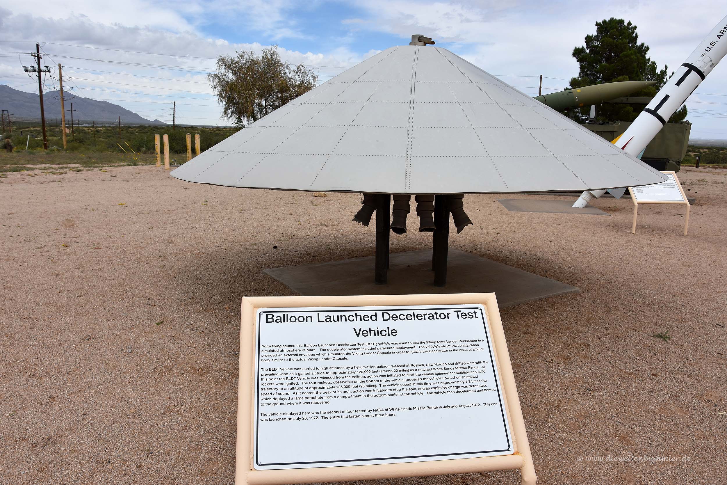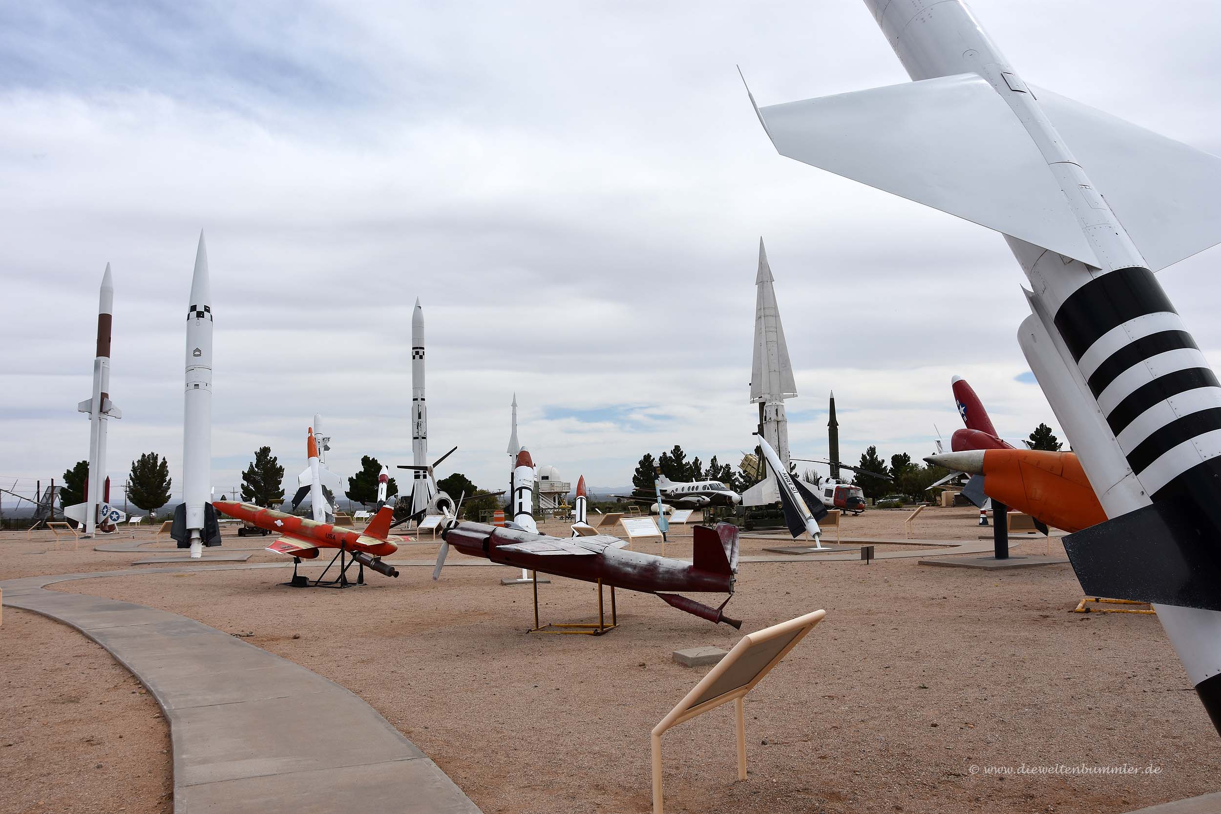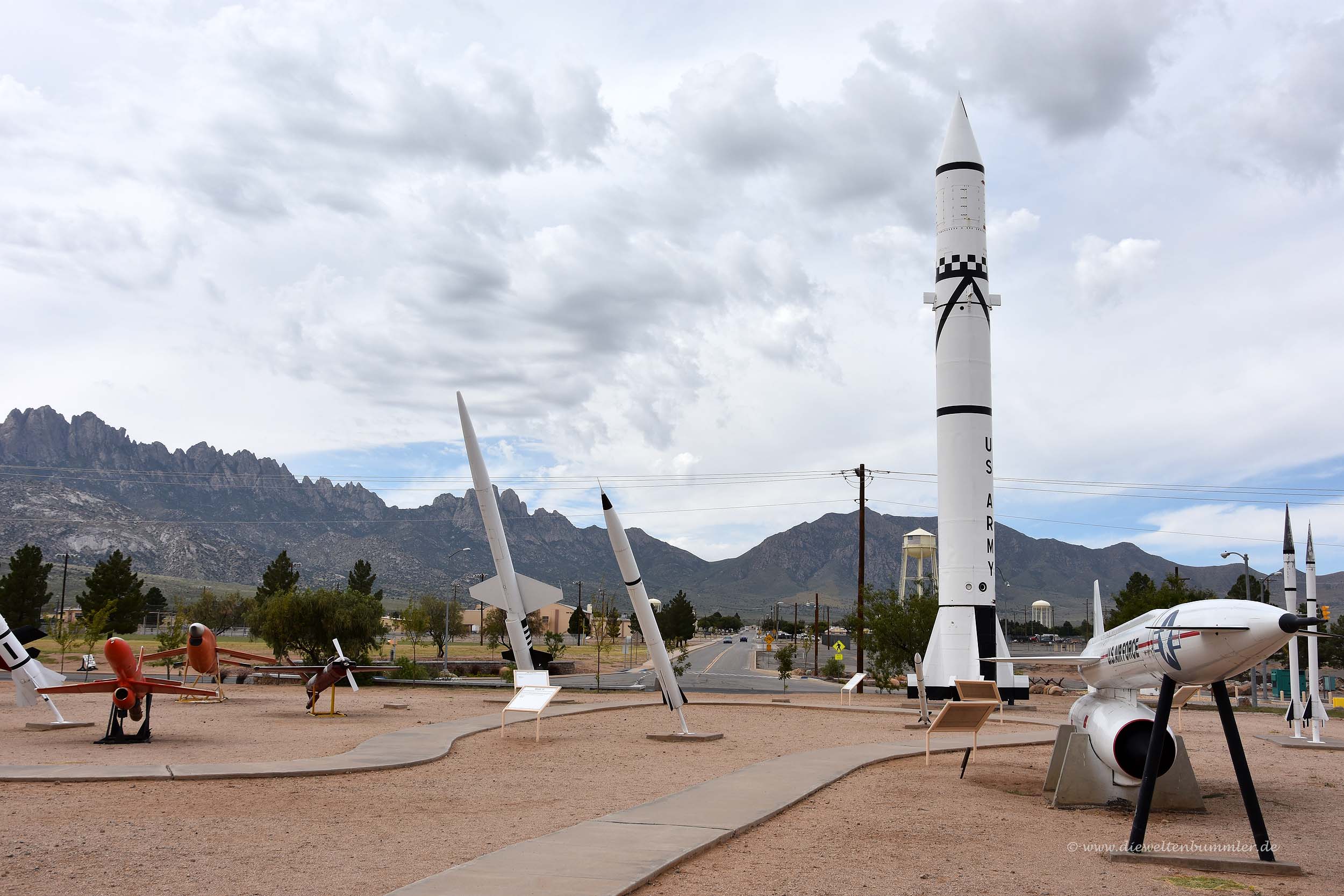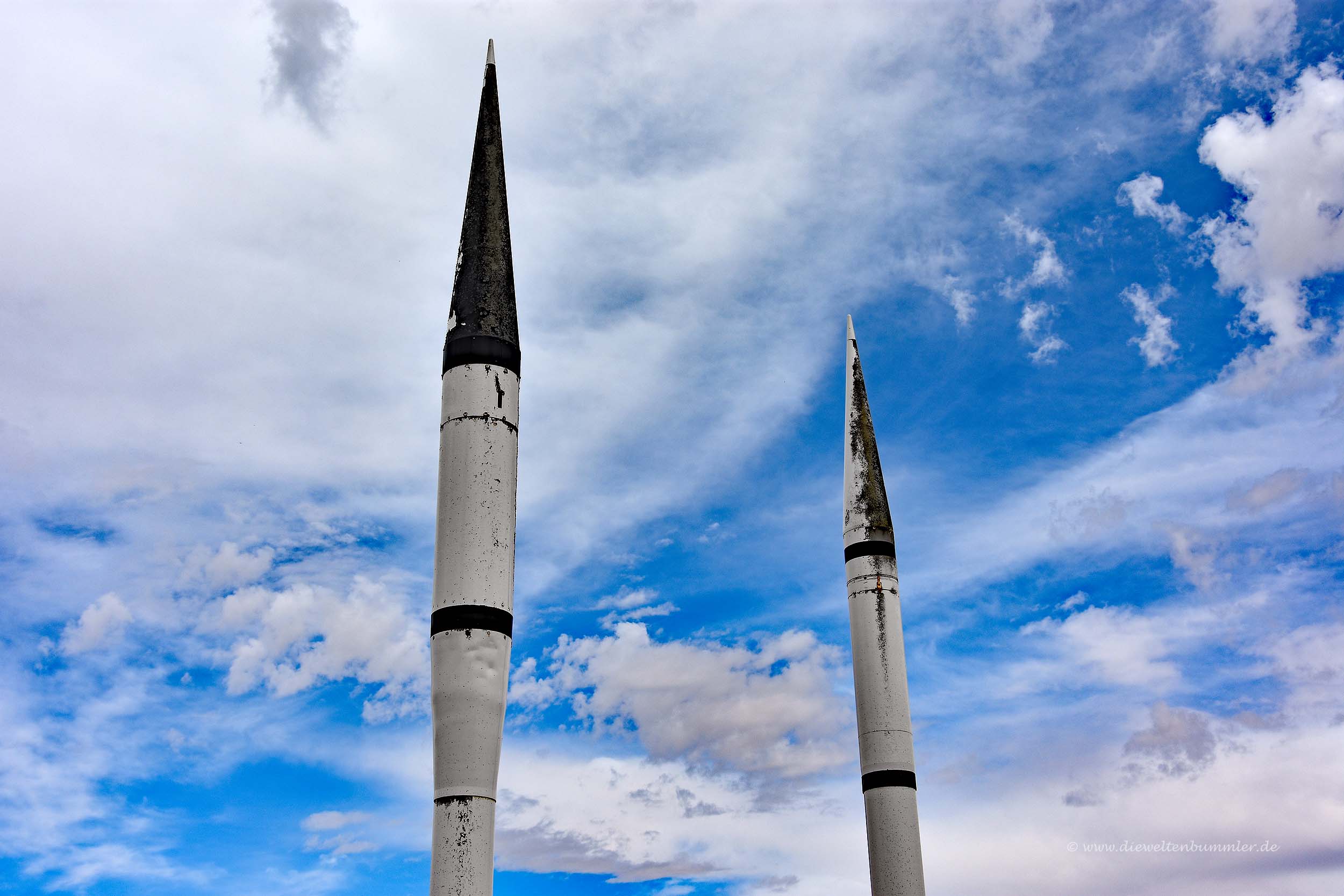 Wir waren so ein wenig im Zwiespalt als wir auf dem Highway fuhren und sich die Abfahrt zur Militärbasis näherte. In einer Broschüre, die wir im Welcome-Center von New Mexico erhielten, stießen wir auf den Hinweis, dass es auf der Basis einen sogenannten Rocket Garden gibt. Der Name ist viel zu harmlos, denn unter einem Garten verstehe ich etwas anderes als eine Ansammlung von Raketen.