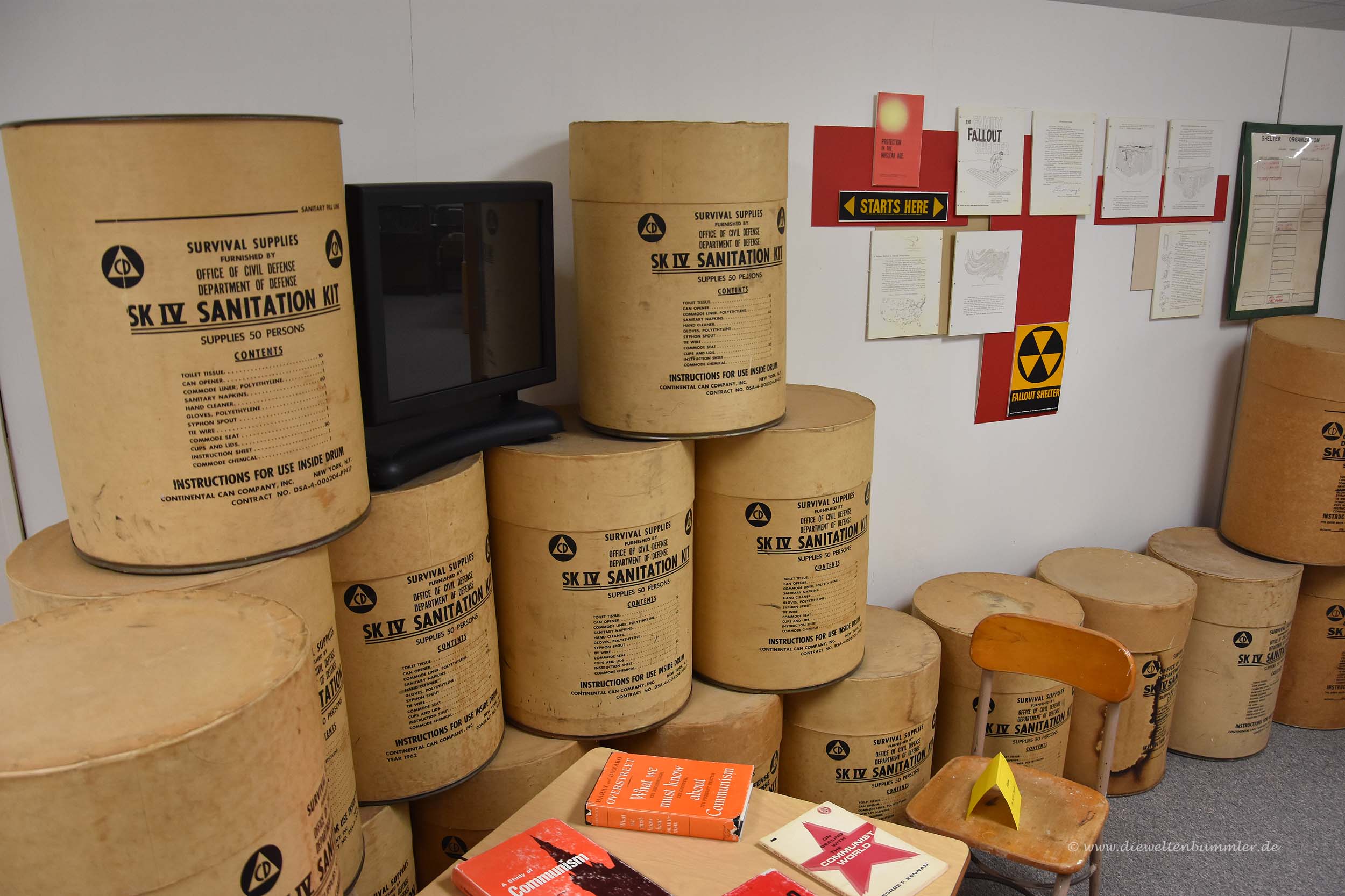 Nach dem kurzen Rundgang betraten wir noch ein kleines Museumsgebäude mit einer überschaubaren Ausstellung. Hier wurden Leute wie Oppenheimer gehuldigt, die mit für den Bau der Atombombe verantwortlich sind. Außerdem gab es Informationen darüber, wie man sich vor einem Atomschlag schützen könnte. Zumindest wie man es in den 1950er-Jahren glaubte. Interessant waren jedoch die Bilder, die die zivile Nutzung von Raketen zeigten.