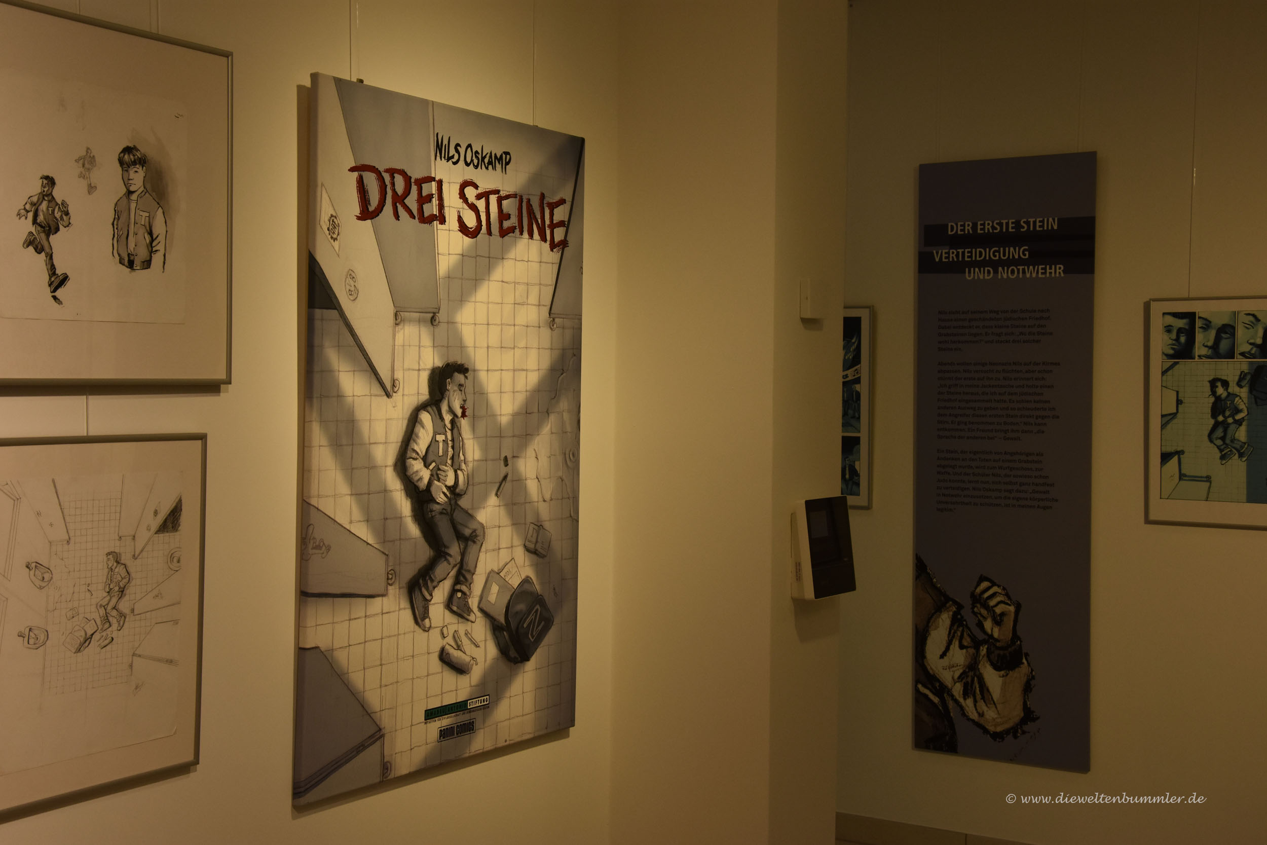 Gleich nebenan gab es eine weitere Ausstellung zu Nils Oskamps Comic Drei Steine. Das Thema, das er mit diesem Comic anspricht, ist aktueller denn je. Es handelt sich um eine autobiographische Graphic Novel zur rechten Gewalt. Näheres hierzu findet man im Netz auch unter #adolfduck. Treppauf wandeln wir in die oberen Räume des Museums, wo uns mehrere Schnäbel begrüßen und wir in einem Kino mehr über die Geschichte des Comics erfahren. Staun.
