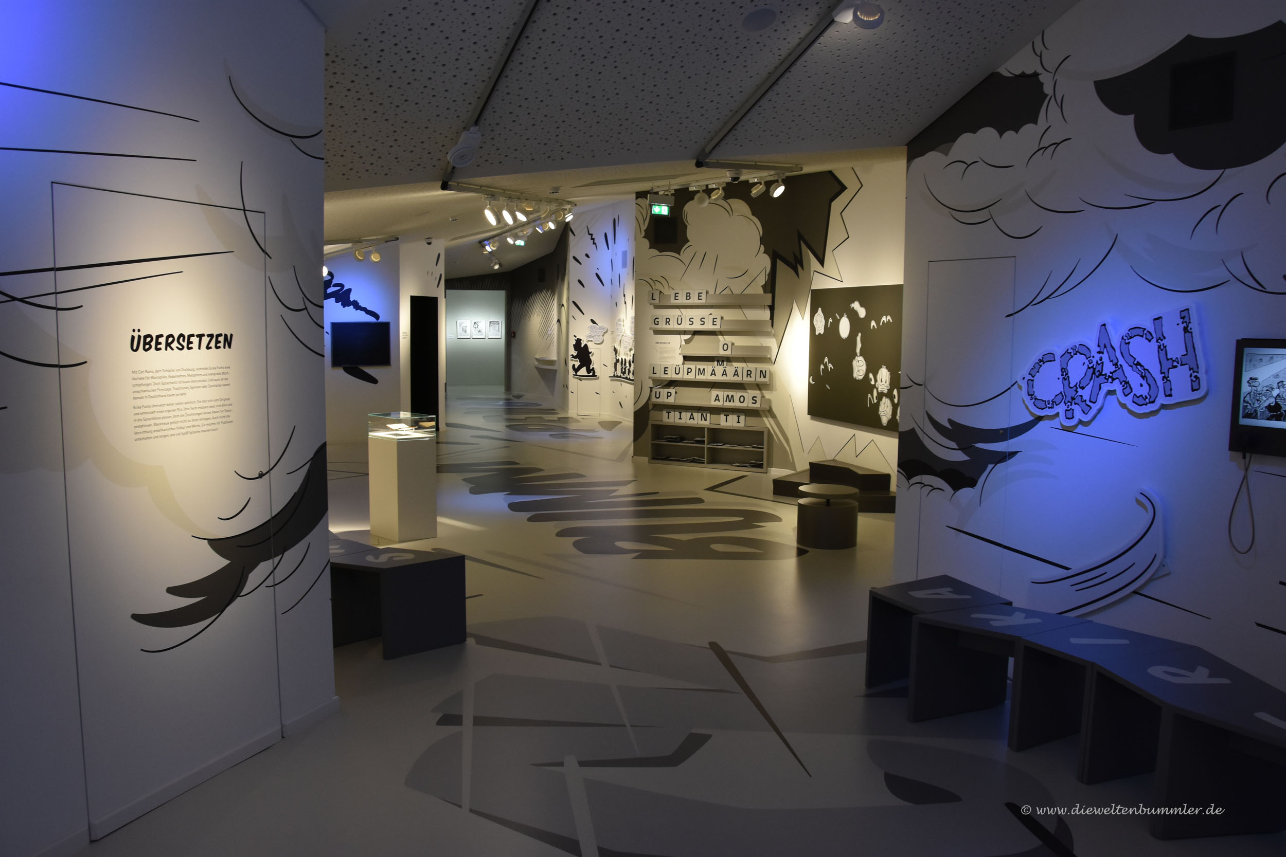 Als überdimensionaler Comic wird anschließend das Leben von Erika Fuchs dargestellt und auf ihr Wirken und ihre Werke eingegangen. In diesem Zusammenhang kann man sich auch interaktiv selber als Wortschöpfer beweisen. Stichwort Zitatwirbler und Wortgenerator.