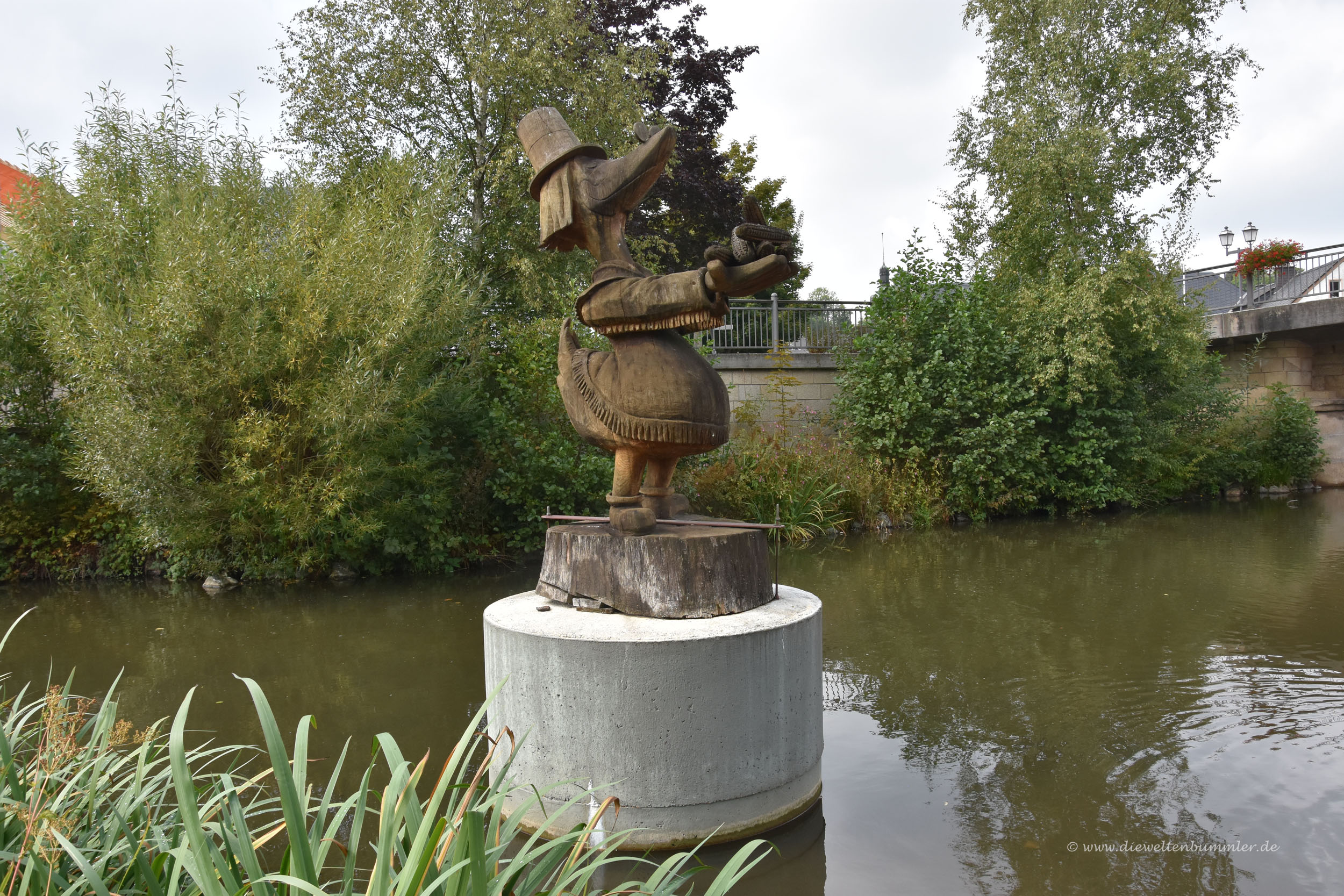 Wir überquerten die Gumpe Sächsische Saale, wo ich von der Brücke höchstbeglückt auf eine kleine Insel blickte. Vor der Insel erhebt sich nämlich die Holzskulptur von Emil Erpel, dem berühmten Gründer von Entenhausen. Ganz klassisch und stolz hebt er ein paar Maiskolben in die Lüfte.