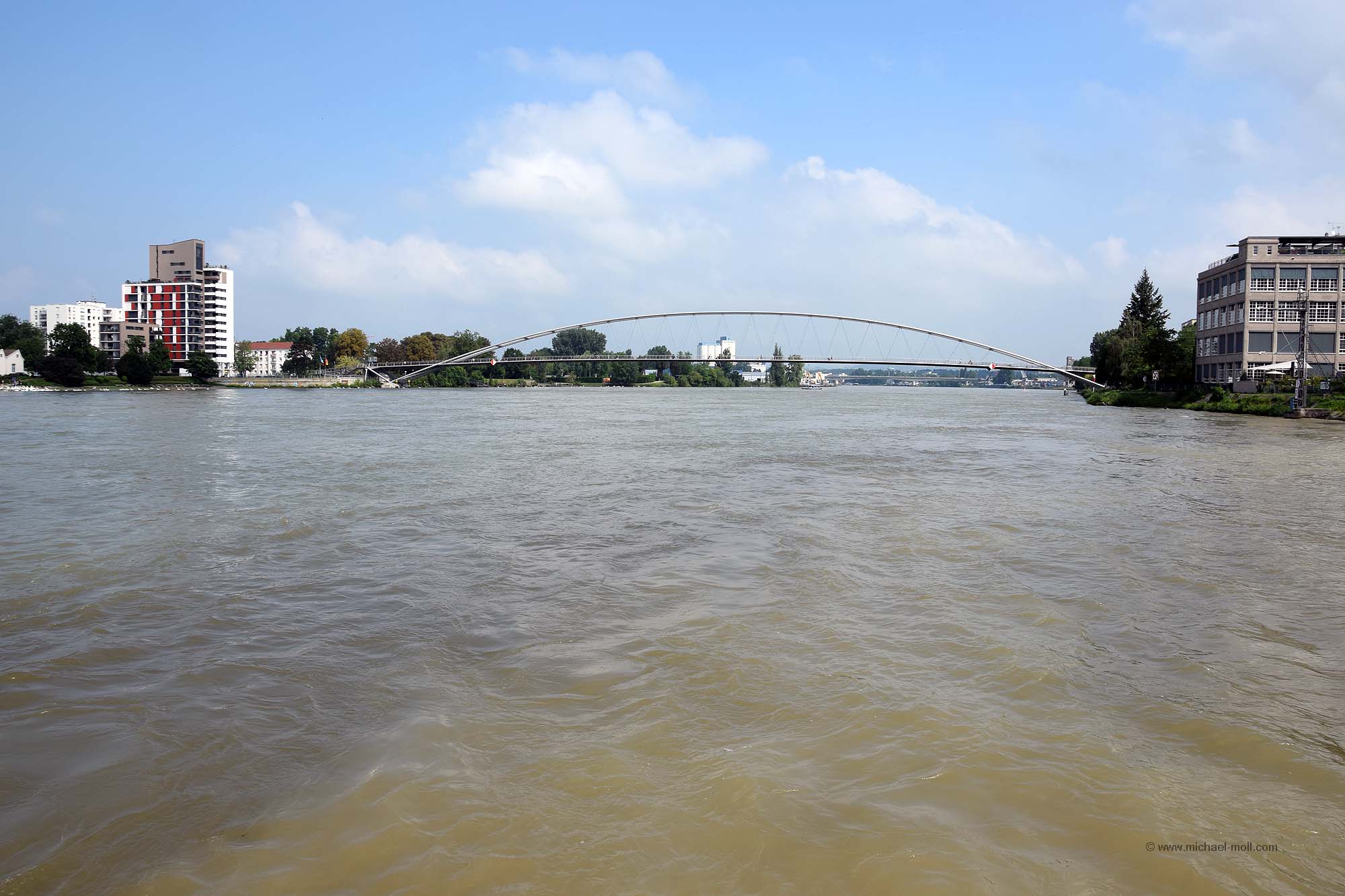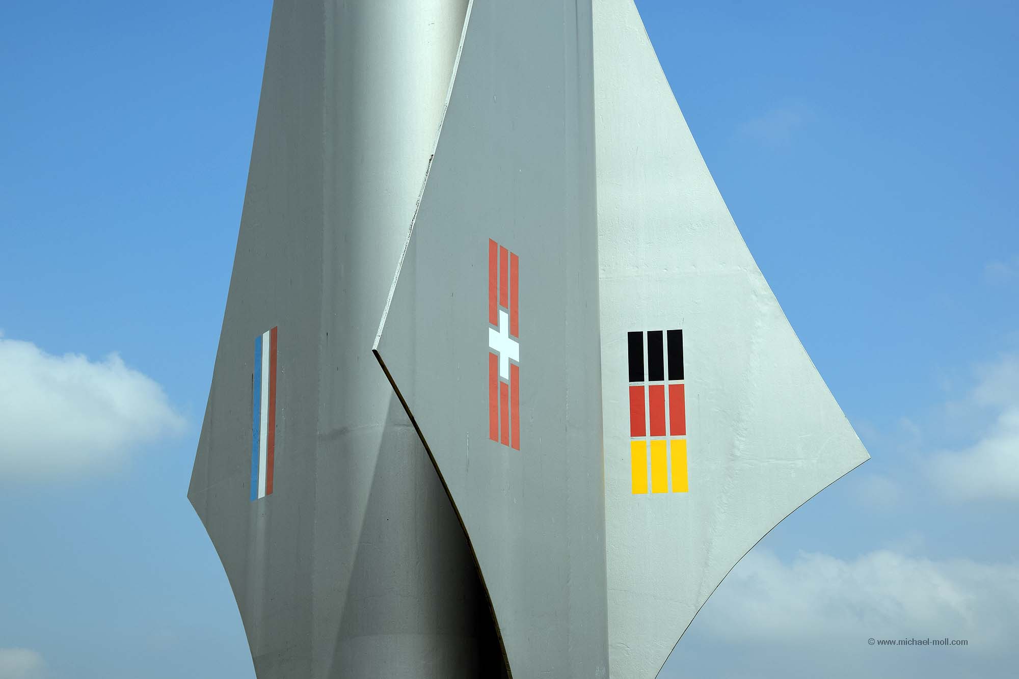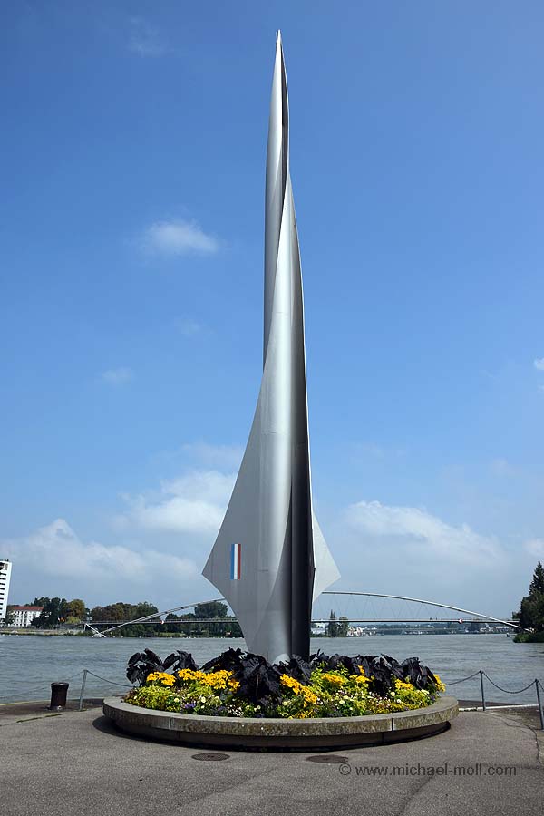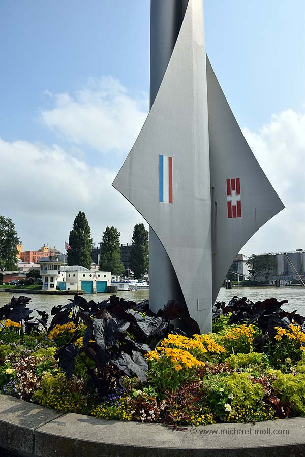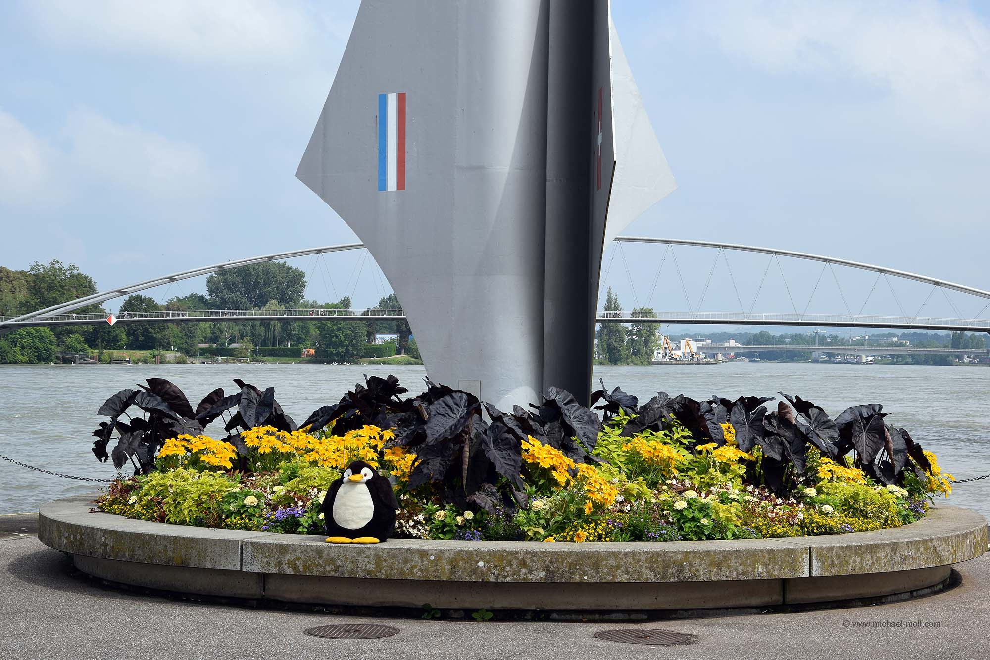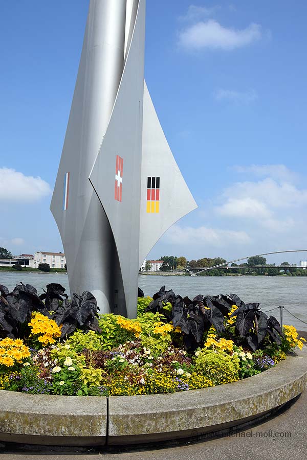 Nach Frankreich gelangt man an dieser Stelle nicht trockenen Fußes, denn dafür müsste man zunächst zwei Kilometer weiter südlich über die Brücke den Rhein überqueren. Auch nach Deutschland ist der Weg ein wenig umständlich, denn das Denkmal befindet sich auf einer Art Landspitze, während sich rechter Hand ein Hafenbecken befindet. Dafür müsste man also erst den Hafen umrunden. Zwischen Deutschland und Frankreich gibt es wiederum eine Brücke, die sogar nach dem Dreiländereck benannt wurde. Doch hat sie keinen Kontakt mit Schweizer Boden. Also habe ich das sein gelassen und es bei diesem Denkmal des Dreiländerecks belassen.