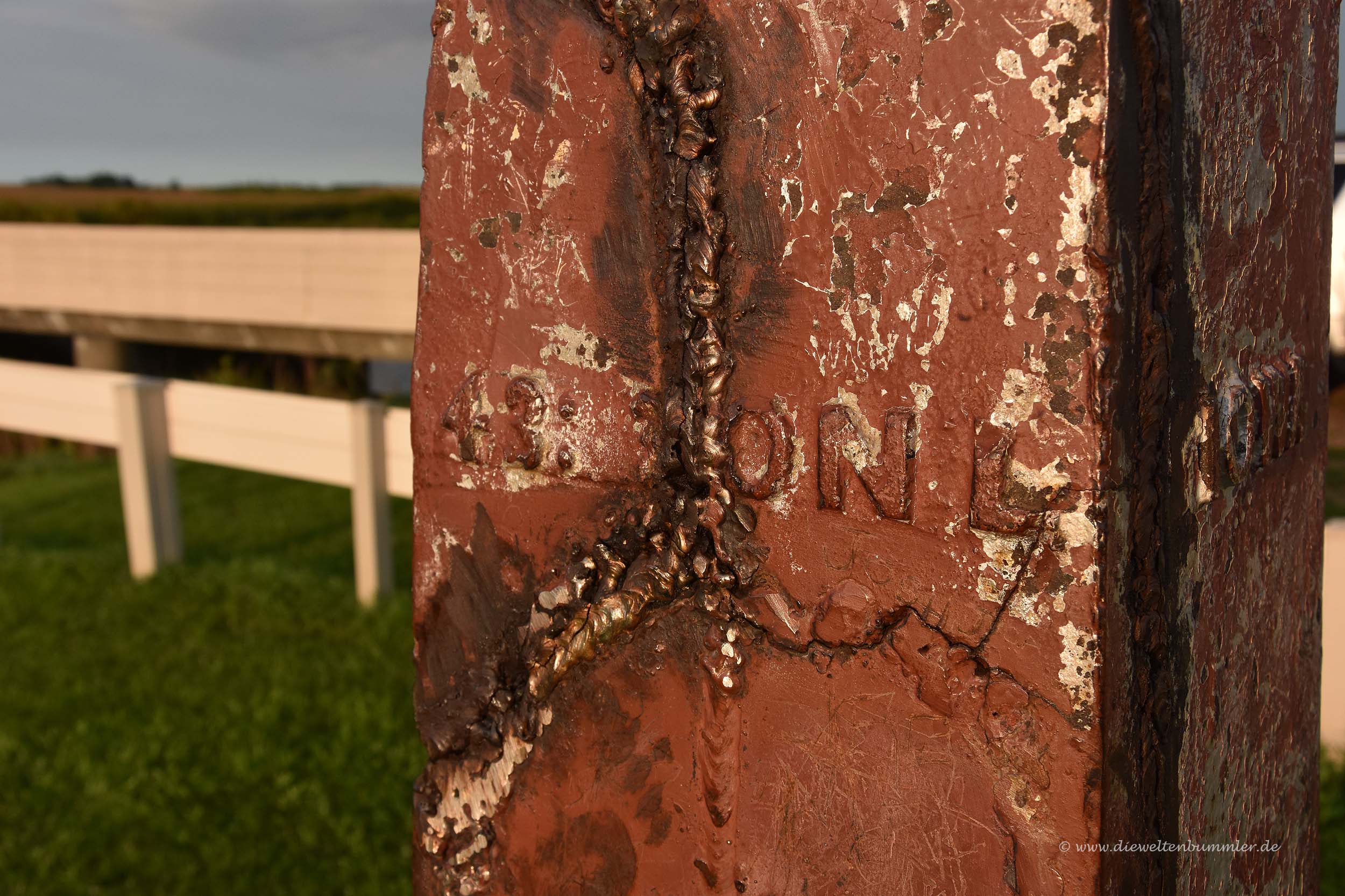 Genauer gesagt befindet es sich direkt auf der Straßenkreuzung. Dort wurde es im Jahre 1859 feierlich eingeweiht. Doch Vandalismus und der Straßenverkehr zwangen die Behörden im Laufe der Zeit zu einer Restaurierung der Markierung, die gleichzeitig dann auch noch um ein paar Meter an den Straßenrand versetzt wurde.